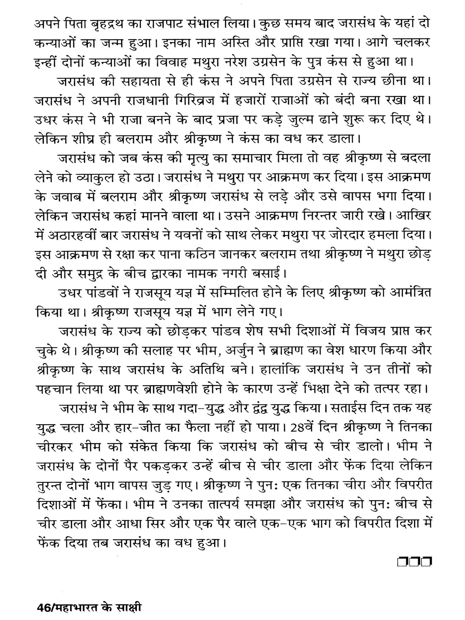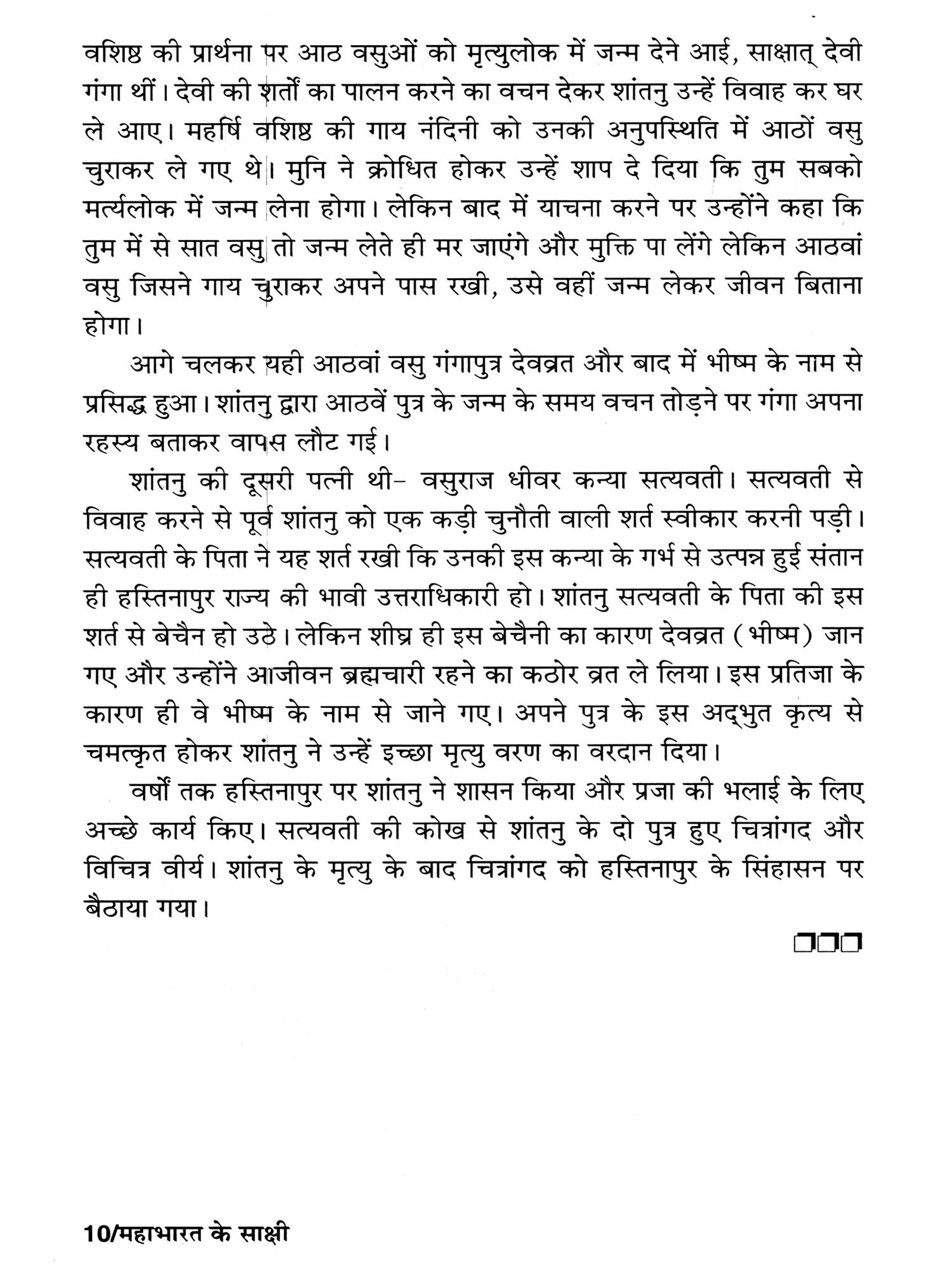 कृष्ण द्वैपायन व्यास की महाभारत कथा का आद्यन्त विषय विवेचन न सिर्फ दुष्कर कर्म है बल्कि, इसके लिए कठोर श्रम साध्य और समयबद्ध ऊर्जा की परम आवश्यकता है। इस महान् ग्रन्थ की यह विशेषता है कि इसका अध्ययन जिस दृष्टि और भाव को ध्यान में रखकर किया जाए, ठीक वैसा ही परिणाम इससे अपेक्षित है। महर्षि व्यास के मूल महाभारत से लेकर अब तक महाभारत की कथा, अन्तर्कथाओं, महाभारत के विभिन्न पर्वों, भीष्म पितामह, अर्जुन, कर्ण और युधिष्ठिर जैसे प्रमुख पात्रों पर अनेक पुस्तकें या टिकाएं लिखी जा चुकी हैं। लेकिन इस महासमर के साक्षी प्रमुख पात्रों-नायकों के अलावा सैकड़ों ऐसे जाने-अनजाने पात्र भी हैं जिनकी इस युद्ध में अपनी-अपनी महत्त्वपूर्ण भूमिका रही है। इन उपेक्षित पात्रों की भूमिका, विशिष्टताओं और घटनाओं को उजागर करने वाली समग्र पुस्तक का संभवतः अभाव है। इसी बात को दृष्टिगत रखते हुए जुलाई, 1989 से अगस्त, 1991 के बीच इतवारी पत्रिका में धारावाहिक स्तम्भ के रूप में प्रकाशित महाभारत के साक्षी विभिन्न पात्रों के विवरण को एक पुस्तक के रूप में संजोया गया है।