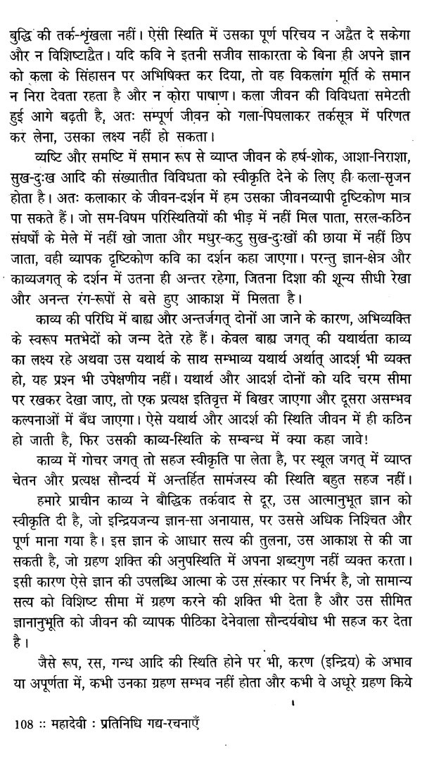 "गद्य में बड़ा लेखक होना एक बात है, और बड़ा गद्य-लेखक होना दूसरी"- यह श्री अरविन्द ने एक जगह लिखा था। आधुनिक युग की प्रमुख कवयित्री के रूप में सुविख्यात महादेवी वर्मा का परिचय तब तक पूरा नहीं होता, जब तक साहित्य का अध्येता उनके गद्य-साहित्य से परिचित नहीं हो लेता। वास्तव में यदि गद्य को ही साहित्यकार की कसौटी माना जाये तो महादेवी उस कसौटी पर शत-प्रतिशत खरी उतरती हैं। महादेवी गद्य के क्षेत्र में असाधारण सिद्धि-सम्पन्न लेखिका हैं। यह कहना अतिशयोक्ति न होगा कि पद्य की अपेक्षा वे गद्य में अधिक भावप्रवण, विचार-विदग्ध और विविधतापूर्ण हैं। महादेवी जी के गद्य का एक-एक शब्द अपने आप में एक आकृति है। अपने गद्य के माध्यम से महादेवी जी अपने युग के प्रति एक असह्य वेदना, एक व्यापक प्रतिक्रिया और एक बेचैनी अभिव्यक्त करती हैं। काव्य का सीमित कलेवर शायद उस विविधता को समेटने में असमर्थ रहा था, जिसका वह वर्णन करना चाहती थीं और जिसके लिए उन्हें एक व्यापक क्षेत्र चाहिए था जो उन्हें गद्य में मिला। प्रस्तुत संग्रह में महादेवी जी की प्रमुख गद्य-रचनाओं-अतीत के चलचित्र, स्मृति की रेखाएँ, क्षणदा, संकल्पित, साहित्यकार की आस्था, श्रृंखला की कड़ियाँ, मेरा परिवार की चुनिन्दा रचनाएँ संकलित हैं। भारतीय ज्ञानपीठ ऐसी महीयसी लेखिका-कवयित्री के इस श्रेष्ठ गद्य-संकलन को प्रकाशित कर गौरवान्वित है। पाठकों को समर्पित है पुस्तक का एक और नया संस्करण ।