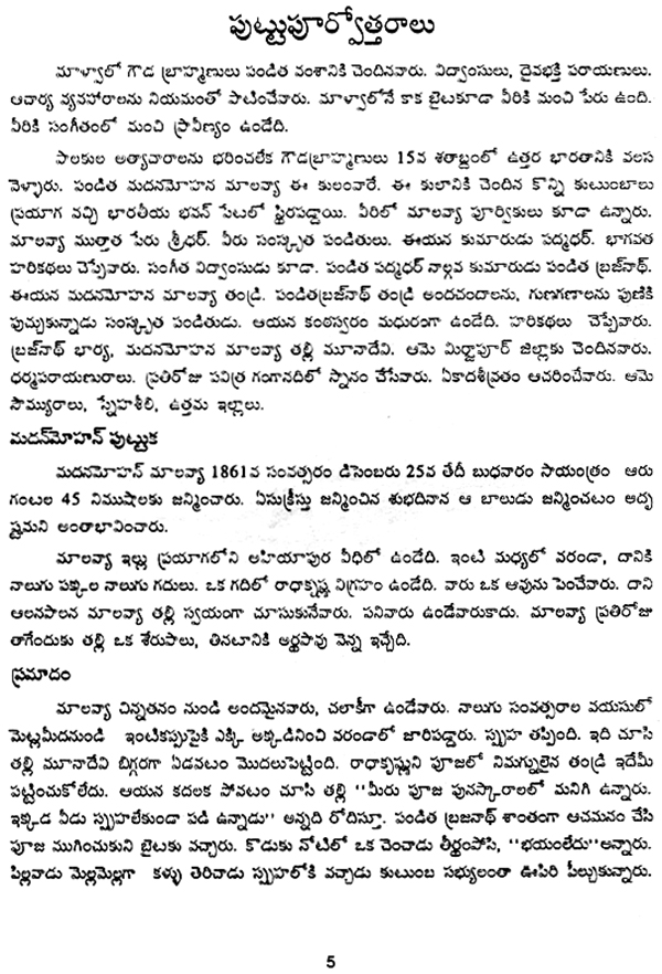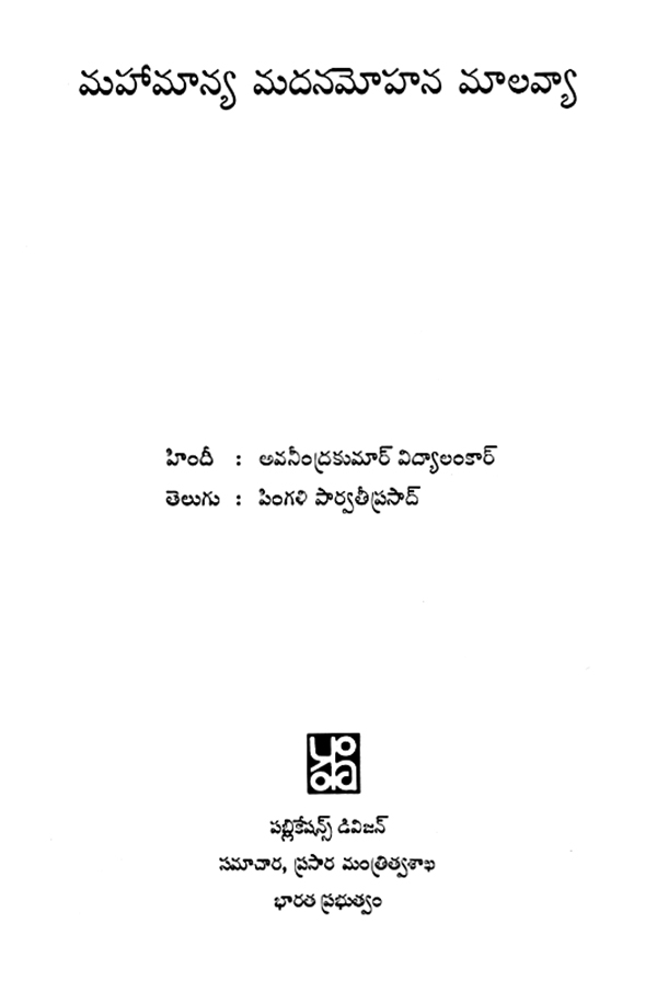 Mahamanya Madan Mohan Malaviya (1861-1946) was an eminent educationist and Sanskrit scholar who played a leading role in the freedom struggle of our country. He was an eminent lawyer, journalist and social worker who sacrificed his lucrative legal practice for taking an active part in the freedom movement. He worked untiringly for the realization of his dream of setting up the Benaras Hindu University at Varanasi. Written originally in Hindi by Shri Avanindrakumar Vidyalankar, this book is a Telugu transliteration brought out in simple language for the benefit of children and the general reader.