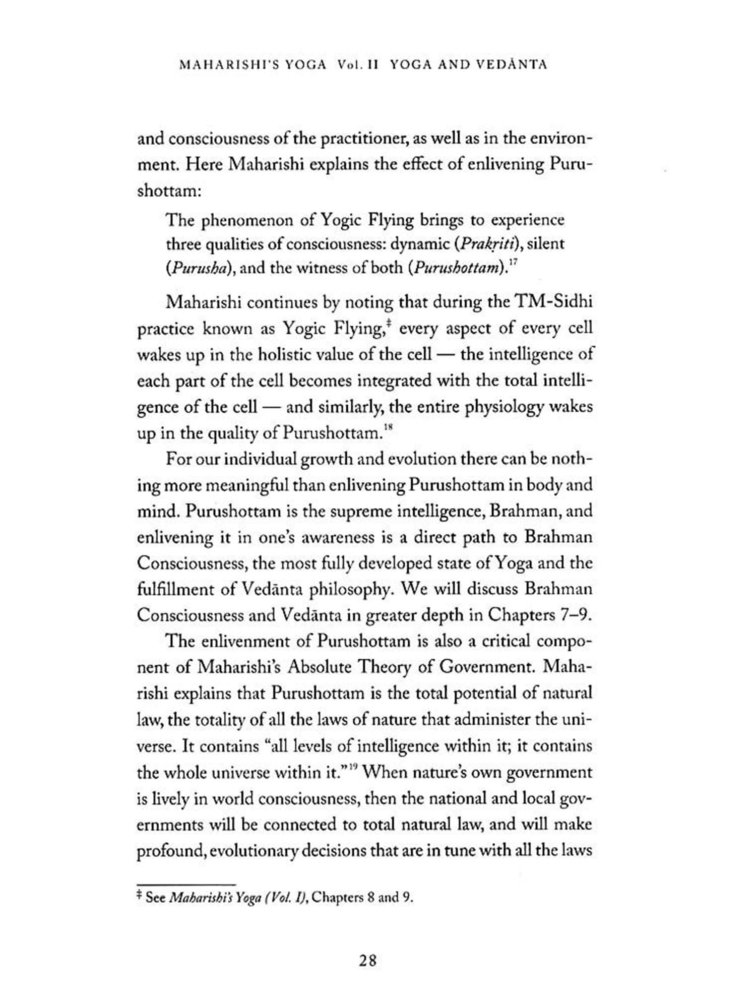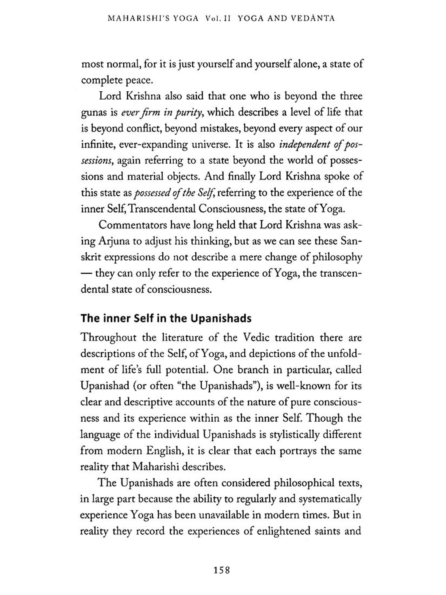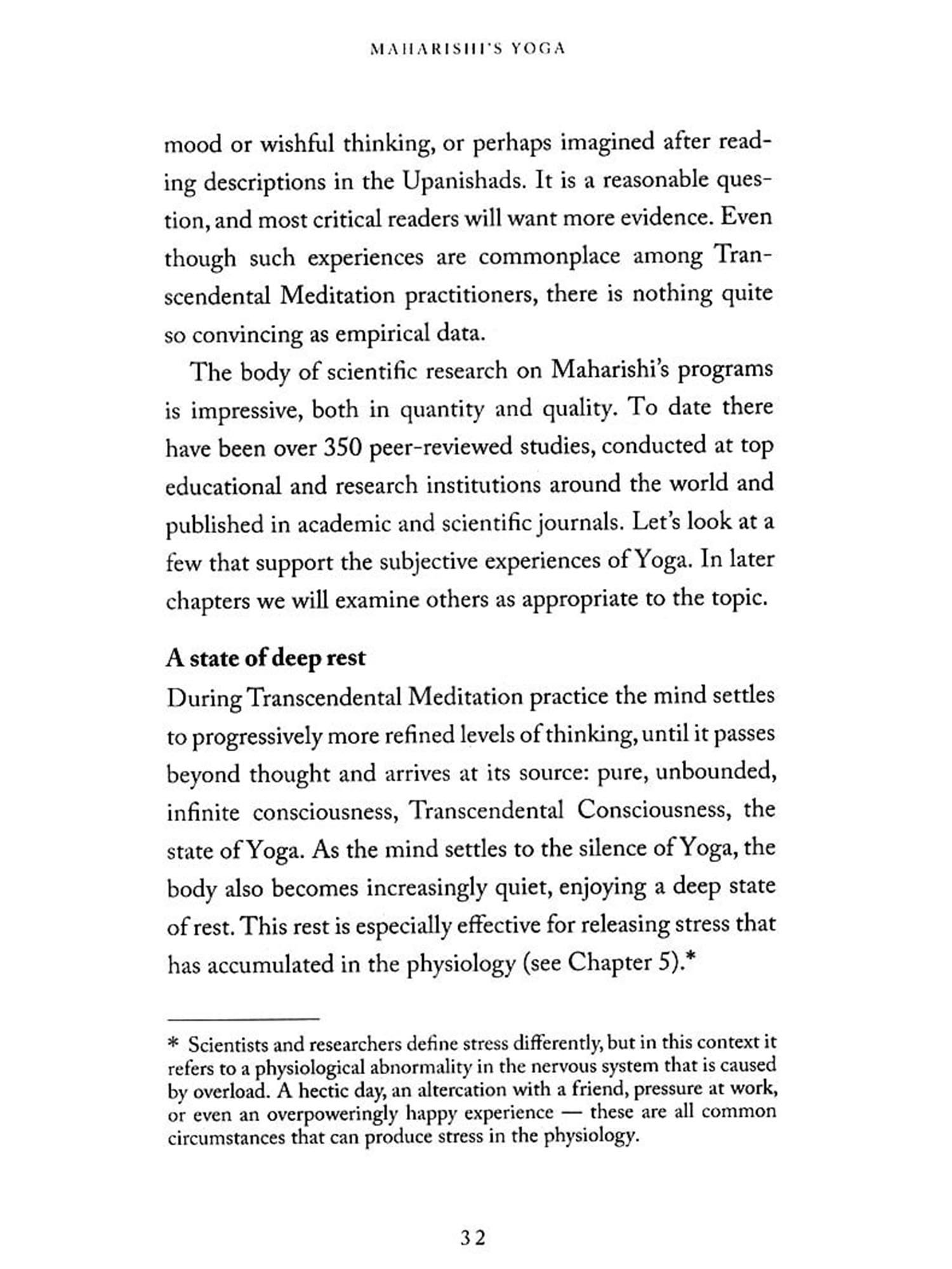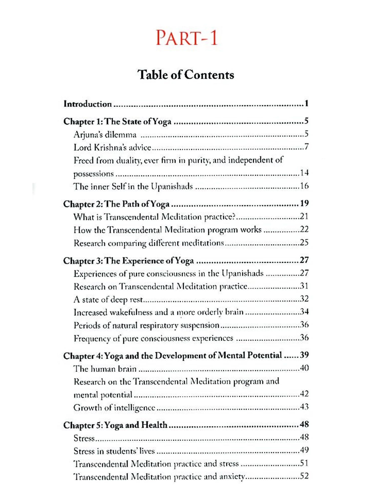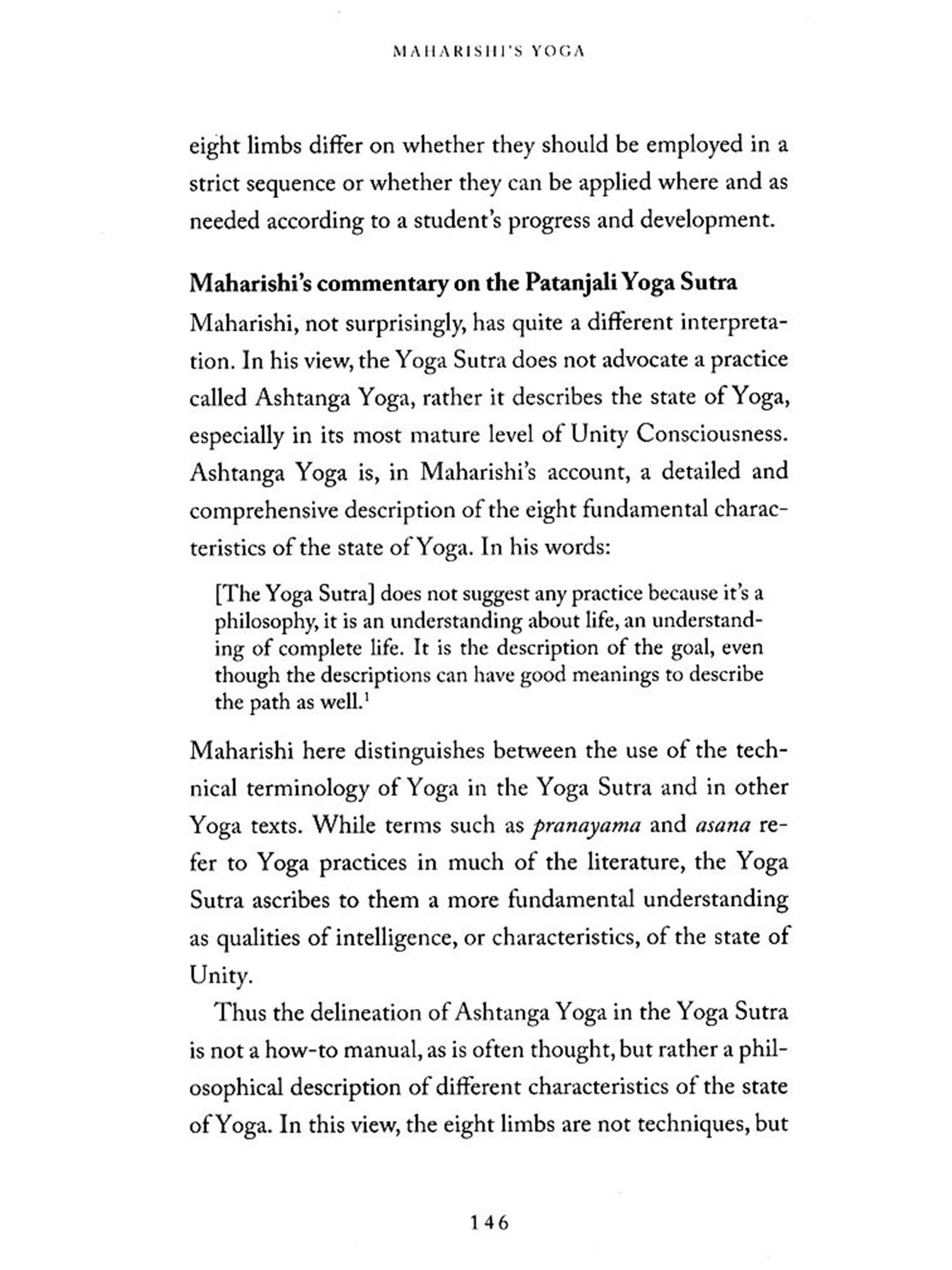 This accessible and far-reaching book explores Maharishi's teachings on yoga philosophy from multiple perspectives. It highlights yoga's profound practical benefits for individuals and societies while also addressing traditional aspects of yoga philosophy, such as siddhi performance, Karma Yoga, Jnana Yoga, Bhakti Yoga, Ashtanga Yoga, and the fulfillment of the four traditional goals of human life: Dharma, Artha, Kama and Moksha.