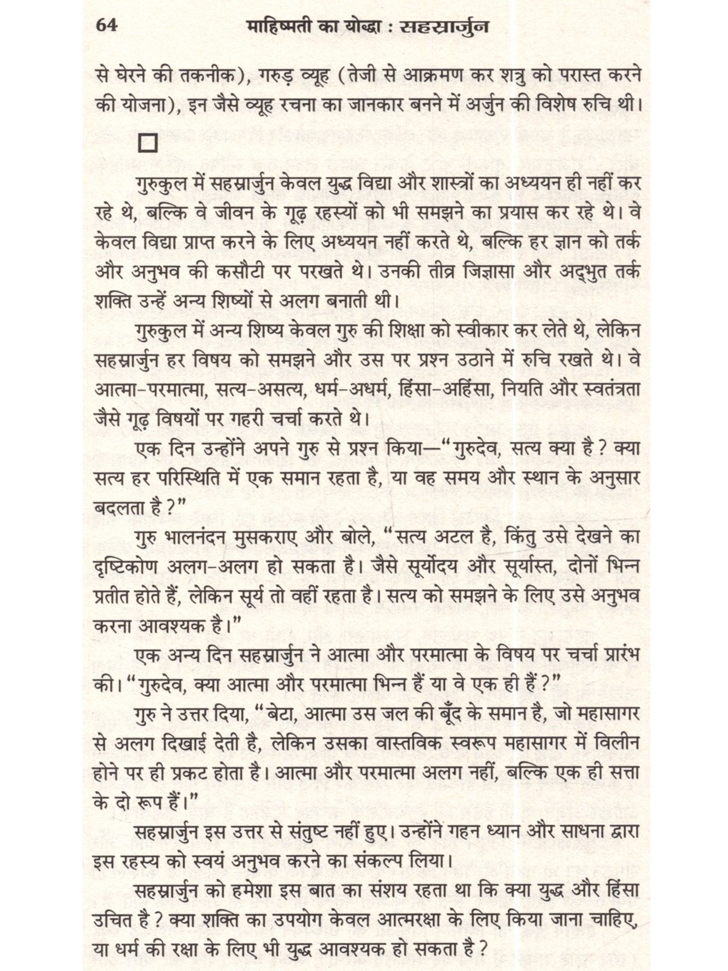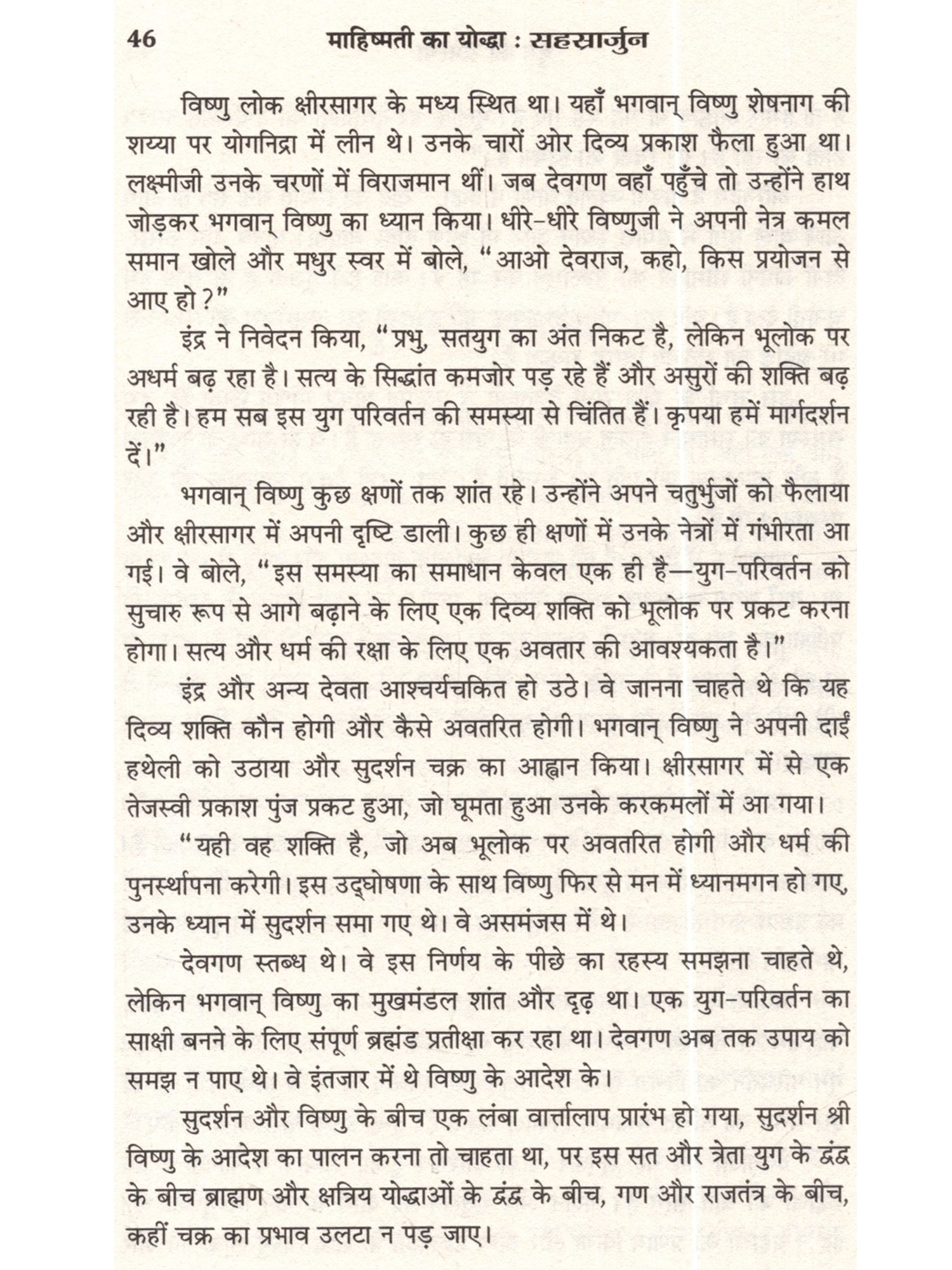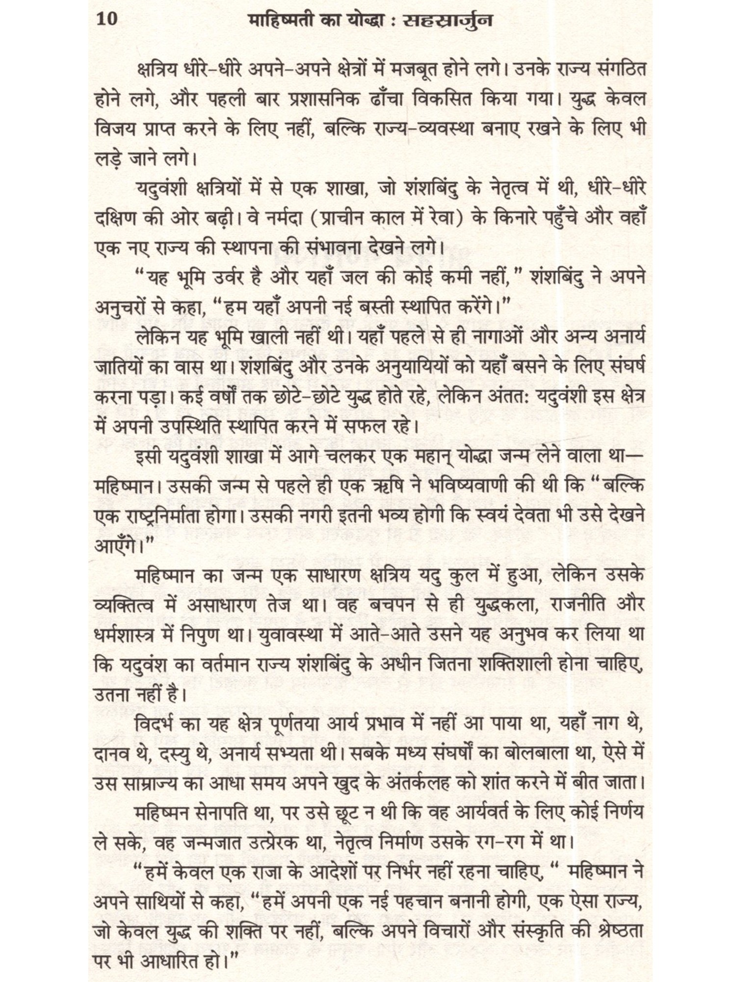 सहस्रार्जुन भारतीय रतीय पौराणिक इतिहास में अर्जुन के नाम से महाभारत के पार्थ का चरित्र आता है, पर उनसे भी पहले सतयुग और त्रेता युग के संक्रमण काल में सुदर्शन चक्र ने अवतार लिया था, जिनके हजारों हाथ चक्र की भाँति लगते थे। वो दक्षिण आर्यावर्त में माहिष्मती का राजा सहस्रबाहु अर्जुन था। ये ऐसे योद्धा थे, जिन्होंने नर्मदा तट पर राज किया और आर्य-अनार्य के बीच की खाई को मिटाने का प्रयास किया। अनार्यों के प्रति उनके उदारभाव के कारण उन्हें भार्गव ऋषियों का द्वेष झेलना पड़ा, जिसका वर्णन विष्णुपुराण, लोमहर्षिणी में मिलता है। ऋग्वेद में वर्णित दशराग्य युद्ध में इनकी निर्णायक भूमिका थी। इनके प्रजापालक, महान् शासक होने और अपार शक्तियों का वर्णन मत्स्य पुराण, श्रीमद्भगवत, लिंगपुराण, ब्रह्मवैवर्त पुराण, नारद पुराण, पद्म पुराण, रामायण, महाभारत में मिलता है।