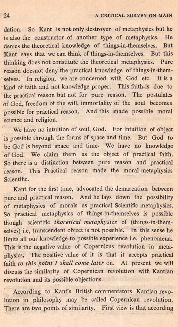 Human reason has the metaphysical questions which are imposed by the reason. We cannot avoid these questions which spring from its very nature and we cannot utter answer to these questions for transcending of human reason is impossi ble. These metaphysical questions cannot be ignored. These problems are of three kinds namely problems of God, problem about self and of the whole universe. These are the three subjects of metaphysics. Traditional three parts are included in metaphysics' Rational theology, Rational psychology and Rational cosmology. Rational theology is that branch of philosophy which is concerned with the problem about God. Rational psychology involves the problem of self and Rational cosmology involves the problem of cosmos. Metaphysics is a study of the Absolute. But what is abso-lute must be unconditioned, otherwise it would be relative to certain other conditions. So it is a study of the unconditioned reality. God is taken to be unconditioned reality of all actual possi-ble thing, for these depend upon God while God is indepen-dent of all things. These are raised by reason. We have reason which does not satisfy us with the conditioned and rela-tive and give rise an urge of knowing the unconditioned and the Absolute. So we are hankering after the unconditioned and the Absolute and give explanation after explanation. For our ordinary explanations are the same in terms of the condi-tioned condition. When we get explanation in terms of uncon-ditioned condition, give permanent satisfaction and we stop there. God is the condition of all things and we stop here for it can not be explained by virture of other conditions. Reason is a search for-unconditioned, so it gives rise to metaphysic which deals with the unconditioned. That is why Kant says metaphysics are prescribed by reason itself. So we cannot ignore these questions, then we have to ignore our reason. But these questions cannot be answered by us, because they transcend our reason faculty. We cannot know the uncondi tioned things. Human reason takes place when there are certain conditions c.g. known and knowable objects are condi. tioned and unconditioned objects are unanswerable. Human reason is burdened with metaphysical questions, but the answer of it is beyond human reason. So there is a sense in which metaphysics is possible, for if it is not possible altogether, why our reason are burdened by metaphysical questions? Again, there is a sense in which metaphysics is impossible for metaphysical questions are unanswerable. So the problem in what sense metaphysics is possible and in what sense it is impossible is a great problem for philosophers to which Kant wants to offer solution. According to Kant philosophy in the sense of transcendence is impossible and in the sense of emanence is possible. In this sense the philosophy of Descartes, spinoza and Leibnitz etc. are impossible for they are concerned with transcendental entities and our reason cannot transcend itself. But the emanent philosophy which was started from Kant may give some answers out of which our reason can be satisfied Metaphysics became the battlefield of endless controversies. Why it becomes endless? Because it uncritically extends the concepts and principles beyond the range of experience. These concepts and principles of causality, substance or existance etc. are applied in two senses i.e. the transcendental application and the immanent application. When these concepts and principles are applied beyond the range of experience, it means the trans-cendental application i.e, God is the cause of the world. But when these concepts and principles are applied within experience this means immanent application e.g. The table exists' or 'Table is a substance', or 'wood is the cause of the table,' etc.