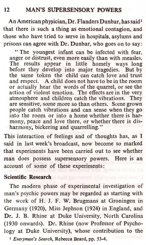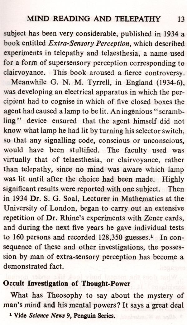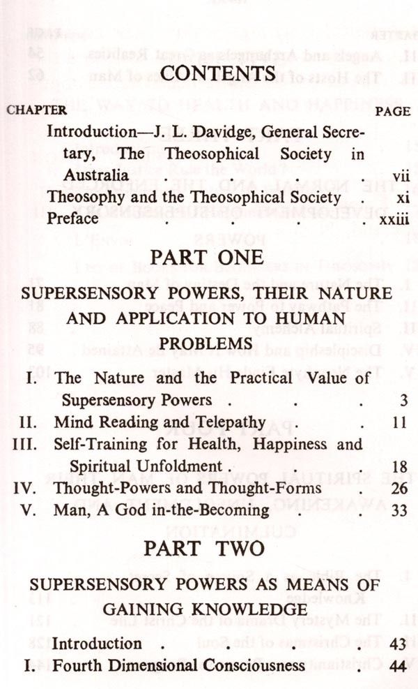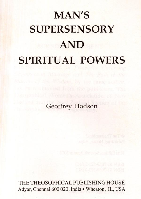 THIS book is the second Volume of Talks which Mr. Hodson broadcast from Station 2GB, Sydney, during his 1952 tour of Aus-tralia under the auspices of the Theosoph-ical Society. The title of this book-Man's Supersensory and Spiritual Powers-connotes not only a field in which Mr. Hodson is con-tinually working, but also that before the Theosophical Society as indicated in its Third Object: "To investigate unexplained laws of Nature and the powers latent in man." Research in supersensory, or extra-sensory, perception has made rapid progress in the last ten years, as these Talks imply, and what is now needed to extend and authenticate it is intensive clairvoyant investigation, beyond the limits of physical sight, into the inner constitution of man and of the universe around him. The trend is already seen in contemporary literature, in coloured plates depicting thought-forms and human auras, in the important revelations of occult chemistry regarding the nature of the atom and the constitution of matter, in the reading of the memory of Nature in prehistoric archaeolo-gies and civilisations, and in the reports by Initiated Seers on the origin and evolution of the Cosmos to which we belong. All this increase of knowledge is due to the use of powers of perception above the normal, yet powers which are unfolding in every one of us. This book shows the working of these powers and some of its fruits. Each Chapter of the book is a complete Radio Talk. The broadcasts on Telepathy, on The Path of Discipleship and on The Angelic Hosts set the keynote of the book. In full-length form, the Talk on Christianity as a Power for Progress was delivered as the Convention Lecture in Adelaide in April, 1952. A group of three broadcasts on The Life Which Begins After Death has been omit-ted and has formed the basis of another book entitled Through the Gateway of Death, (T.P.H., Adyar, Madras, India). Mr. Hod-son has added two Talks on The Principles.
