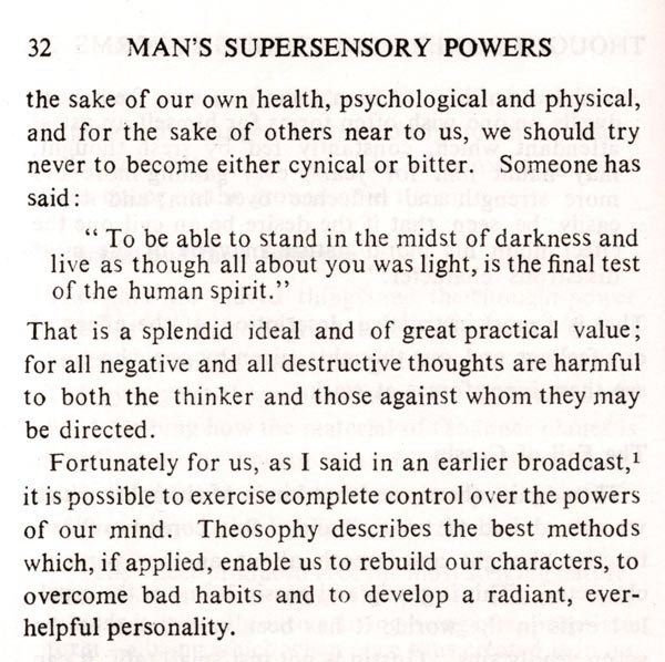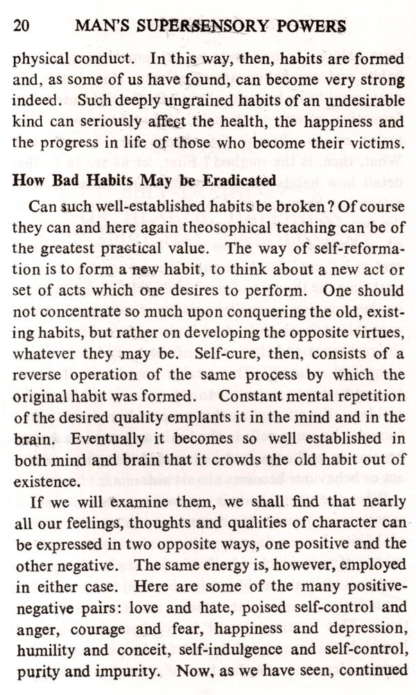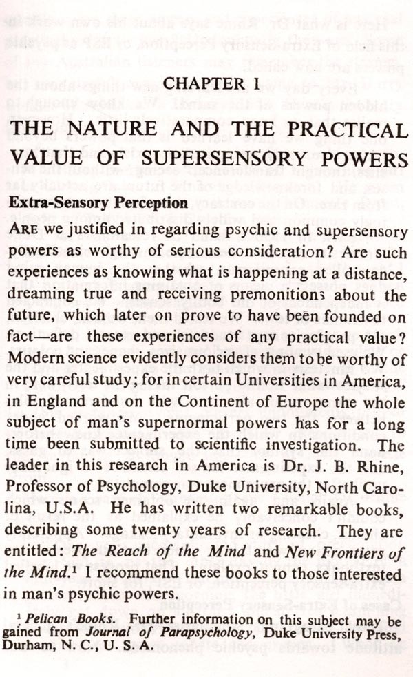 Man undoubtedly possesses, in however rudimentary a form, certain supersensory powers. Their unfoldment can be hastened through Raja Yoga as the chief means. Included in this volume are talks by the author broadcast over the air in Australia. They are a guide to managing human life and developing the character needed for such unfoldment. However it is not the development of psychic powers that is man's supreme goal, but Self-realization. Psychic powers are only by-products in the spiritual process of seeking Realization and are not ends in themselves.