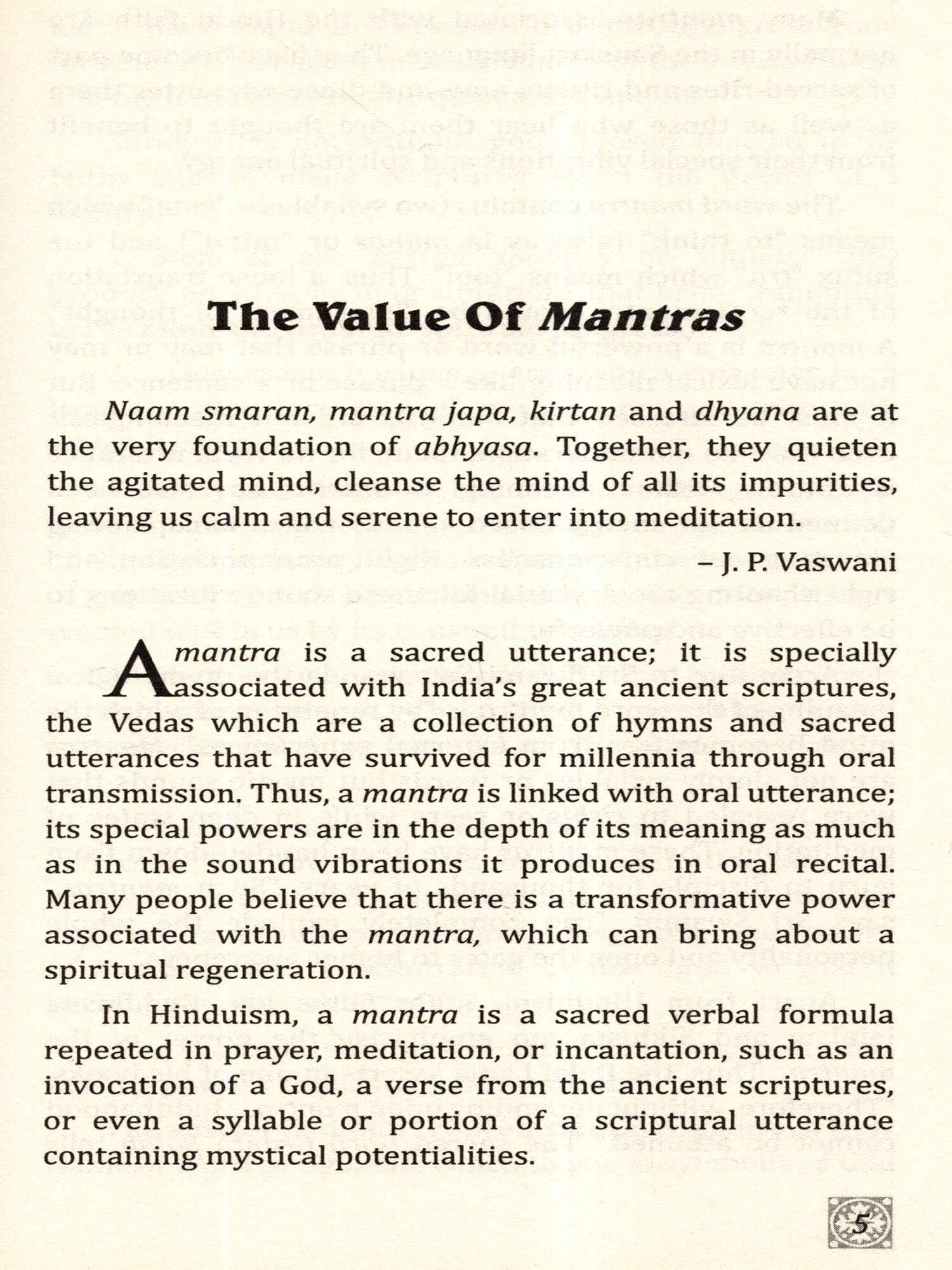 For too long, taboos and restrictions have made the lay person, the ordinary individual and the uninitiated seeker slightly wary of this potent talisman that has been left for our benefit by the ancient rishis of India. Rev. Dada J. P. Vaswani demystifies mantras of their abstraction and esoteric aspects and brings them closer to us for our use.