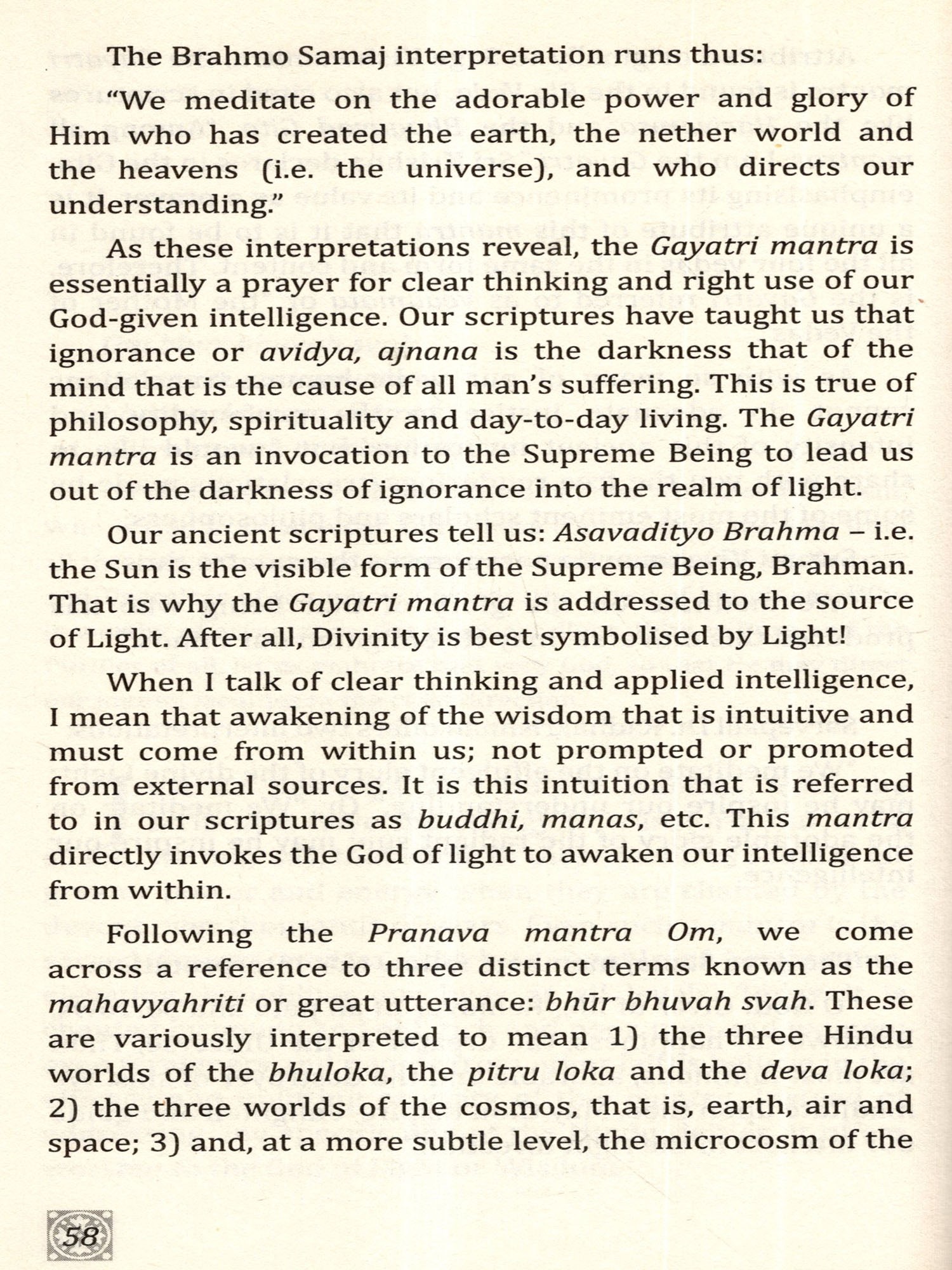 2. The secure feeling of linking up with a power that is higher than us; the mature perspective that we have our place in the vast cosmic order that is controlled like a Divine clockwork 3. The power to conquer negative thinking and lower sense-desires.