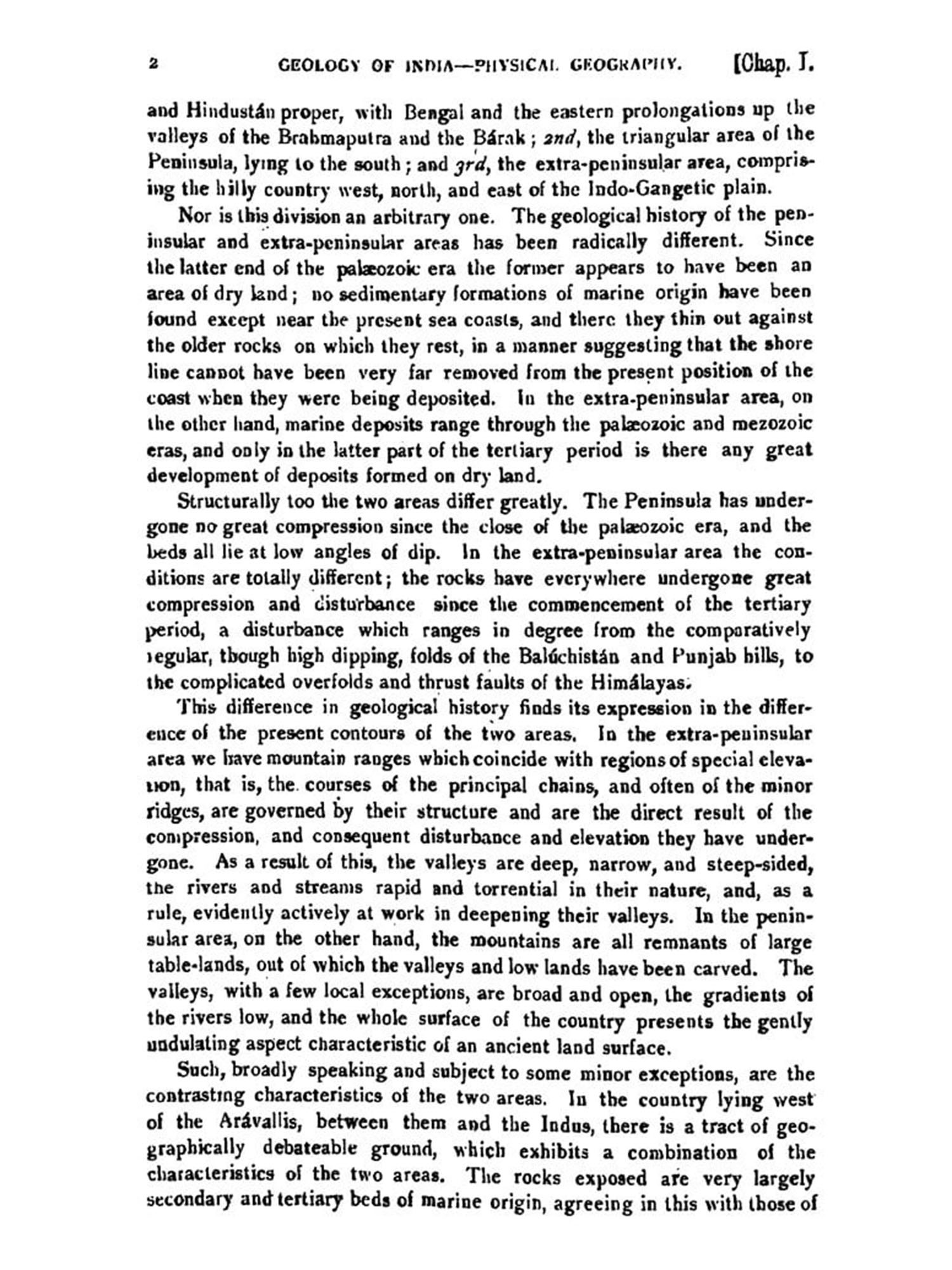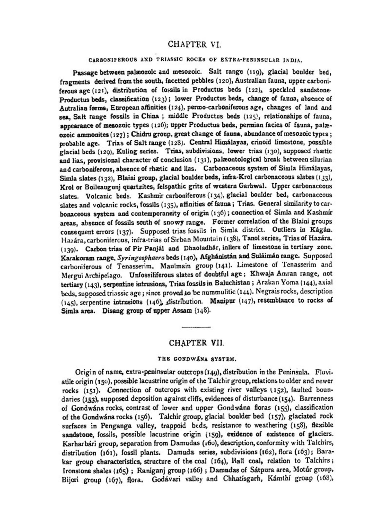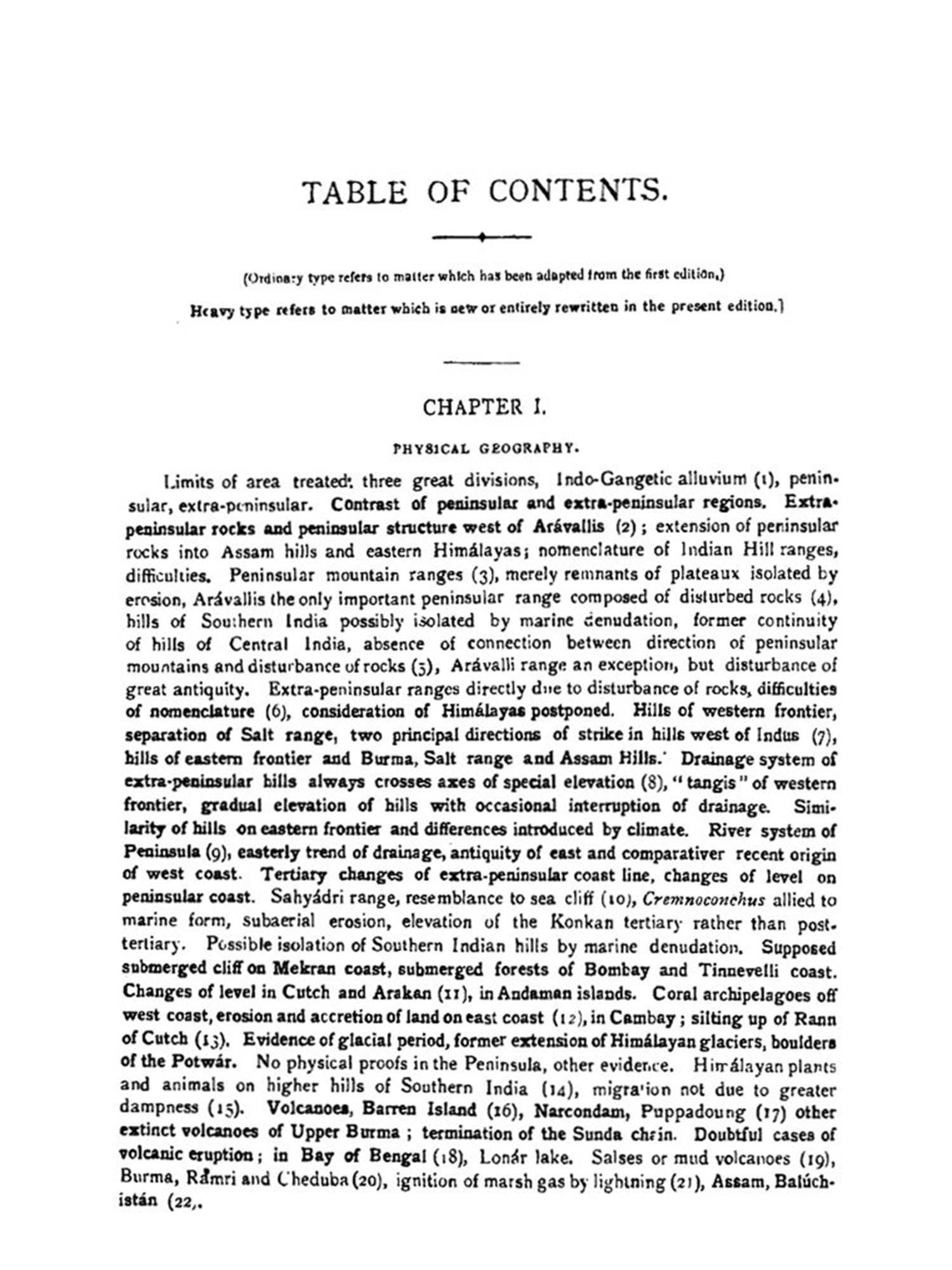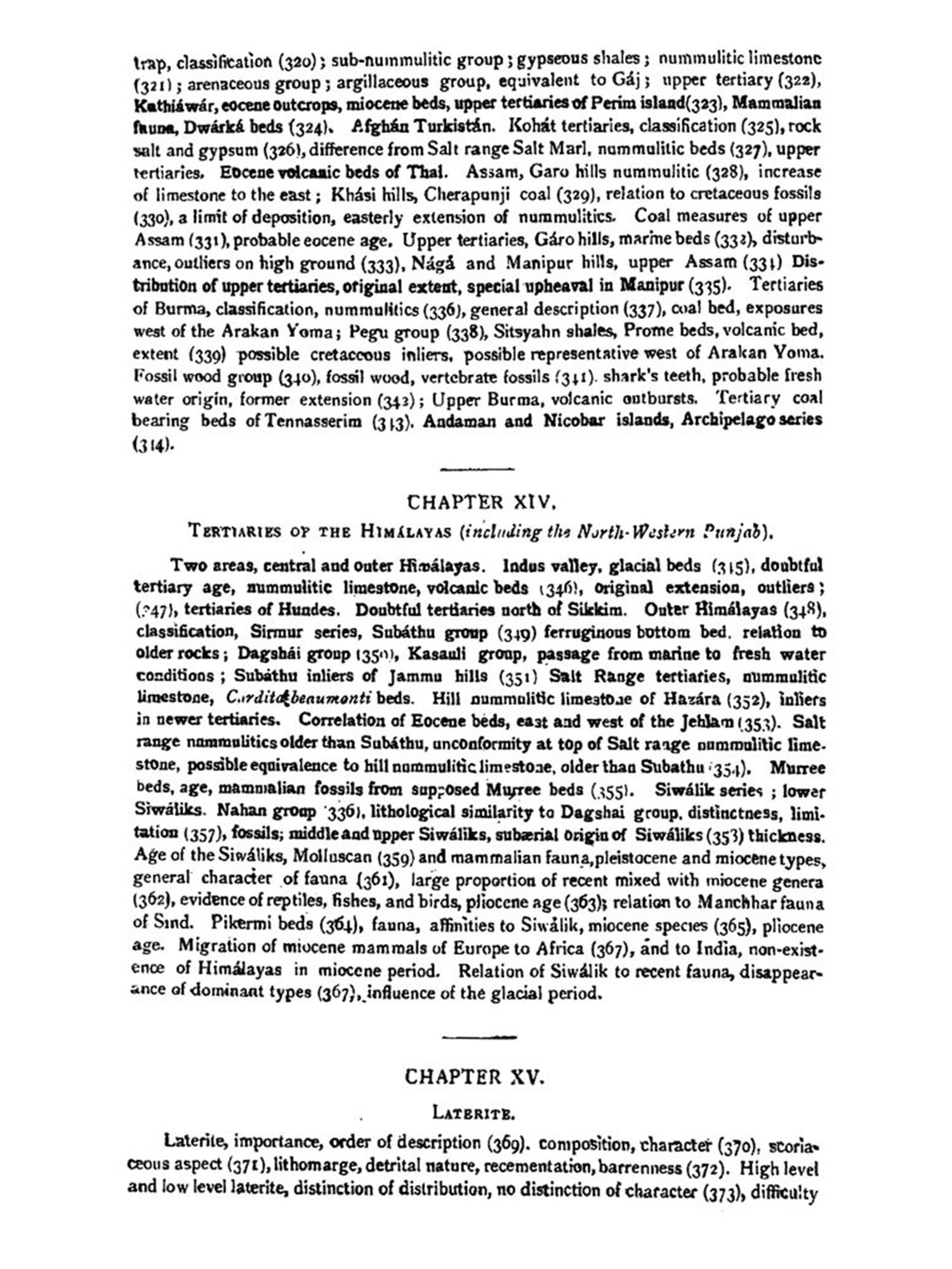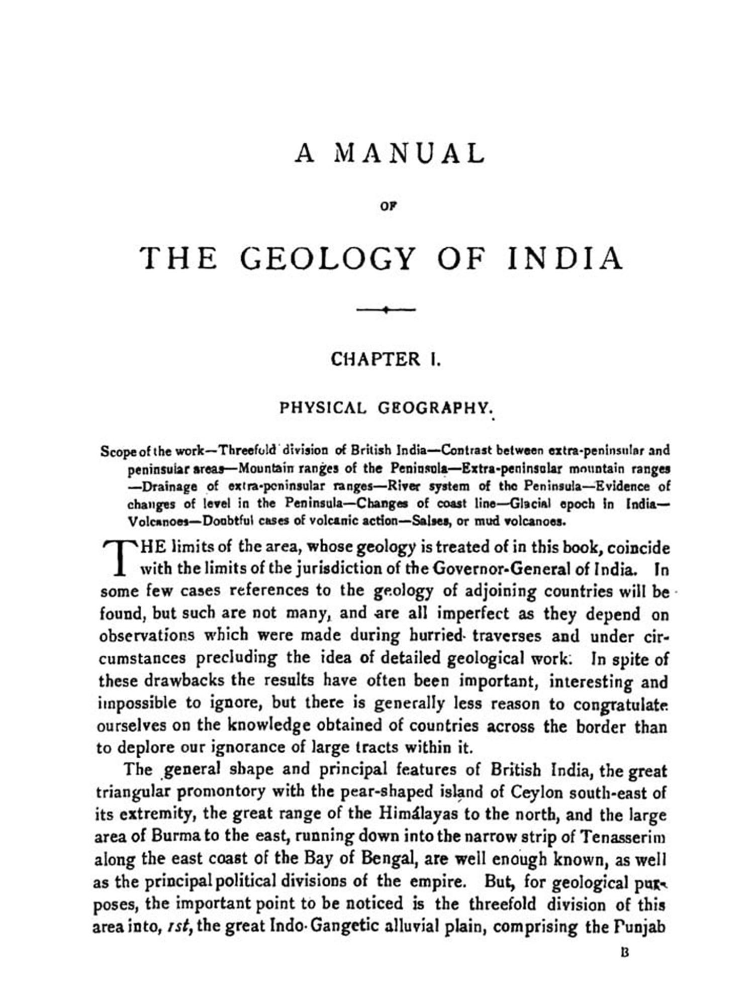 THE first edition of the Manual of the Geology of India was found to sup-ply a want so much felt that it soon went out of print, and for several years has only been procurable from the dealers in second-hand books. It had, besides, become out of date in many parts, and the Government of India decided that the time had come for the preparation of a new edition. So great have been the strides made in our knowledge of Indian Geology in the last fifteen years that it has been found possible to entirely change the arrangement of the book and to adopt the more scientific and orderly course of describing the rocks in chronological order, instead of breaking the book up into a series of descriptions of separate districts, as was found to be inevitable in the preparation of the first edition. There is not, unfortunately, everywhere the same certainty regarding the proper position in a chronological arrangement of particular groups of beds. Frequently the true homotaxis is unknown, and there is a conspicu-ous instance of the mistakes which may then be made, in certain rocks of the Arakan Yoma, which were supposed to be triassic at the date when this second edition was written, but have been shown to be eocene as the pages were passing through the press, and consequently rocks which should have been classed with the tertiary were described in the chapter devoted to the carboniferous and trias. Many districts have remained untouched since the publication of the first edition, and in all such cases, and wherever indeed no serious modifications of the original text have been necessary, it has been allowed to stand practically as in the original publication. All these passages have been carefully revised and generally more or less condensed, while many minor alterations needful to adapt them to the altered scope and arrangement of the work have been made, as well as such alterations as have been neces-sary on account of the advance of our knowledge. In the table of contents the portions in which the first edition has been taken as the basis of the text are distinguished by a different type from that which refers to the portions which are new or have been entirely re-written.