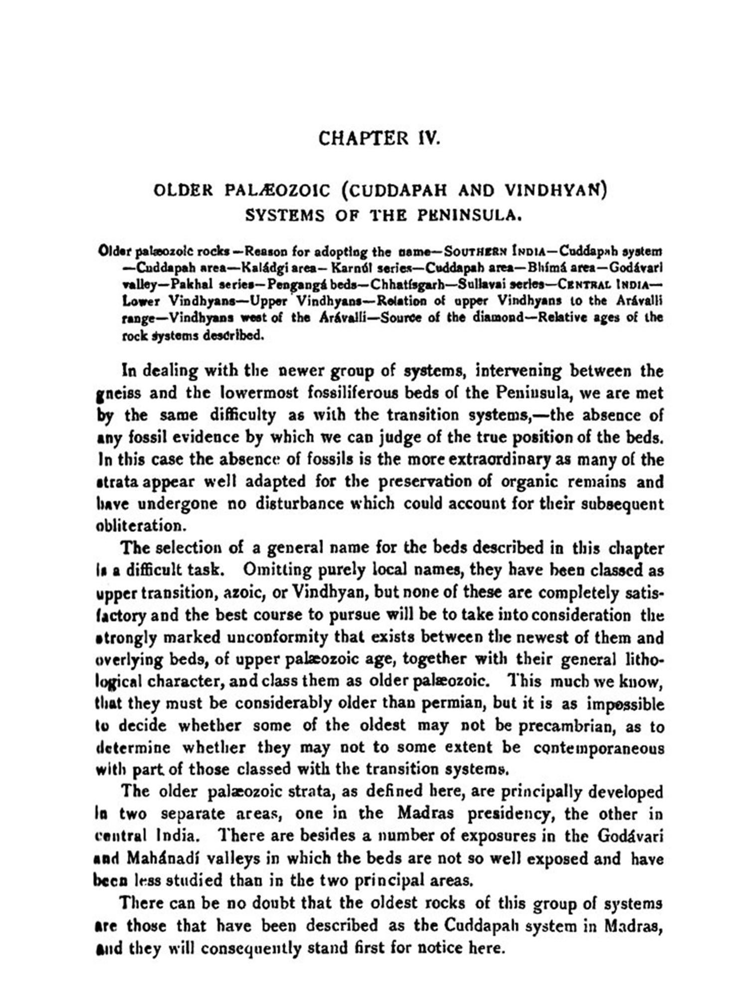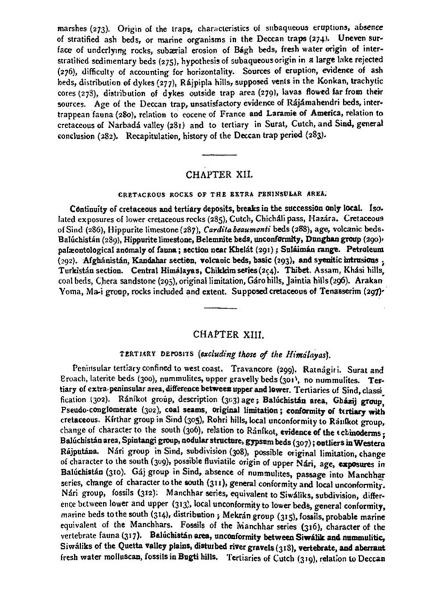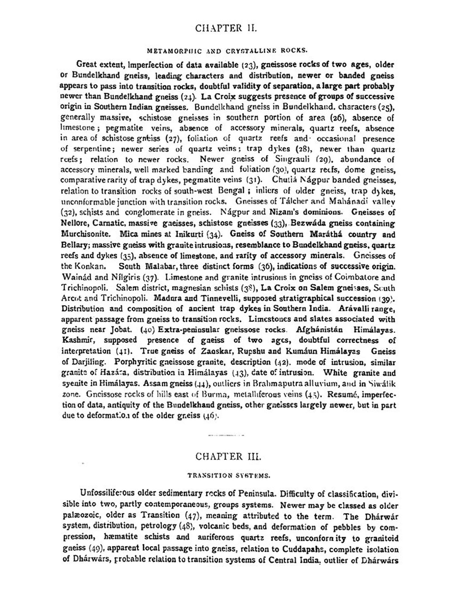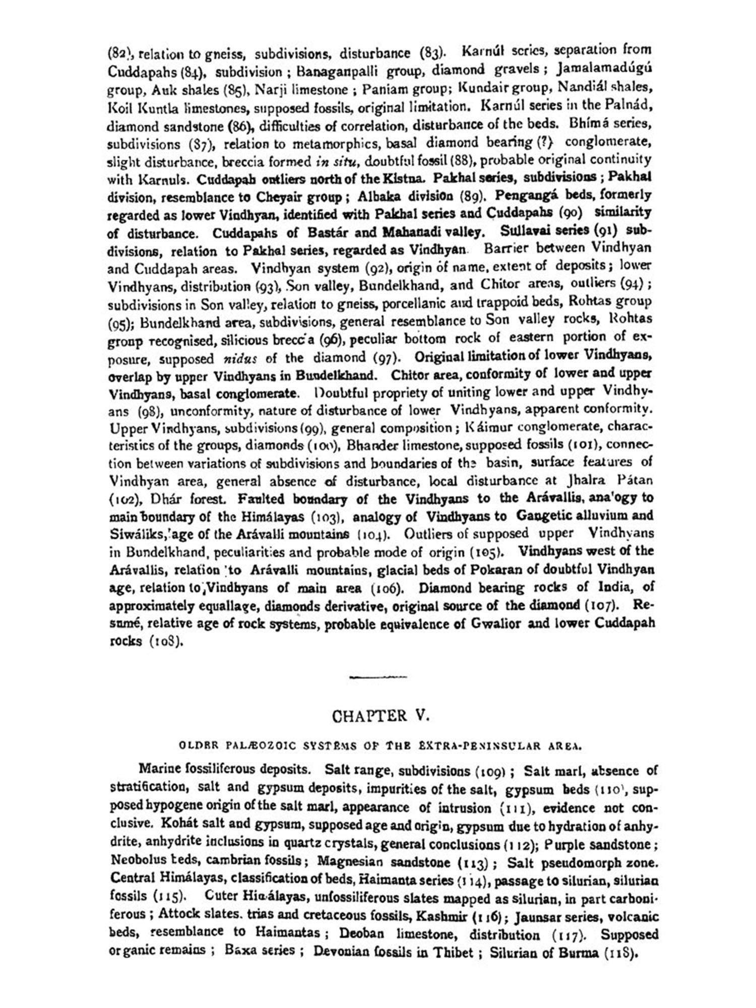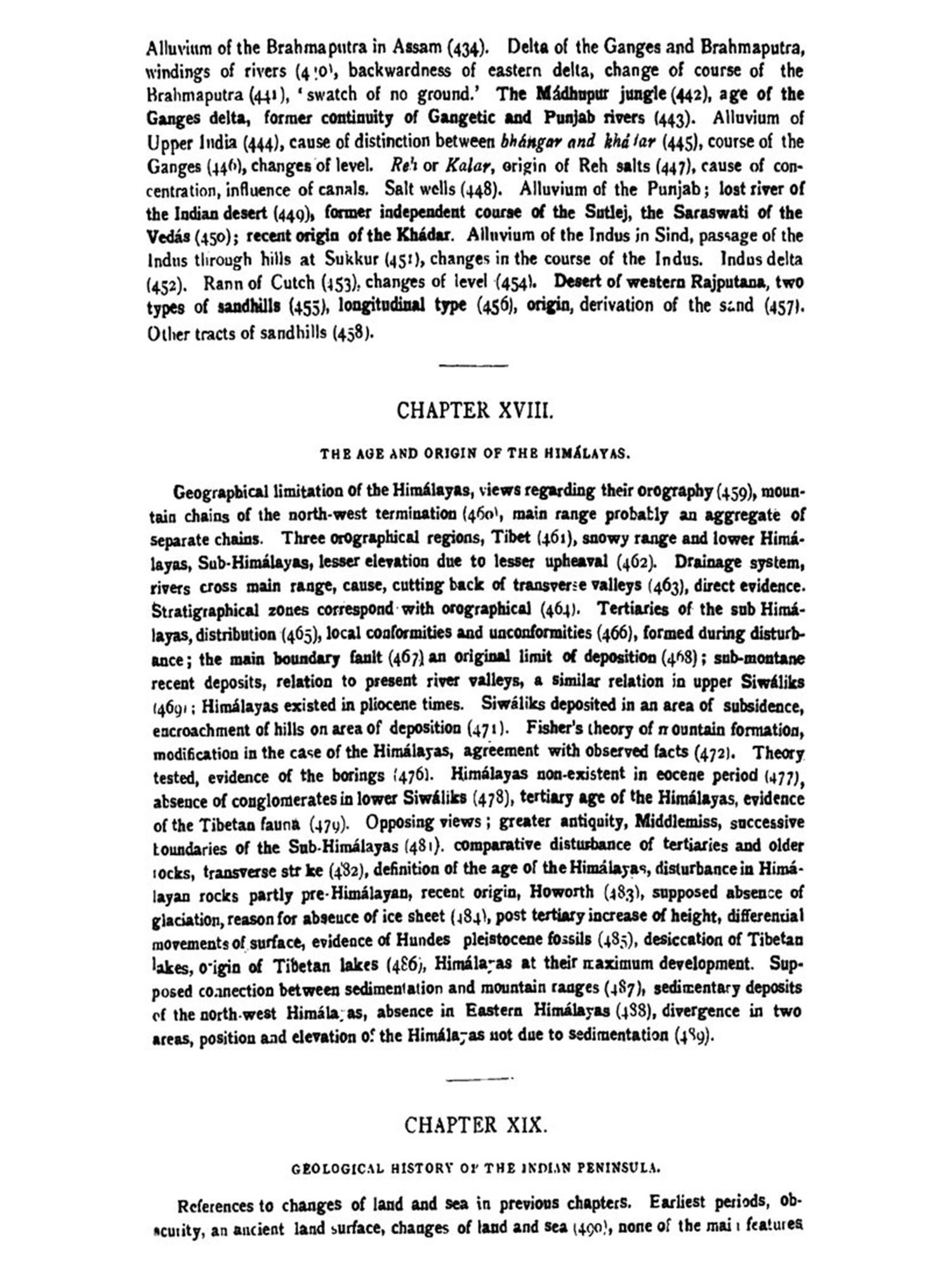 THE first edition of the Manual of the Geology of India was found to sup-ply a want so much felt that it soon went out of print, and for several years has only been procurable from the dealers in second-hand books. It had, besides, become out of date in many parts, and the Government of India decided that the time had come for the preparation of a new edition. So great have been the strides made in our knowledge of Indian Geology in the last fifteen years that it has been found possible to entirely change the arrangement of the book and to adopt the more scientific and orderly course of describing the rocks in chronological order, instead of breaking the book up into a series of descriptions of separate districts, as was found to be inevitable in the preparation of the first edition. There is not, unfortunately, everywhere the same certainty regarding the proper position in a chronological arrangement of particular groups of beds. Frequently the true homotaxis is unknown, and there is a conspicu-ous instance of the mistakes which may then be made, in certain rocks of the Arakan Yoma, which were supposed to be triassic at the date when this second edition was written, but have been shown to be eocene as the pages were passing through the press, and consequently rocks which should have been classed with the tertiary were described in the chapter devoted to the carboniferous and trias. Many districts have remained untouched since the publication of the first edition, and in all such cases, and wherever indeed no serious modifications of the original text have been necessary, it has been allowed to stand practically as in the original publication. All these passages have been carefully revised and generally more or less condensed, while many minor alterations needful to adapt them to the altered scope and arrangement of the work have been made, as well as such alterations as have been neces-sary on account of the advance of our knowledge. In the table of contents the portions in which the first edition has been taken as the basis of the text are distinguished by a different type from that which refers to the portions which are new or have been entirely re-written.