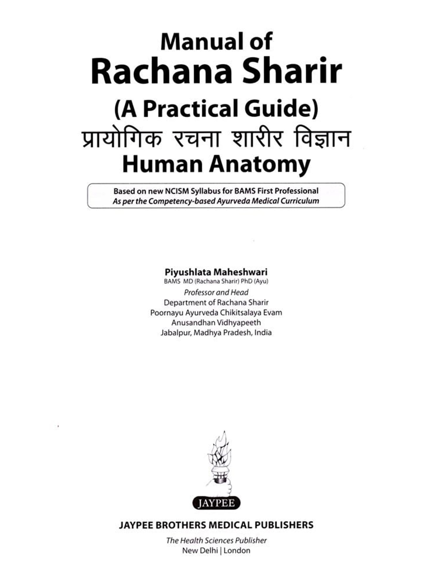 Rachana Sharir is a specified field of Ayurveda. It lays the foundation of basic Ayurveda studies and helps the students to understand and clinically correlate the formation and structure of human body. To develop the interest of a student, a practical approach is needed in this subject. Since a long time, the students of Ayurveda were writing the Practical and drawing diagrams in Practical Notebooks or using Modern Anatomy Practical books which are designed for the MBBS syllabus. In fact, there was a lacuna regarding A Practice Manual of Rachana Sharir, covering the complete syllabus according to the New NCISM Curriculum. I have tried to make an approach toward it.