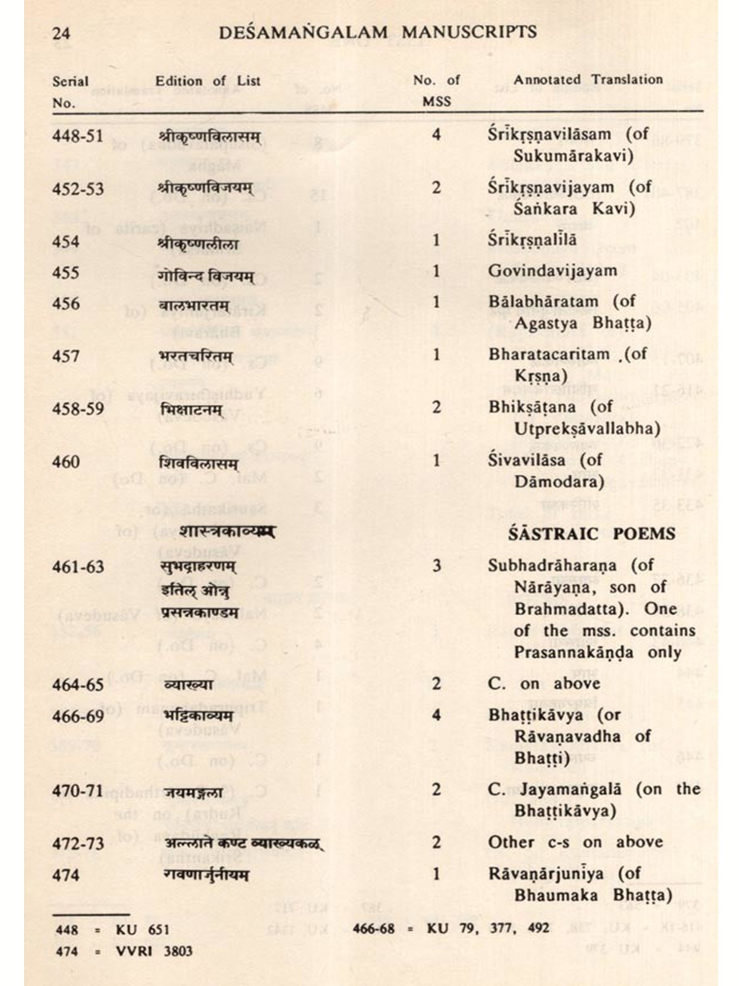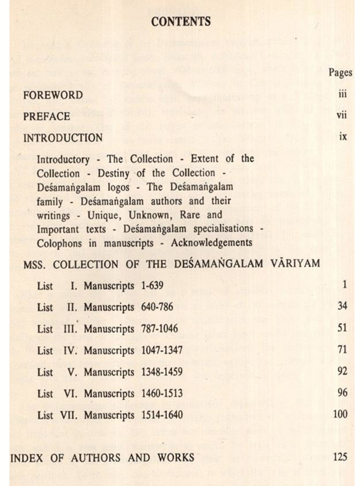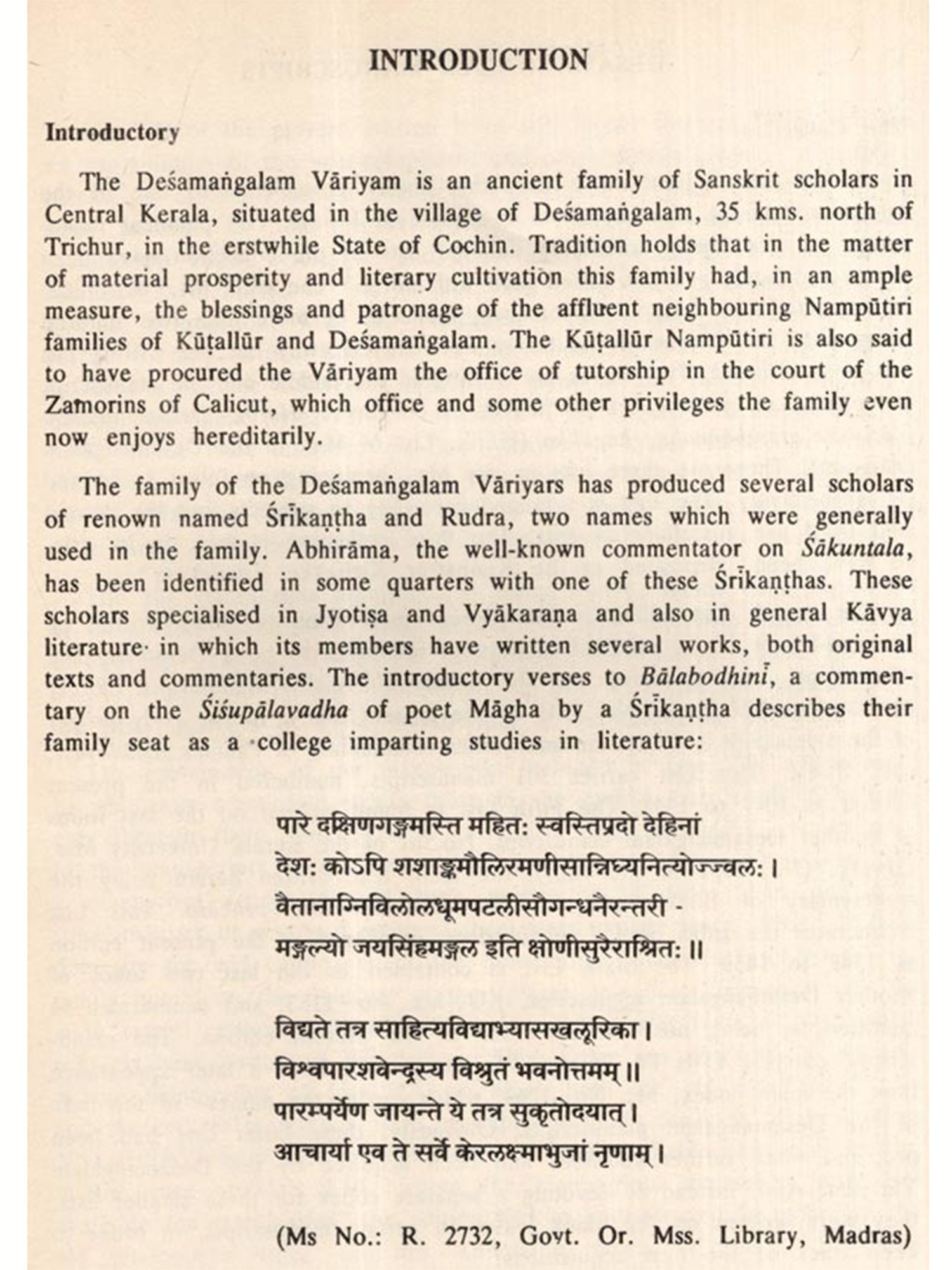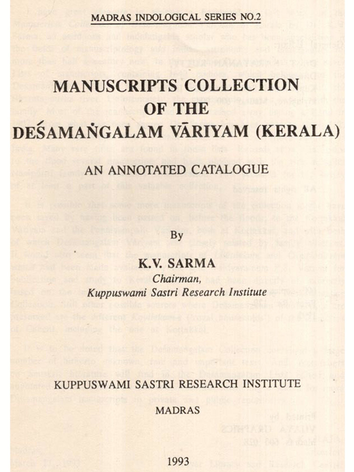 Manuscripts Collection of the Desamangalam Variyam, published as No. 2 of the Madras Indological Series, forms an 'Annotated Catalogue of 1640 palmleaf manuscripts, carrying about 5000 to 6000 texts, which belonged to the scholarly family of Desamangalam Variyam in Central Kerala. The Variyam had, during the Middle Ages, been functioning as a 'College of learning (Vidyabhyasa khalurika), specialising in grammar and the belles lettres in Sanskrit. One of the largest private libraries of Kerala, this manuscripts collection is no more intact in the Väriyam. Most of the manuscripts have been lost and much of the rest have disintegrated. Dr. K.V. Sarma, the indefatigable manuscriptologist, has, however, been able to recover six old Lists of the collection and has added one of his own, and has edited these Lists with a highly useful annotatory translation. These annotations relate to four matters, viz., (i) Ascertainment of the full titles of the texts included in the Lists, but given only in summarised or abbreviated forms in the lists or inscribed on the flyleaves; (ii) identifying the authors; (iii) supplying relevant correlatory details in the case of commentaries; and (iv) indicating the subjects of the several texts.