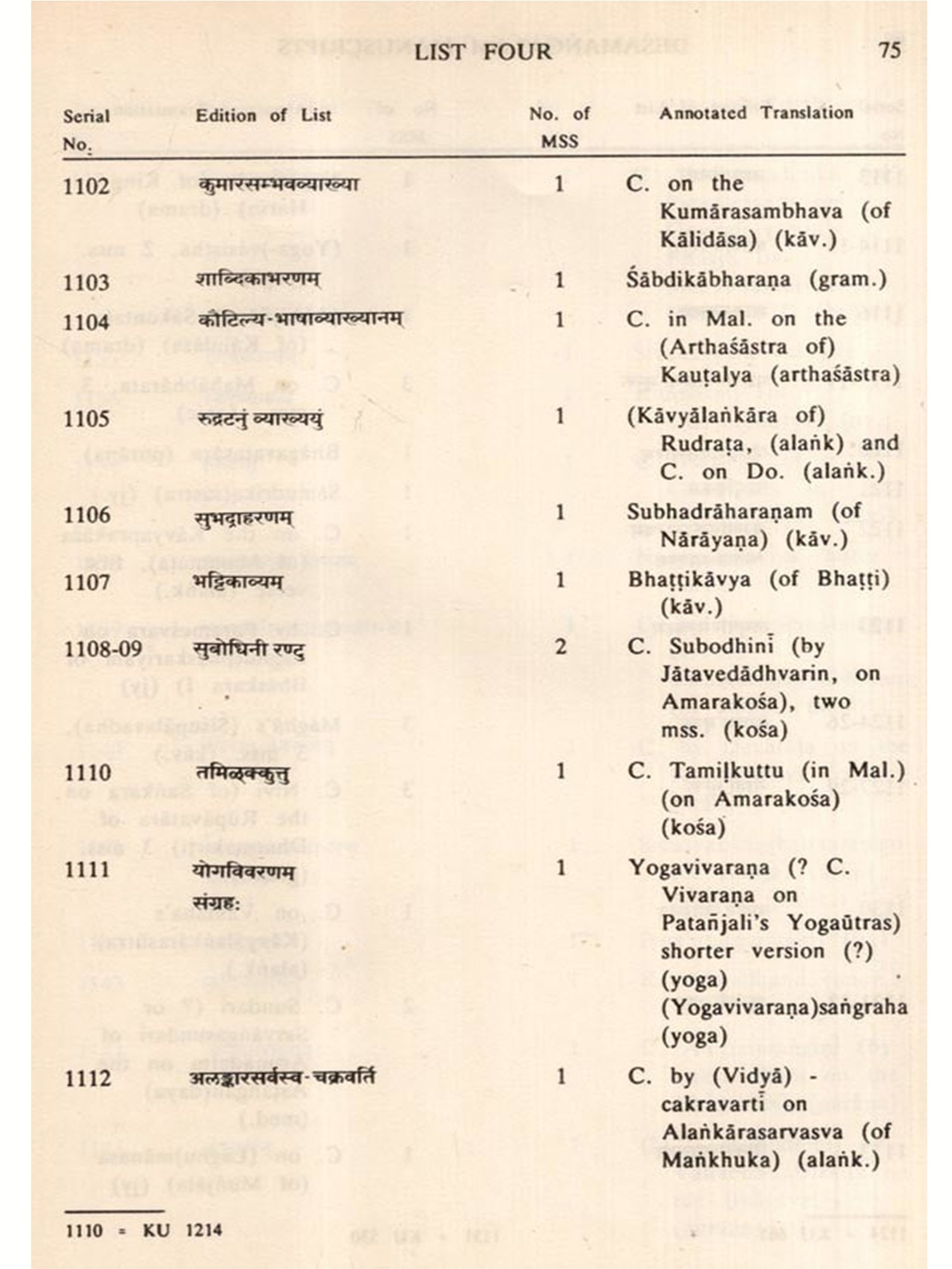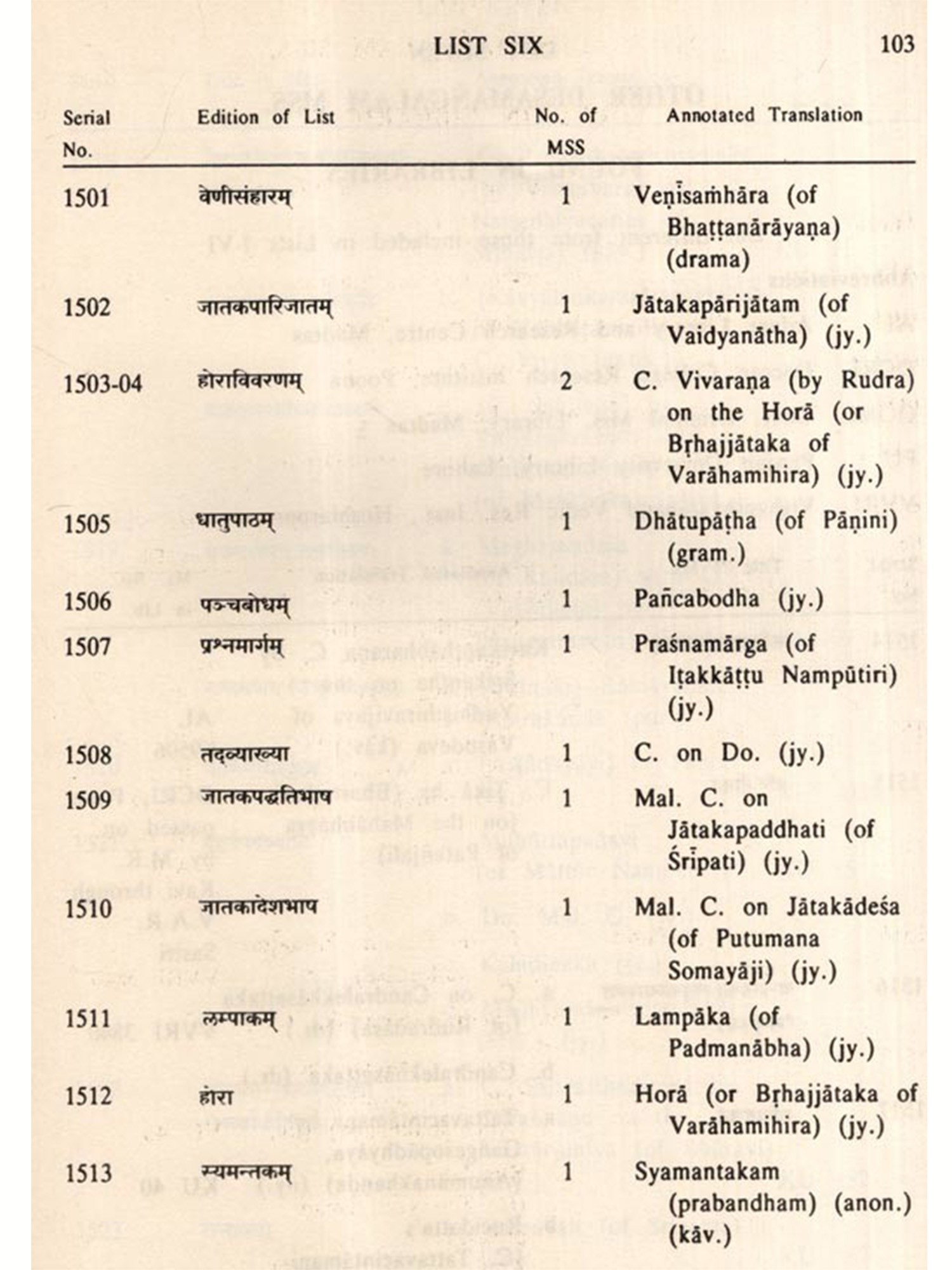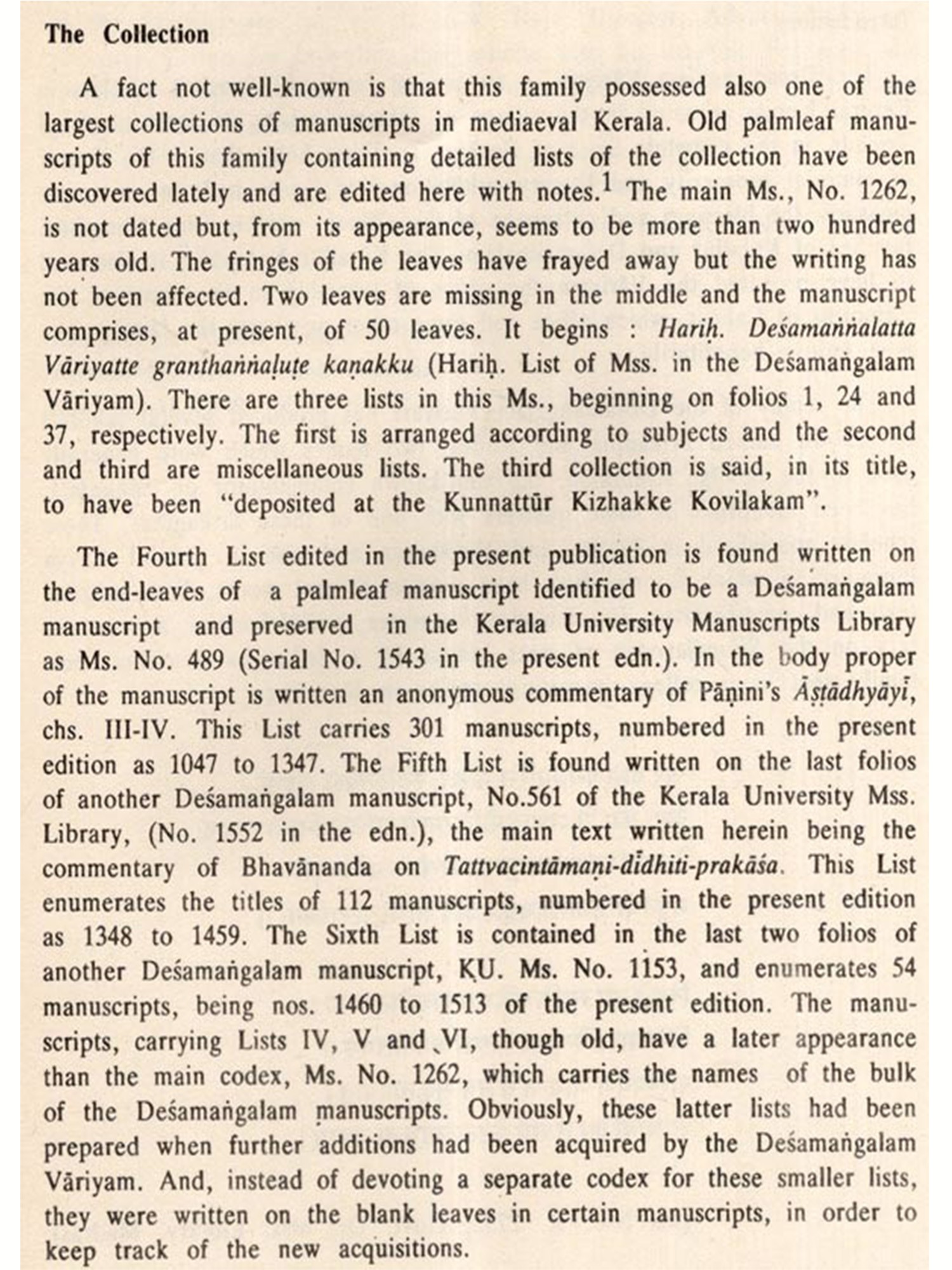 The Desamangalam Collection is particularly important, in that it had contained manuscripts of a number of hitherto unknown texts besides unique and important manuscripts. Dr. Sarma has identified some of the important texts and it is very much worthwhile to search for texts whose titles are made known by the Desamangalam lists, while the manuscripts themselves have perished. To be sure, one of the uses to which the present Catalogue can be put to would be to look for, in extant collections, manuscripts of the said rare and important texts, for study and research.