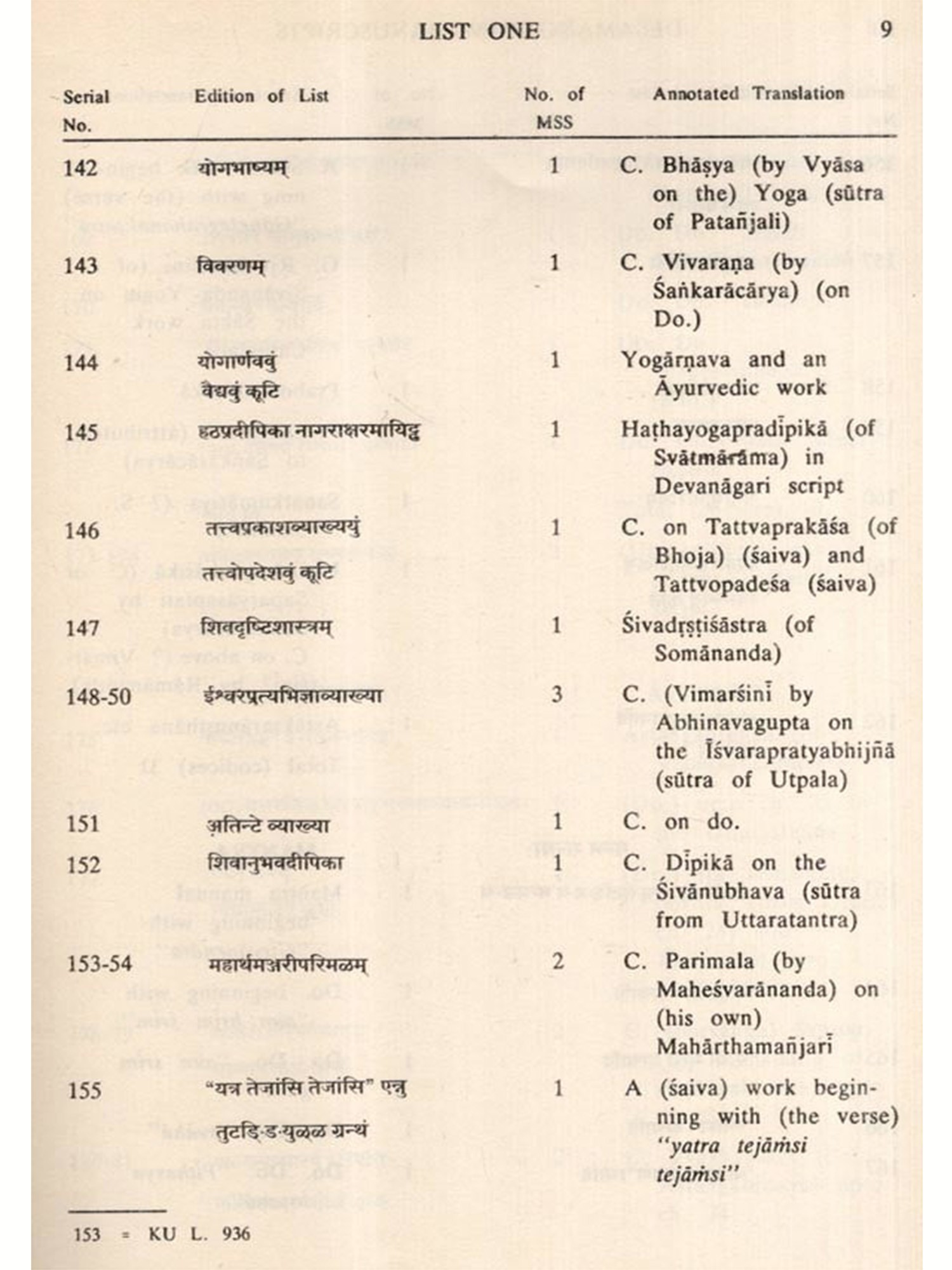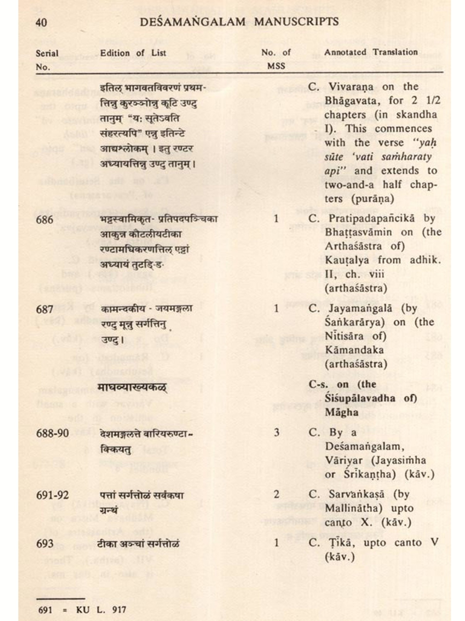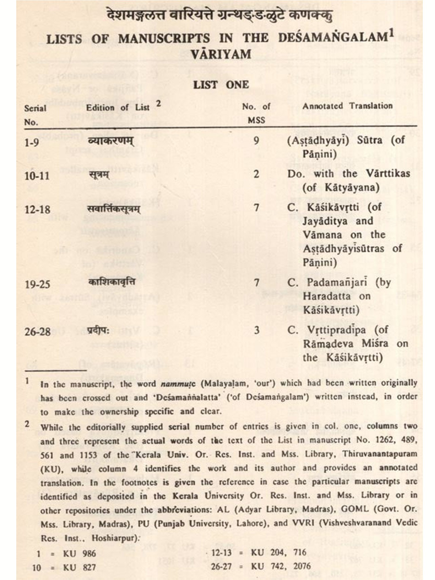 What is more, Dr. Sarma has, as a result of extensive examination of manuscripts libraries, been able to locate as many as 285 manuscripts which once belonged to the Collection. Such identification has been made primarily on the basis of the special Desamangalam logos mudra inscribed on the flyleaves of the respective manuscripts themselves. The manuscripts so identified have been noticed in the footnotes against the relevant manuscripts with their accession numbers in the respective libraries.