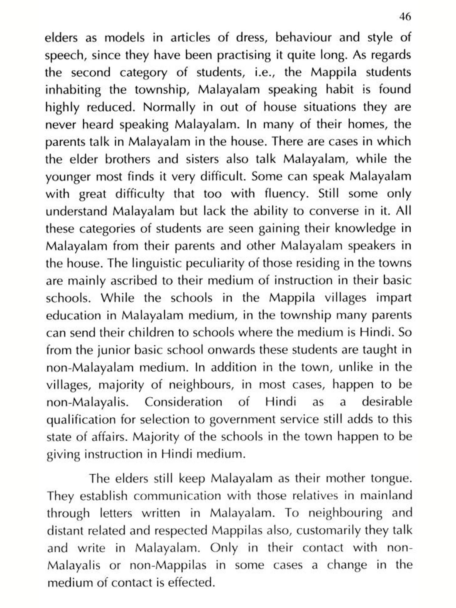 The linguistic behaviour of the migrant Mappilas is an area of interest to note. Though forced to live in a multi ethnic society with other exiles from different parts of India and the neighbouring countries, it is interesting to note that the language and culture of the Mappilas did not undergo any considerable changes. At the same time the changes that took place in the language habit of the youth and students cannot be ignored.