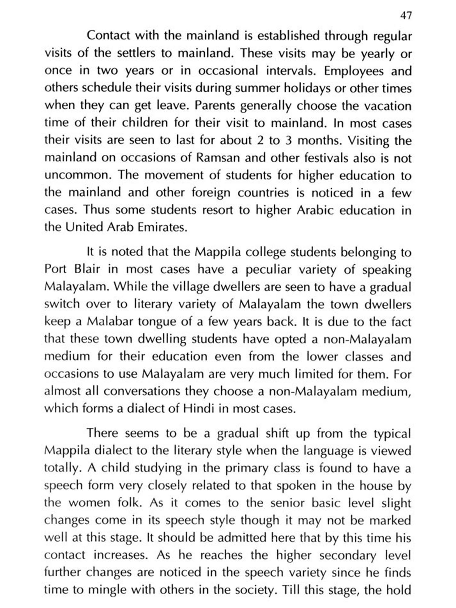 'Mappila Migrants in Andamans A socio linguistic study' is the report of the work undertaken at Andaman Islands by N. Muraleedharan Nair who was a Junior Research Fellow at ISDL during 1979-1980. Before the researcher proceeded to the Andaman Islands for the actual field study, a preliminary survey of the linguistic and cultural features of the Mappilas in Malabar whose relatives were exiled to the Andaman Islands during and after the Mappila rebellion was undertaken. The visit to the islands and the actual field study followed.