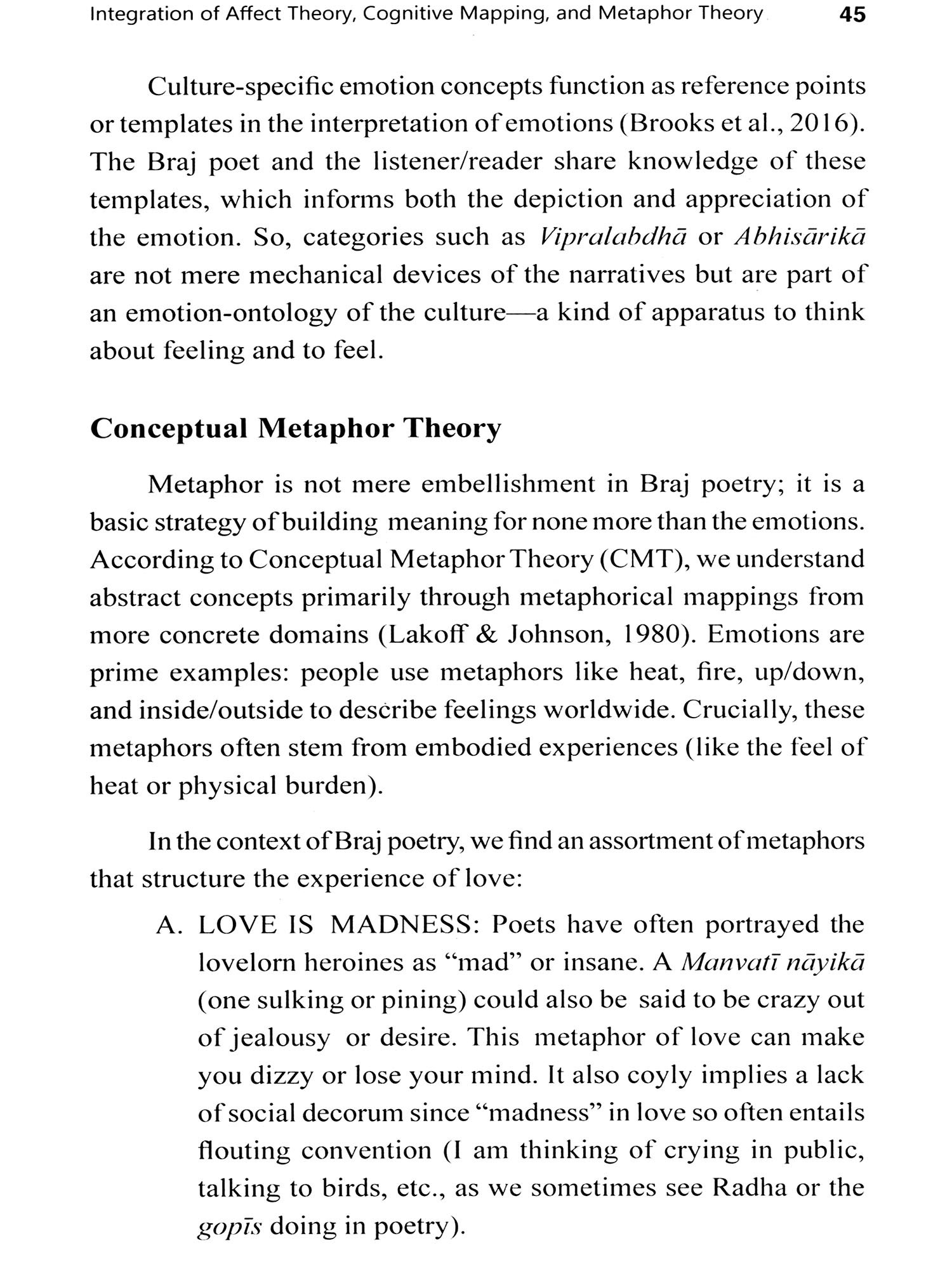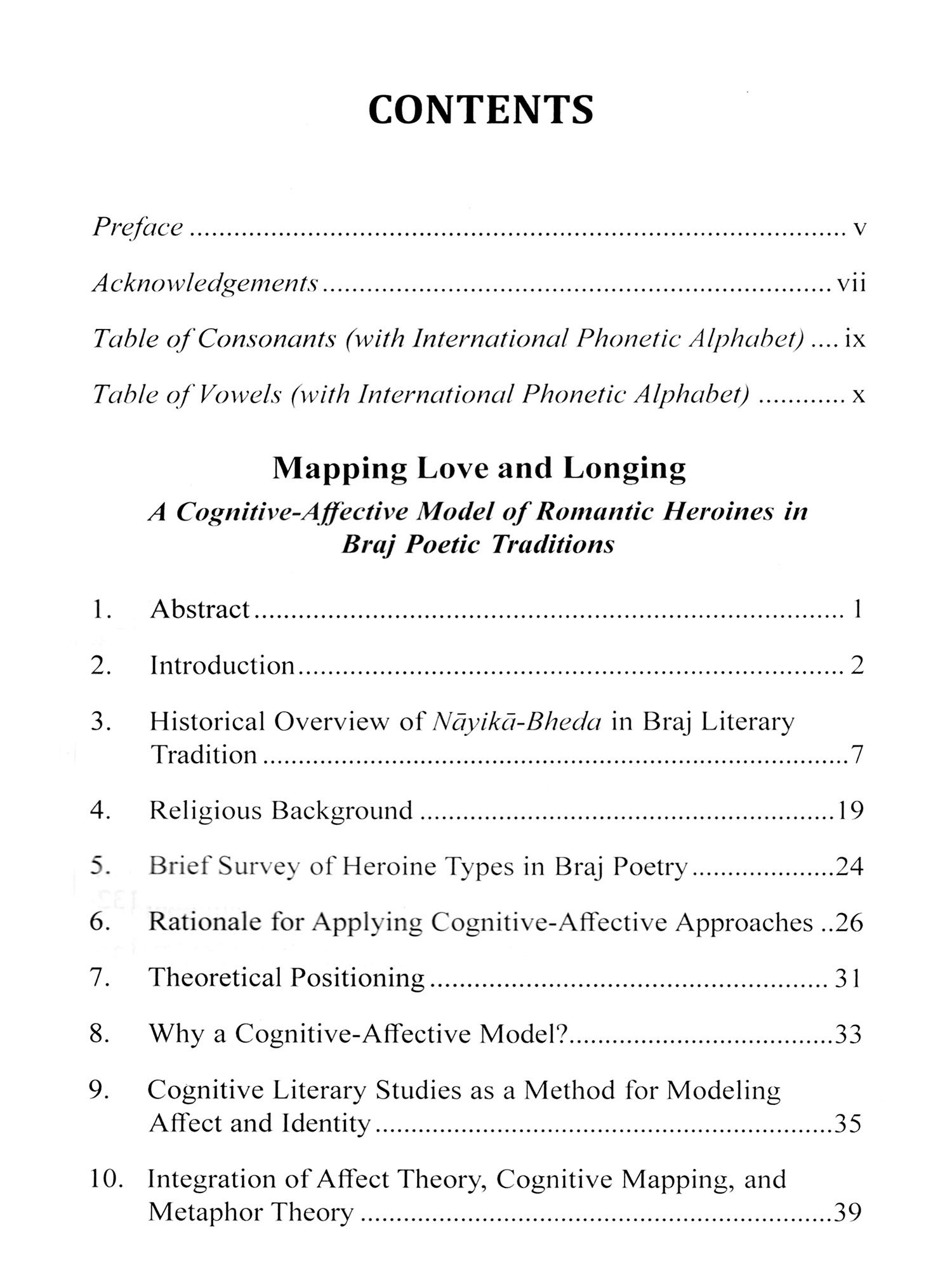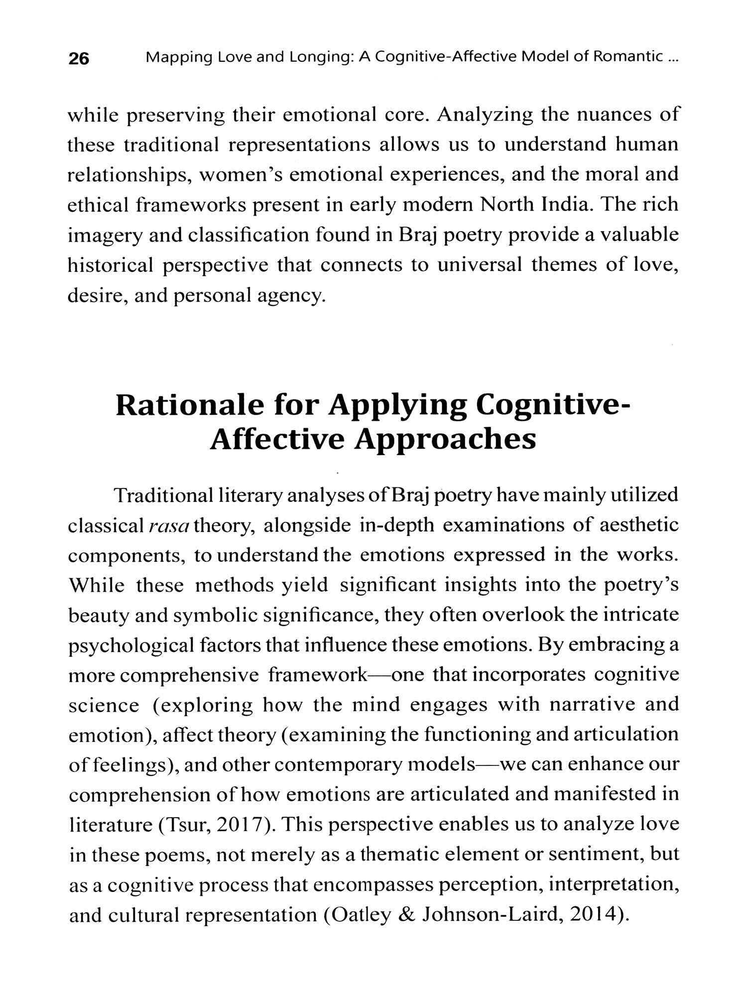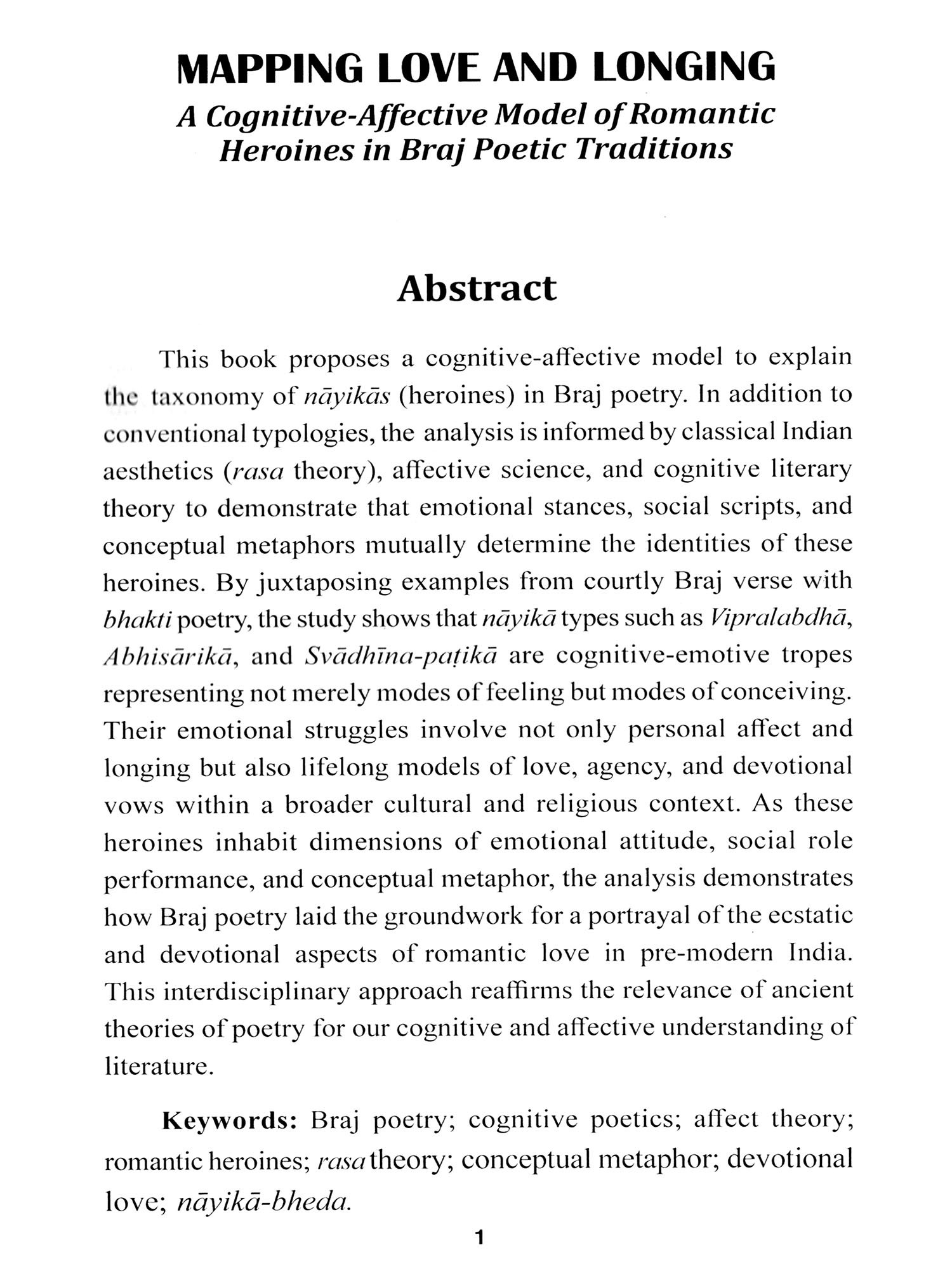 This book grew out of a long-standing fascination with the point where classical Indian aesthetics meets contemporary affect science and lived poetic practice. In the intricate landscape of the Braj verse, the many-sided heroines (nayikas) function not only as literary figures, but as a finely wrought cartography of early-modern emotional life-an unspoken psychology in rhyme and rhythm. I aim to show that the traditional taxonomy of nayika-bheda gains fresh clarity when read through the lenses of cognitive literary studies and modern appraisal theories of emotion.