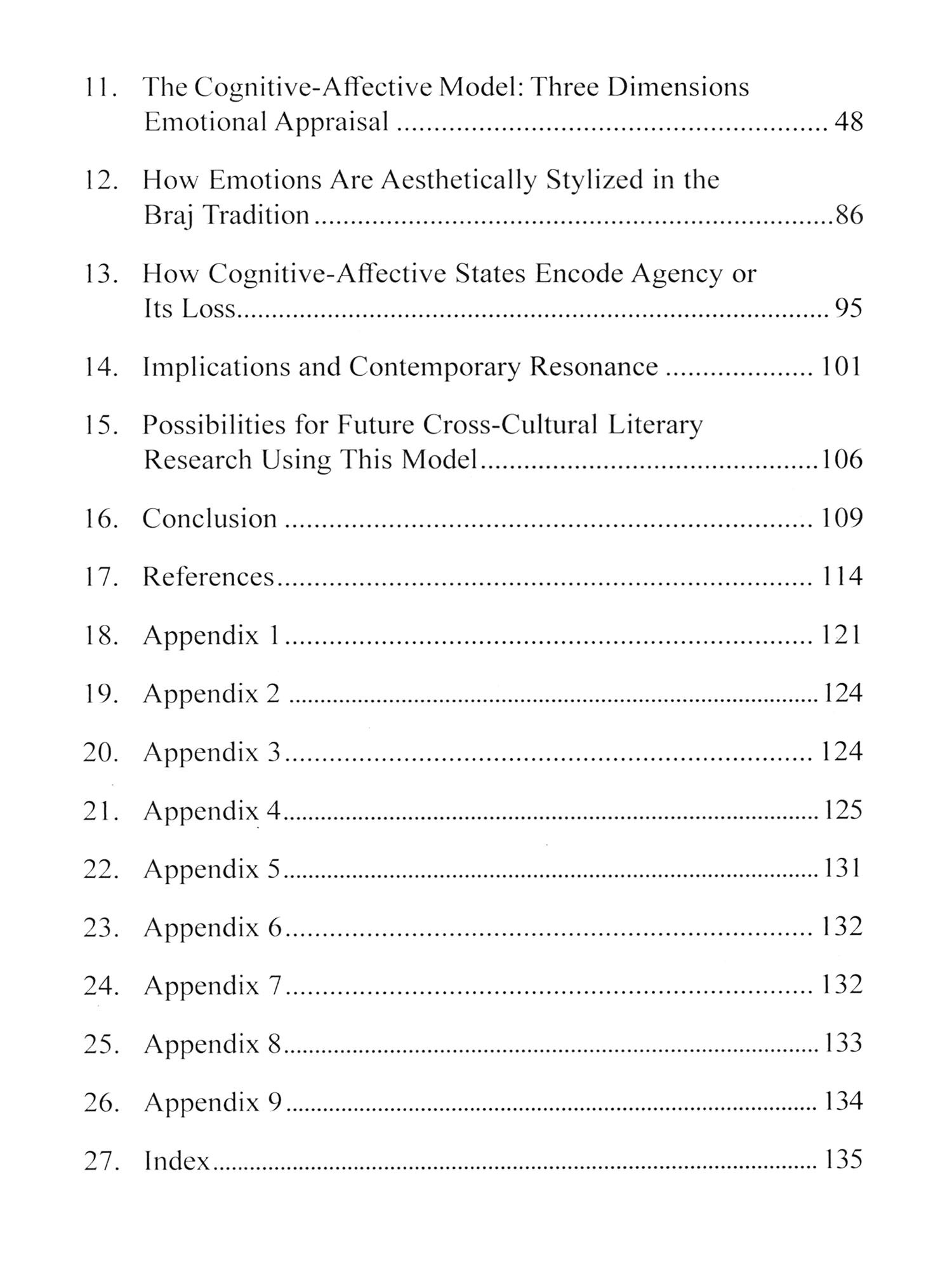 The project stands on the shoulders of three scholarly lineages: the philological rigor of Sanskrit, Hindi, and Braj criticism; the analytic tools of psychology and philosophy; and the interpretive frameworks of cultural theory. Each has helped me to trace how feelings are scripted, performed, and aestheticised across texts and contexts. I am especially grateful to the teachers, mentors, and colleagues who urged me toward "cross-cultural" inquiry-moving beyond simple comparison to genuine conceptual exchange.