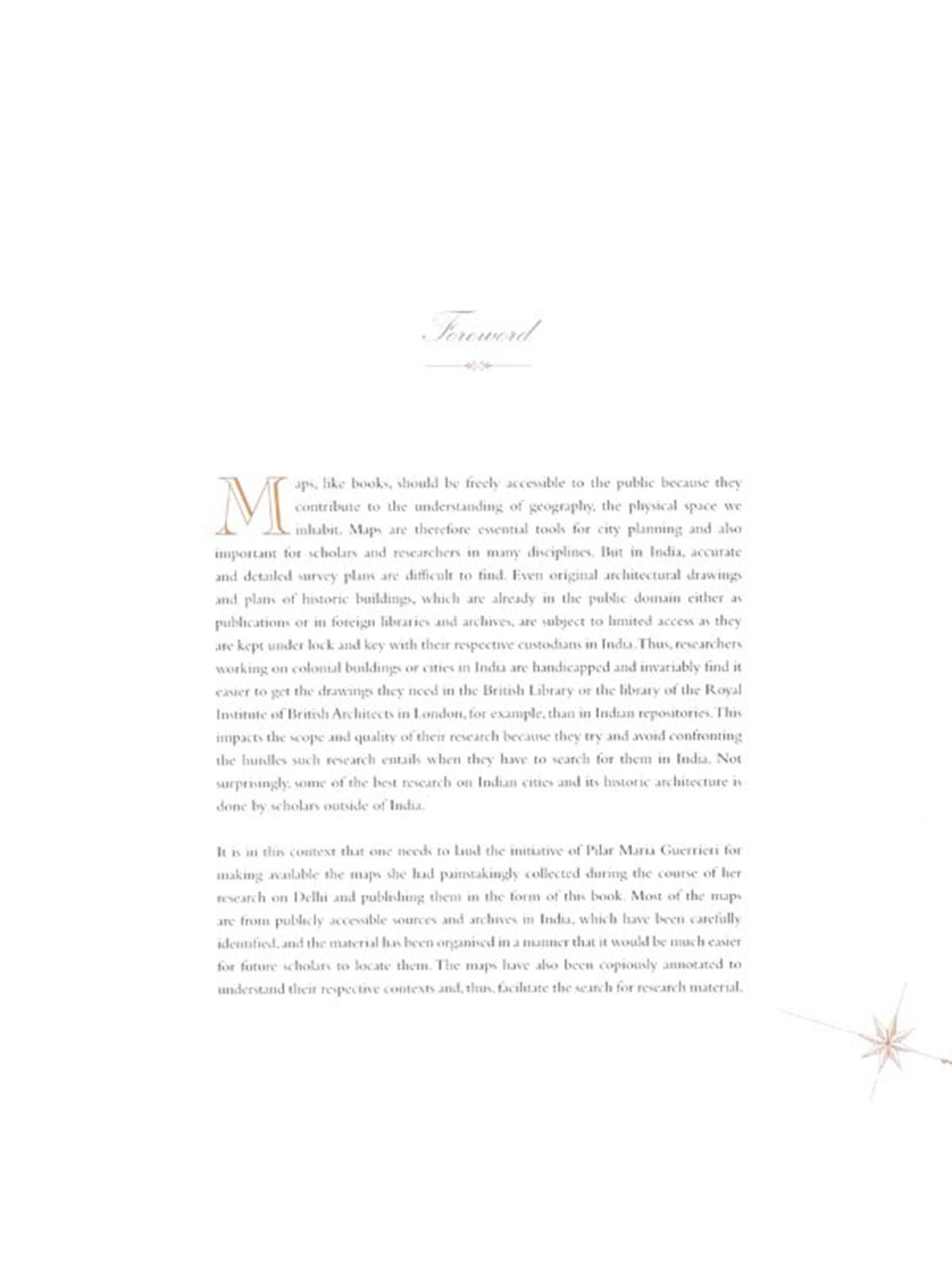 PILAR MARIA GUERRIERT holds a PhD in Architectural Design, Architectural Composition, Criticism and Theory from Politecnico di Milano, in collaboration with the Indian National Trust for Art and Cultural Heritage, Delhi, and Westminster University, London. She has conducted extensive research on European and Indian cultures, the development of megacities, and the effects of cultural exchanges. with primary focus on Delhi, pre- and post-Independence, and is at present developing a research project on European legacies in Delhi from 1991 until present day. Pilar is currently Associate Professor of History of Architecture at a partner university of Politecnico di Milano in Delhi and is also the Comutissioning Editor, India, for the International art publishing house Skira. She has published in numerous international journals and participated in various national and international conferences. This is her first book.