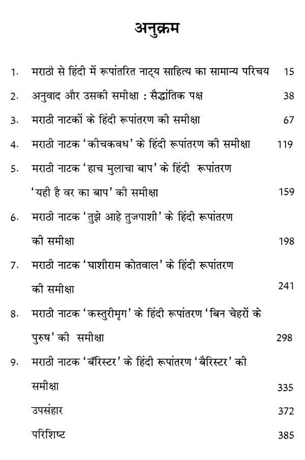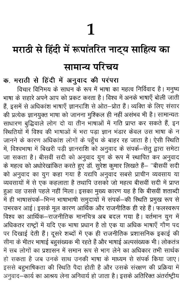 पहला अध्याय : 'मराठी से हिंदी में रूपांतरित नाट्य साहित्य का सामान्य परिचय के अंतर्गत मराठी से हिंदी में साहित्यानुवाद की परंपरा को संक्षेप में स्पष्ट करने का प्रयास किया है। इसमें अनूदित काव्य, कहानी, उपन्यास का संक्षिप्त विवरण दिया है। अंत में मराठी से हिंदी में अनूदित नाट्य साहित्य पर विस्तार से विचार किया है। नाट्यानुवाद की आवश्यकता, प्रेरणाएँ, मूल तथा अनुवाद के प्रकाशन काल के अंतर, रूपांतरण और भाषिक अनुवाद आदि कई मुद्दों की विस्तार से चर्चा की है।