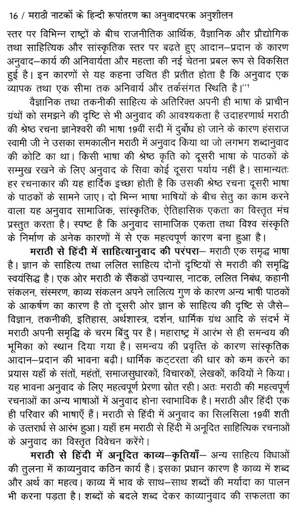 मराठी से हिंदी में साहित्यिक तथा साहित्येतर कई ग्रंथों के अनुवाद हुए हैं; परंतु उनकी अनुवादपरक समीक्षा की दिशा में अभी तक विशेष प्रयास नहीं हुए हैं। इस दिशा में कुछ मूलभूत तथ्यों की ओर संकेत करने का उद्देश्य सामने रखकर यह अनुसंधान कार्य हाथ में लिया गया था।