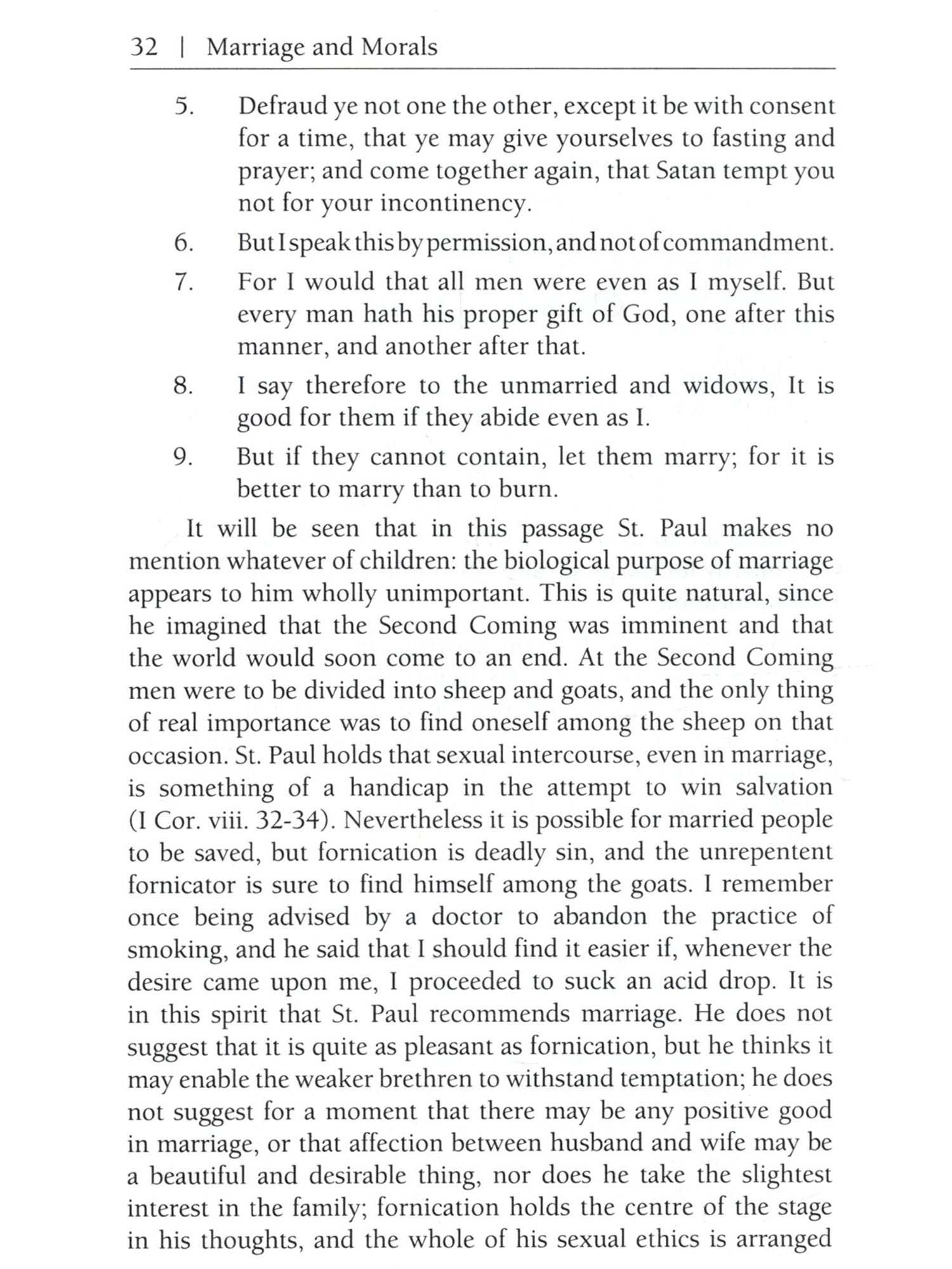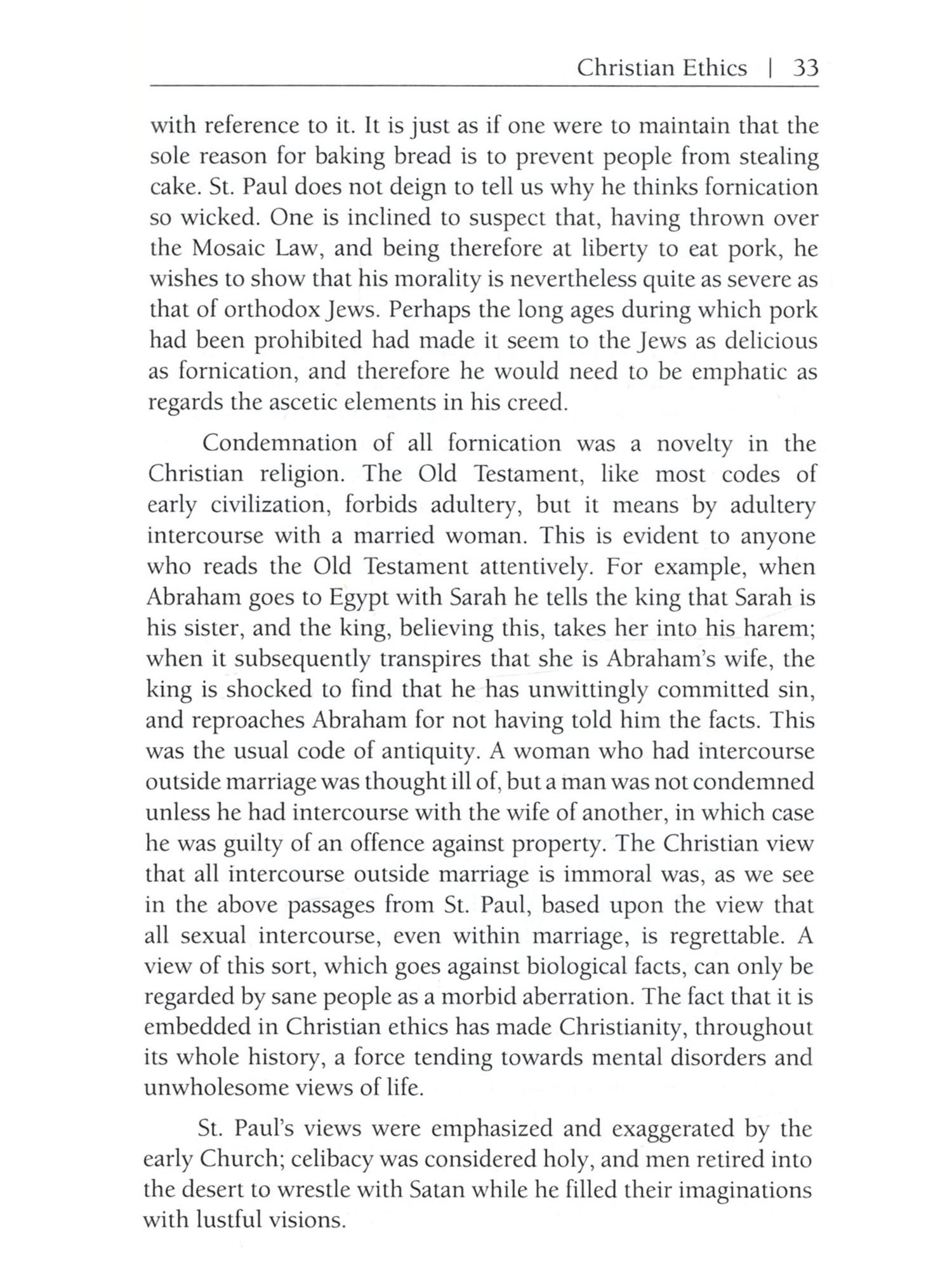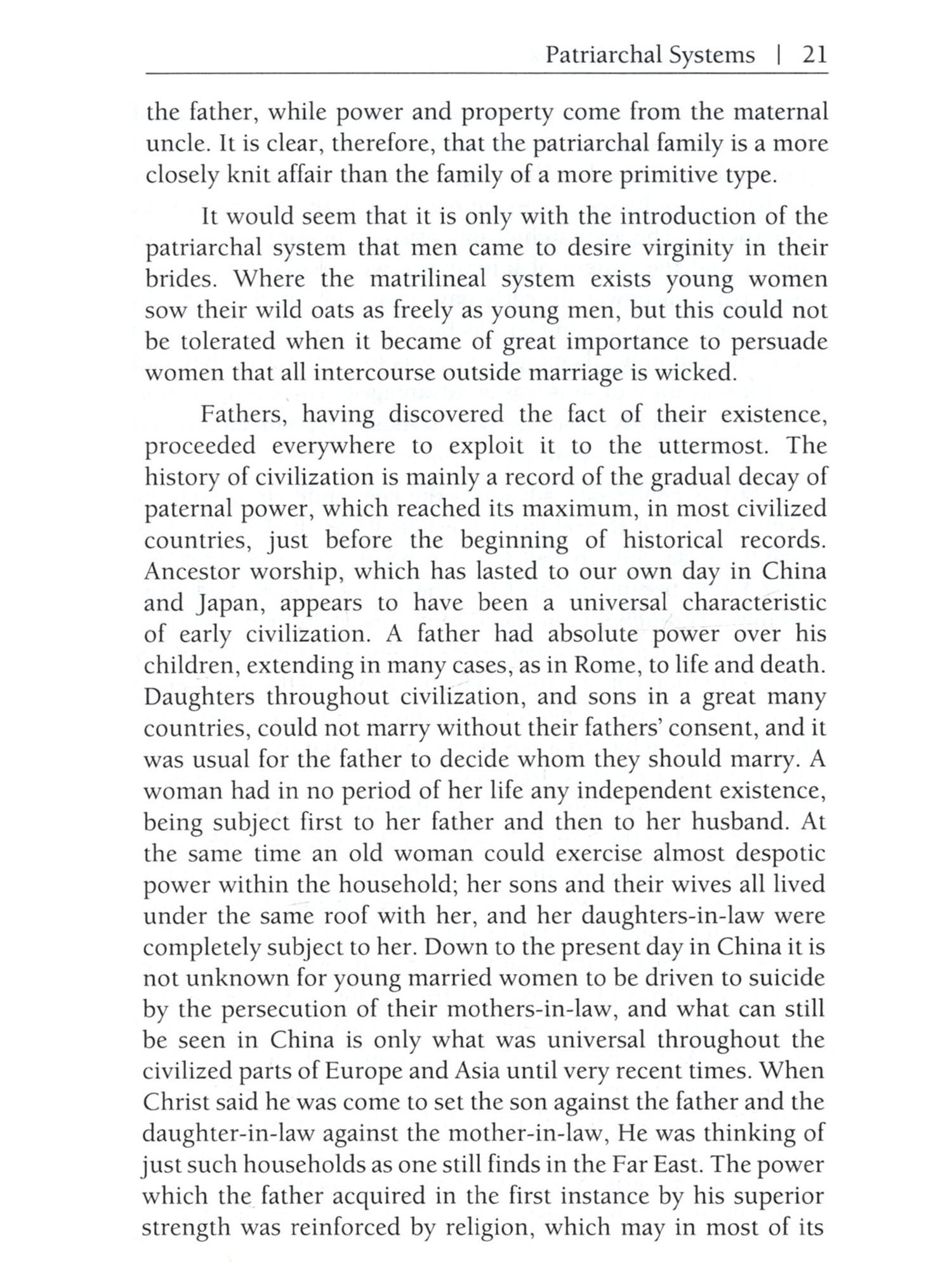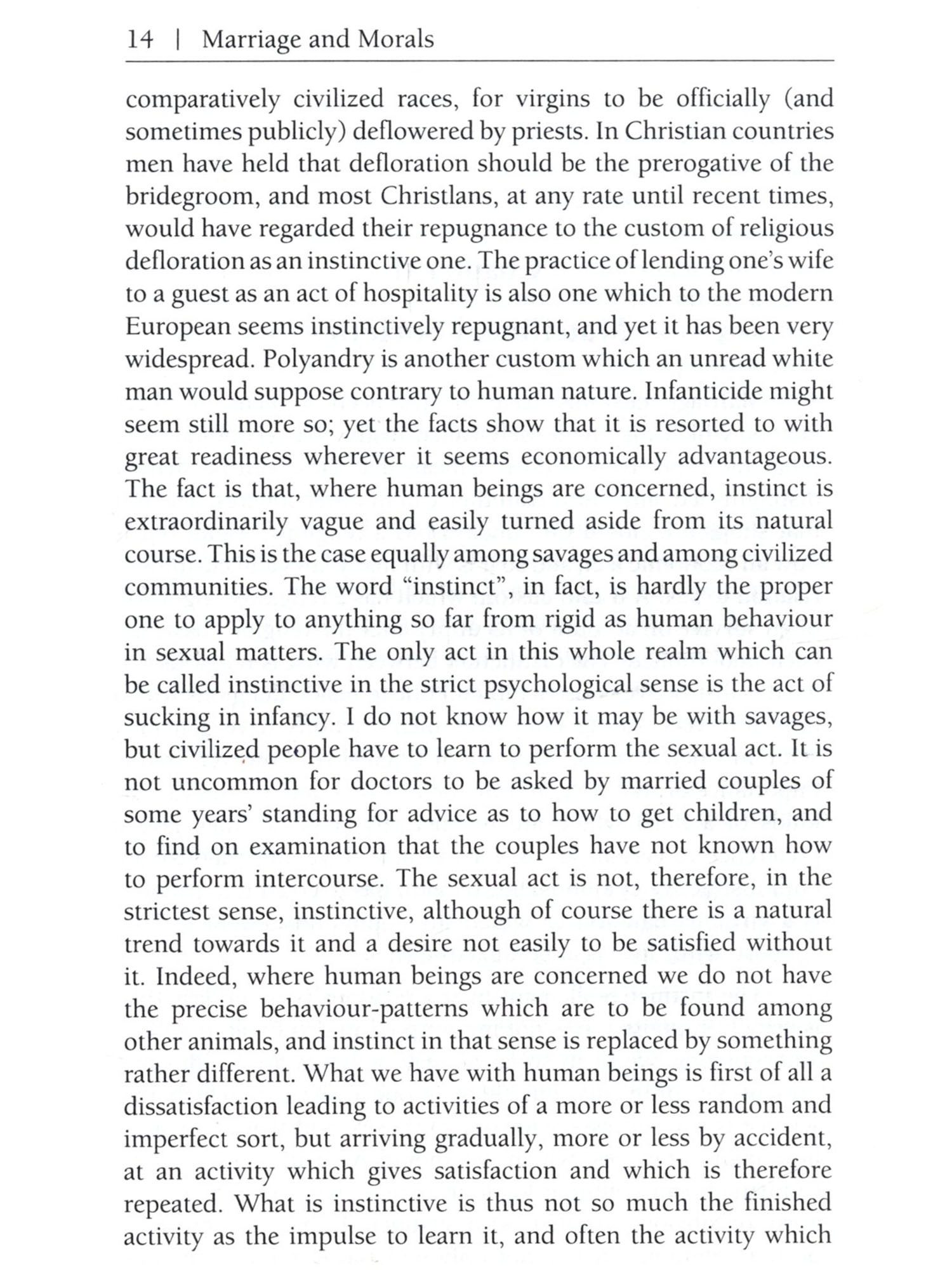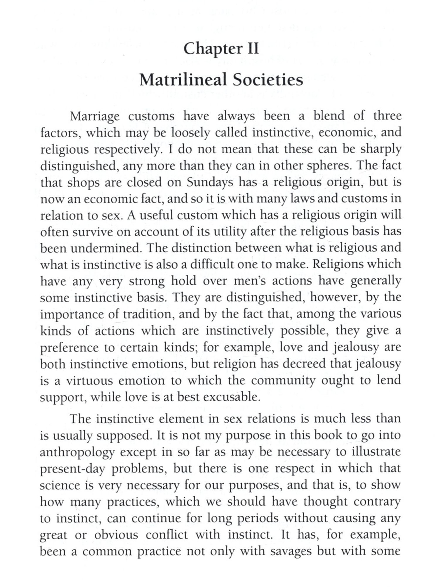 In characterizing a society, whether ancient or modern, there are two elements, rather closely interconnected, which are of prime importance: one is the economic system, the other the family system. There are at the present day two influential schools of thought, one of which derives everything from an economic source, while the other derives everything from a family or sexual source, the former school that of Marx, the latter that of Freud. I do not myself adhere to either school, since the interconnections of economics and sex do not appear to me to show any clear primacy of the one over the other from the point of view of causal efficacy. For example: no doubt the industrial revolution has had and will have a profound influence upon sexual morals, but conversely the sexual virtue of the Puritans was psychologically necessary as a part cause of the industrial revolution. I am not prepared myself to assign primacy to cither the economic or the sexual factor, nor in fact can they be separated with any clearness. Economics is concerned essentially with obtaining food, but food is seldom wanted among human beings solely for the benefit of the individual who obtains it; it is wanted for the sake of the family, and as the family system changes, economic motives also change It must be obvious that not only life insurance but most forms of private saving would nearly cease if children were taken away from their parents and brought up by the State as in Plato's Republic; that is to say, if the State were to adopt the role of the father, the State would, ipso facto, become the sole capitalist. Thoroughgoing Communists have often maintained the converse, that if the 8 Marriage and Morals State is to be the sole capitalist, the family, as we have known it, cannot survive; and even if this is thought to go too far, it is impossible to deny an intimate connection between private property and the family, a connection which is reciprocal, so that we cannot say that one is cause and the other is effect. The sexual morals of the community will be found to consist of several layers. There are first the positive institutions embodied in law; such, for example, as monogamy in some countries and polygamy in others. Next there is a layer where law does not intervene but public opinion is emphatic. And lastly there is a layer which is left to individual discretion, in practice if not in theory. There is no country in the world and there has been no age in the world's history where sexual ethics and sexual institutions have been determined by rational considerations, with the exception of Soviet Russia. I do not mean to imply that the institutions of Soviet Russia are in this respect perfect; I mean only that they are not the outcome of superstition and tradition, as are, at least in part, the institutions of all other countries in all ages. The problem of determining what sexual morality would be best from the point of view of general happiness and well-being is an extremely complicated one, and the answer will vary according to a number of circumstances. It will be different in an industrially advanced community from what it would be in a primitive agricultural regime. It will be different where medical science and hygiene are effective in producing a low death-rate from what it would be where plagues and pestilences carry away a large proportion of the population before it becomes adult. Perhaps when we know more, we shall be able to say that the best sexual ethic will be different in one climate from what it would be in another, and different again with one kind of diet from what it would be with another. The effects of a sexual ethic are of the most diverse kinds -personal, conjugal, familial, national and international. It may well happen that the effects are good in some of these respects, where they are bad in others. All must be considered before we can decide what on the balance we are to think of a given system. To begin with the purely personal these are the effects considered by psycho-analysis. We have here to take account not only of the adult behaviour inculcated by a code, but also of the early education designed to produce obedience to the code, and in this region, as everyone knows, the effects of early taboos may be very curious and indirect. In this department of the subject we are at the level of personal well-being. The next stage of our problem arises when we consider the relations of men and women. It is clear that some sex relations have more value than others. Most people would agree that a sex relation is better when it has a large psychical element than when it is purely physical. Indeed, the view which has passed from the poets into the common consciousness of civilized men and women is that love increases in value in proportion as more of the personalities of the people concerned enters into the relation. The poets also have taught many people to value love in proportion to its intensity; this, however, is a more debatable matter. Most moderns would agree that love should be an equal relation, and that on this ground, if on no other, polygamy, for example, cannot be regarded as an ideal system. Throughout this department of the subject it is necessary to consider both marriage and extra-marital relations, since whatever system of marriage prevails, extra-marital relations will vary correspondingly. We come next to the question of the family. There have existed in various times and places many different kinds of family groups, but the patriarchal family has a very large preponderance, and, moreover, the monogamic patriarchal family has prevailed more and more over the polygamic. The primary motive of sexual ethics as they have existed in Western civilization since pre-Christian times has been to secure that degree of female virtue without which the patriarchal family becomes impossible, since paternity is uncertain. What has been added to this in the way of insistence on male virt