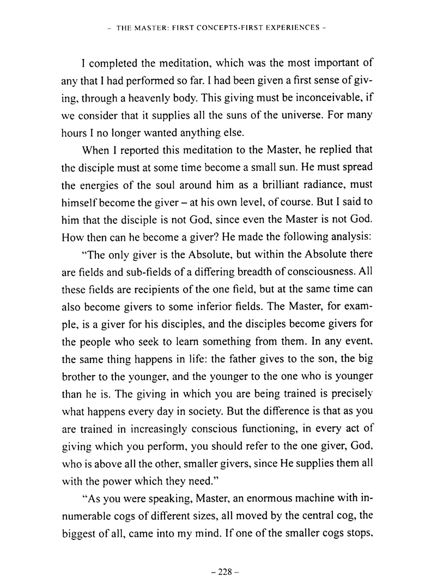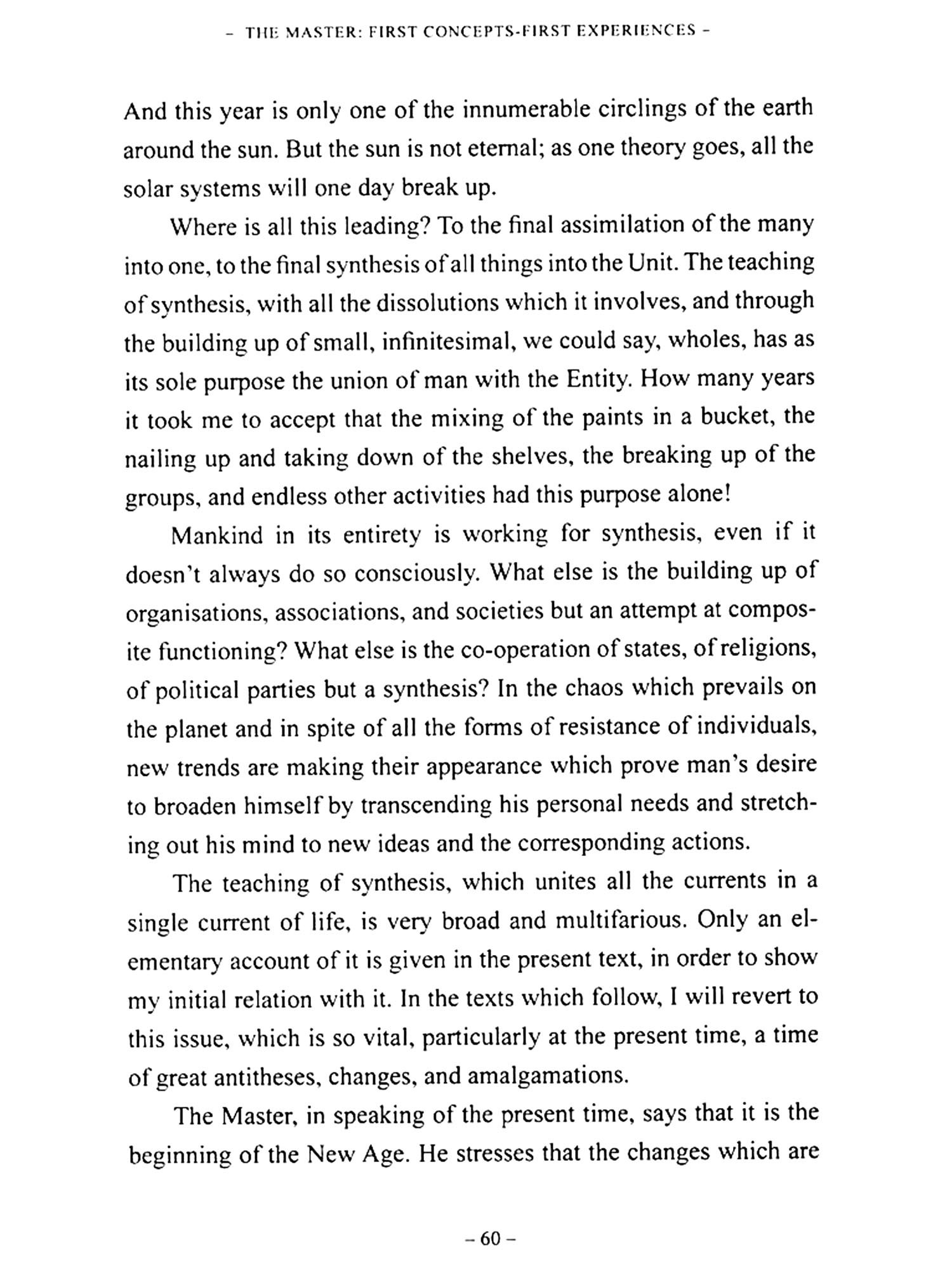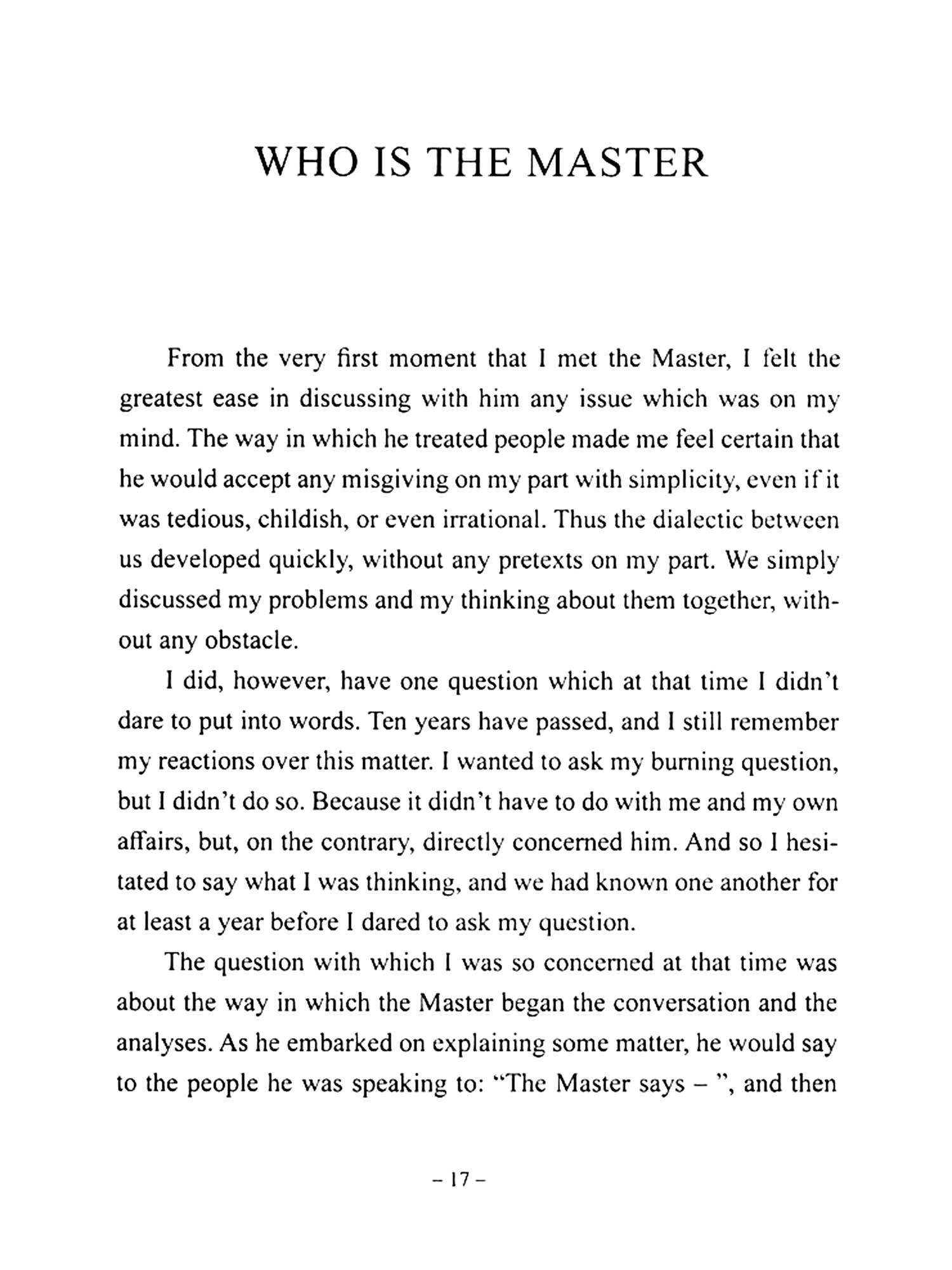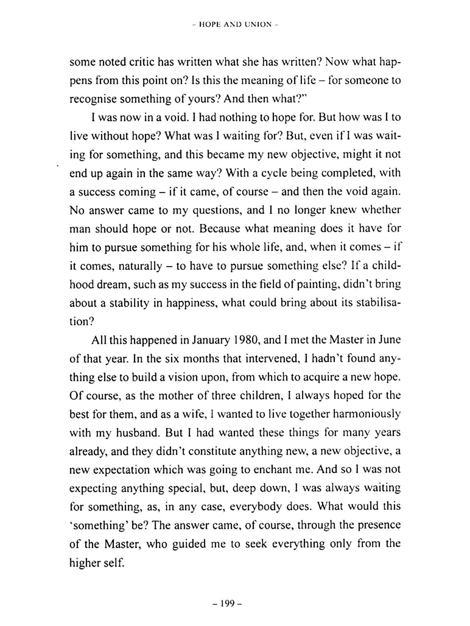 ""The learning experience of each individual is a composite one. It is taken in by breathing, by eating, by making love. Sometimes the teachings are understood and sometimes not. If, however, you find yourself in the presence of a Master, of someone who helps you to understand what you are being taught, then your learning becomes conscious, life takes on another meaning. In my case, my footsteps led to the presence of a Master ten years ago. With his support, I began at that time to become a conscious pupil in the study of life and of myself, in order to find the truth, the meaning of existence.""