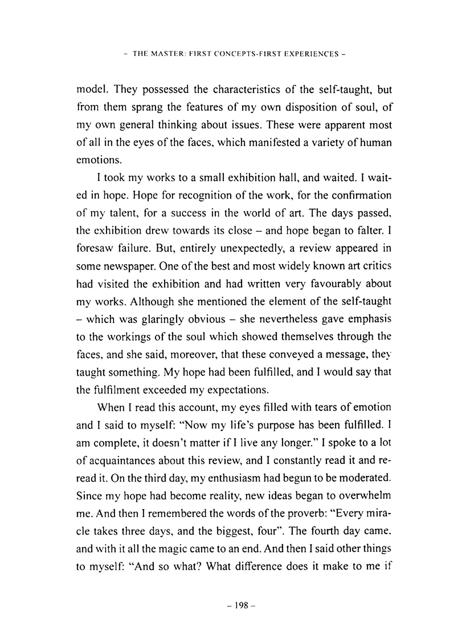 Nevertheless, one day my thoughts cleared, as though I'd realised why there was always something missing from my texts: be-cause I was merely giving the findings of a task, an apprenticeship in life. But I wasn't describing its progress. And so I was leaving the most interesting feature out of the book, because it is these processes which are of greater importance-the difficulties, the failures, and the successes - until some result is produced.