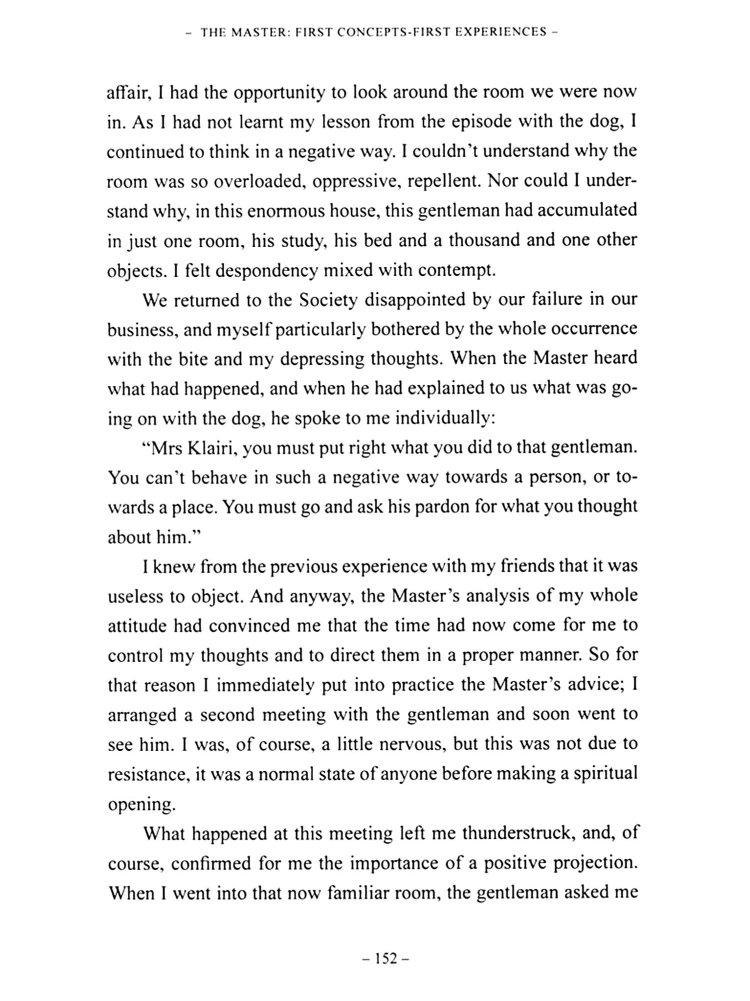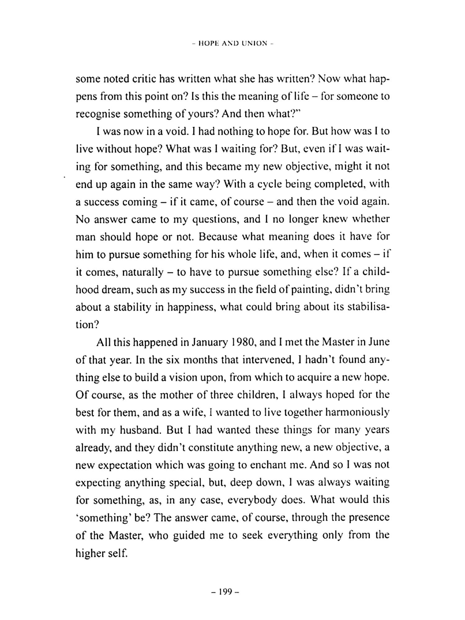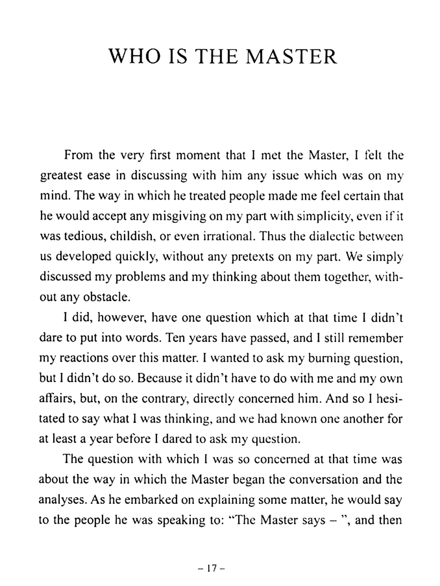 "The learning experience of each individual is a composite one. It is taken in by breathing, by eating, by making love. Sometimes the teachings are understood and sometimes not. If, however, you find yourself in the presence of a Master, of someone who helps you to understand what you are being taught, then your learning becomes conscious, life takes on another meaning. In my case, my footsteps led to the presence of a Master ten years ago. With his support, I began at that time to become a conscious pupil in the study of life and of myself, in order to find the truth, the meaning of existence."