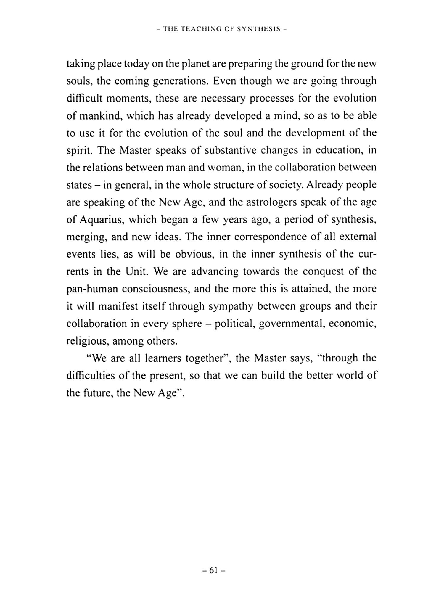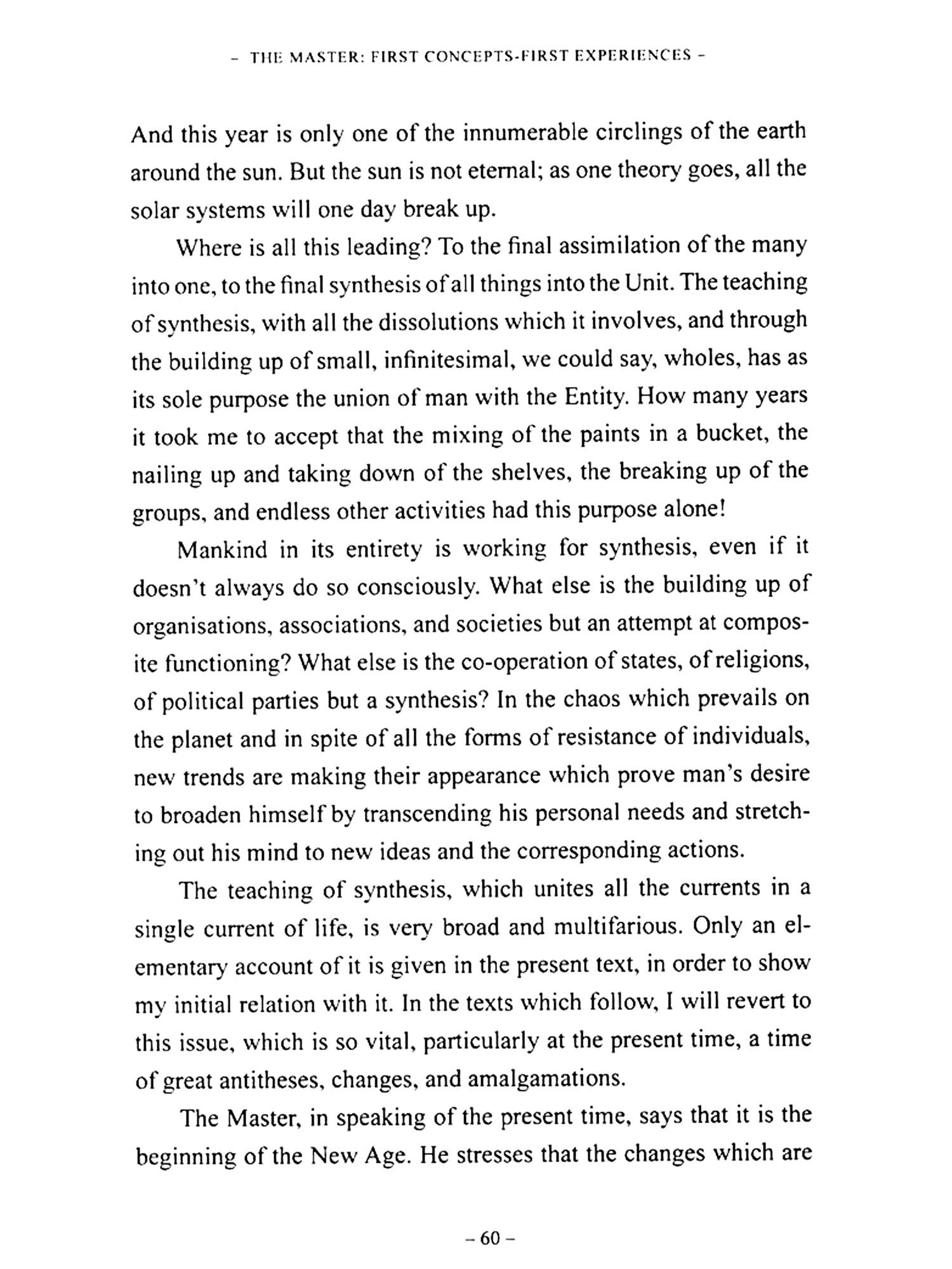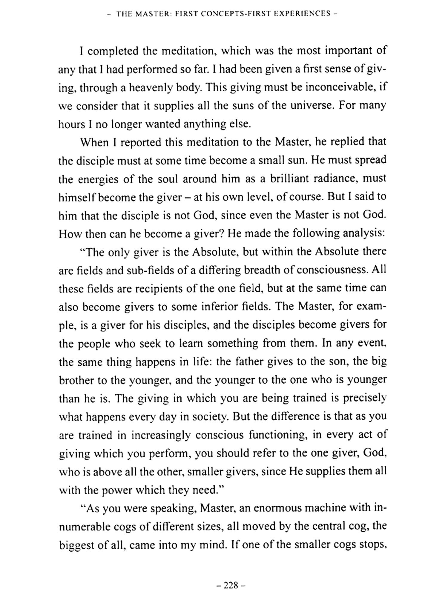 "The learning experience of each individual is a composite one. It is taken in by breathing, by eating, by making love. Sometimes the teachings are understood and sometimes not. If, however, you find yourself in the presence of a Master, of someone who helps you to understand what you are being taught, then your learning becomes conscious, life takes on another meaning. In my case, my footsteps led to the presence of a Master ten years ago. With his support, I began at that time to become a conscious pupil in the study of life and of myself, in order to find the truth, the meaning of existence."