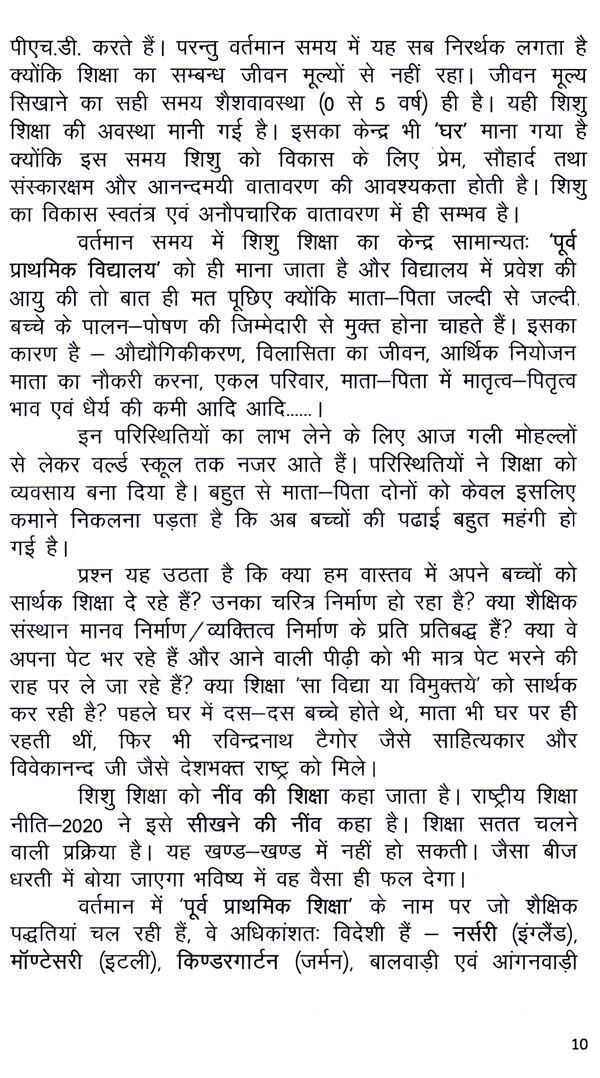 विद्या भारती की अखिल भारतीय शिशु वाटिका सहसंयोजिका श्रीमती नम्रता दत्त दीदी ने वर्षों तक शिशु शिक्षा क्षेत्र में कार्य द्वारा अनुभव प्राप्त किया है। स्वयं के अध्ययन एवं अनुभव के आधार पर आपने शून्य से पांच वर्ष के शिशु के माता-पिता और आचार्य के लिए वेब पोर्टल 'राष्ट्रीय शिक्षा डॉट कॉम' पर शिशु शिक्षा के 40 लेख प्रस्तुत आशा है कि यह पुस्तक परिवारजनों (घर को विद्यालय कैसे बनाएँ) एवं शिशु वाटिका के सभी कार्यकर्ताओं (विद्यालय को घर कैसे बनाएँ) के लिए उत्तम मार्गदर्शिका बनेगी। भावी माता-पिता, विद्यालय एवं संबंधित संस्थानों के लिए शून्य से पांच वर्ष की शिशु विकास प्रक्रिया में इस पुस्तक का प्रयोग मार्गदर्शिका के रूप में अवश्य करें। नम्रता दीदी को बहुत बहुत बधाई।
