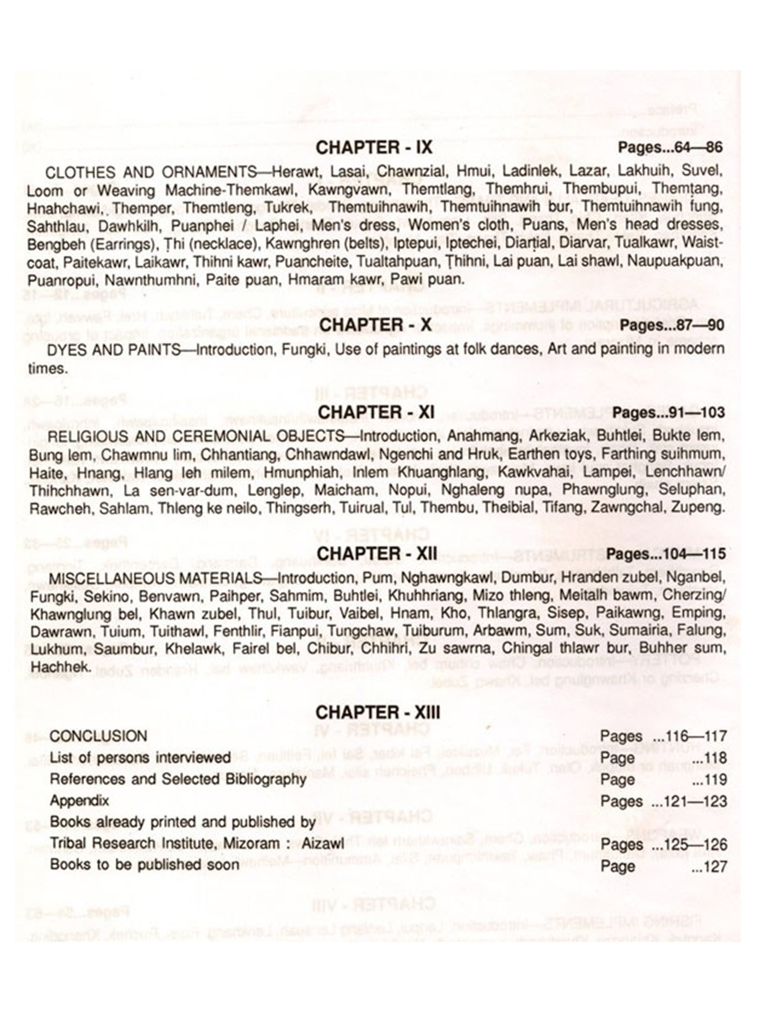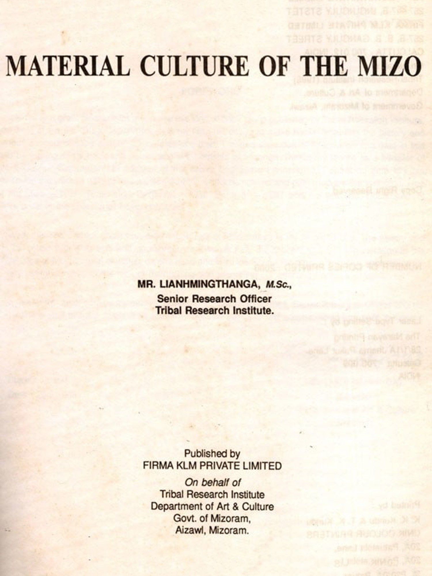 It is really a great pleasure for me to see this kind of book being published by Tribal Research Institute, one wing of Art & Culture Department. It is my long felt desire to make books regarding the history and various aspects of Mizo culture. Since long long past, I started collection of information and data in this field by touring every nook and comer and even outside of Mizoram. During my tenure as a Minister of Art & Culture Department, in addition to my heavy engagement scheduled, I spent no time idly but continued the work of data collection. Some of my works completed and published are Genealogical Tree of the Mizo -1996, Tualchhuak Damdawi -1996, Sakhua 1997 and the last one, Documents of Mizoram is in the process of being published. Well, this book, which deals with different objects of Mizo culture is my favourite one. The history and the collection with diagrams and photographs will surely help the present and future generation in the knowledge of Mizo cultural materials on one hand and Mizo identity on the other. I hope this book will serve a very useful purpose in the task of maintaining and promoting our cherished cultural entity.