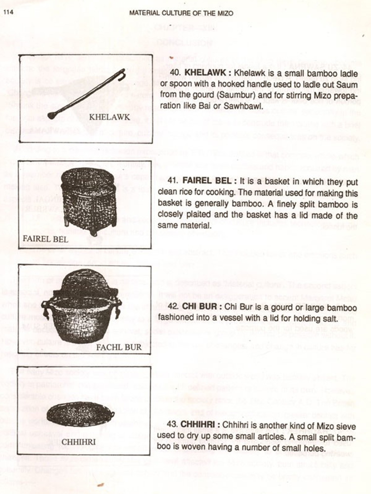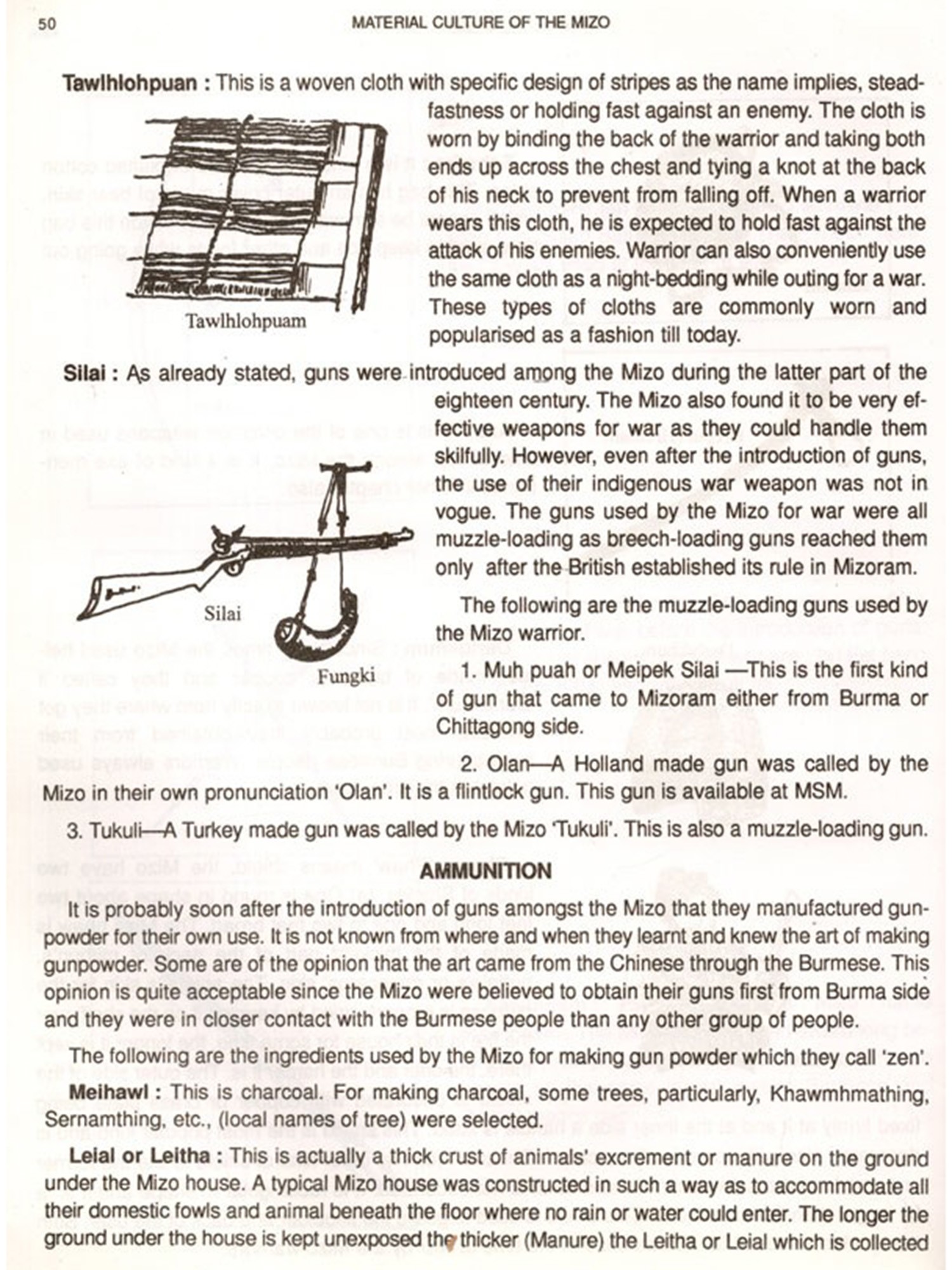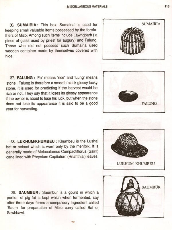 The basic needs for survival of all animals are food and shelter. Unlike other animals the needs of human beings are more in number and complex. While animals do not need clothing because their skins are made adaptable to even an extreme climate of their habitat. Men need clothing's either to protect themselves from cold or heat. While animals feed themselves from green leaves, insects or other animals which have been readily provided by nature, men have to search for food and prepare or cook. There are various ways by which men procured food by utilising various tools and equipment's. But with the gradual changes that have been taking place, modern technologies have given men the better equipment's and tools. So the old and traditional ones become obsolete. Many traditional equipment's and implements are now discarded. The physical existence of these materials equipment's and tools will no longer last for long. Keeping in view that the next generation will be in the dark, different items of Mizo material culture are serially arranged, described how they are made and manipulated.