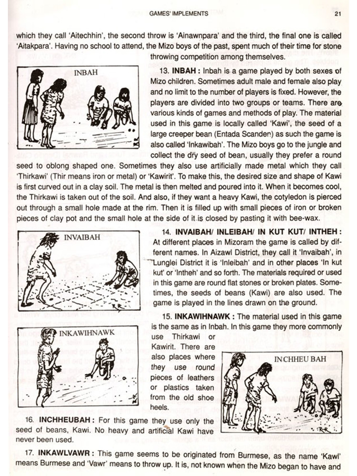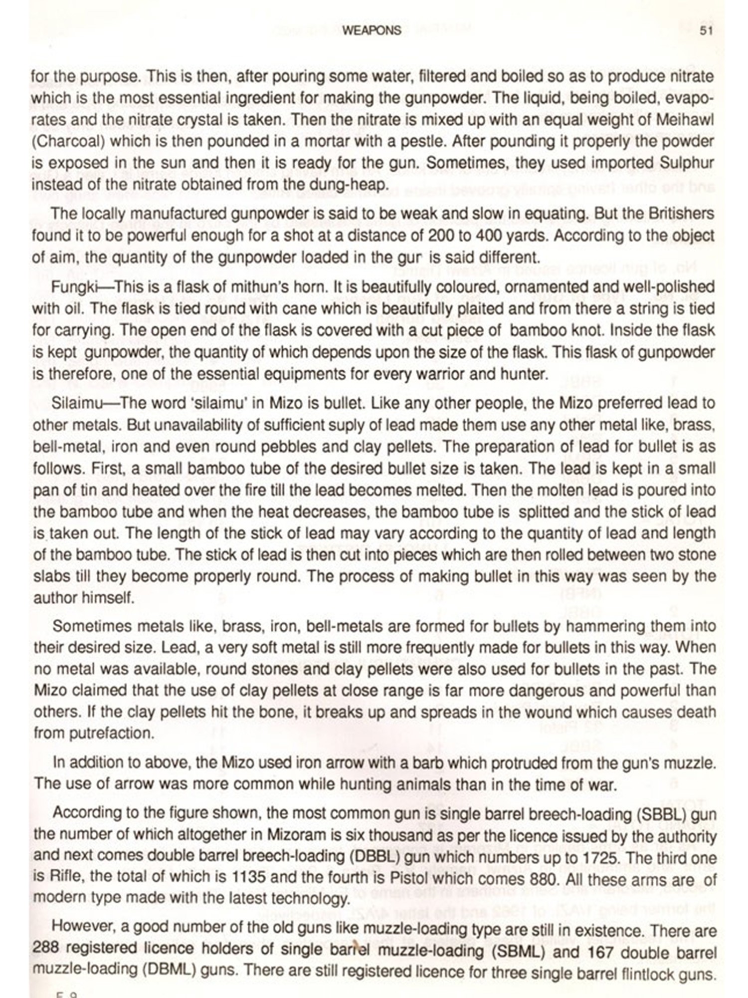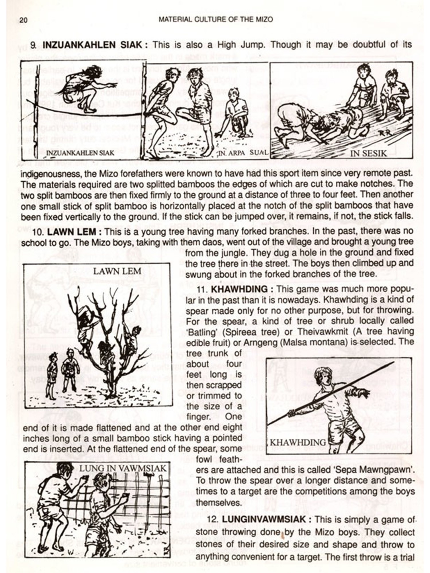 The basic needs for survival of all animals are food and shelter. Unlike other animals the needs of human beings are more in number and complex. While animals do not need clothing because their skins are made adaptable to even an extreme climate of their habitat. Men need clothing's either to protect themselves from cold or heat. While animals feed themselves from green leaves, insects or other animals which have been readily provided by nature, men have to search for food and prepare or cook. There are various ways by which men procured food by utilising various tools and equipment's. But with the gradual changes that have been taking place, modern technologies have given men the better equipment's and tools. So the old and traditional ones become obsolete. Many traditional equipment's and implements are now discarded. The physical existence of these materials equipment's and tools will no longer last for long. Keeping in view that the next generation will be in the dark, different items of Mizo material culture are serially arranged, described how they are made and manipulated.