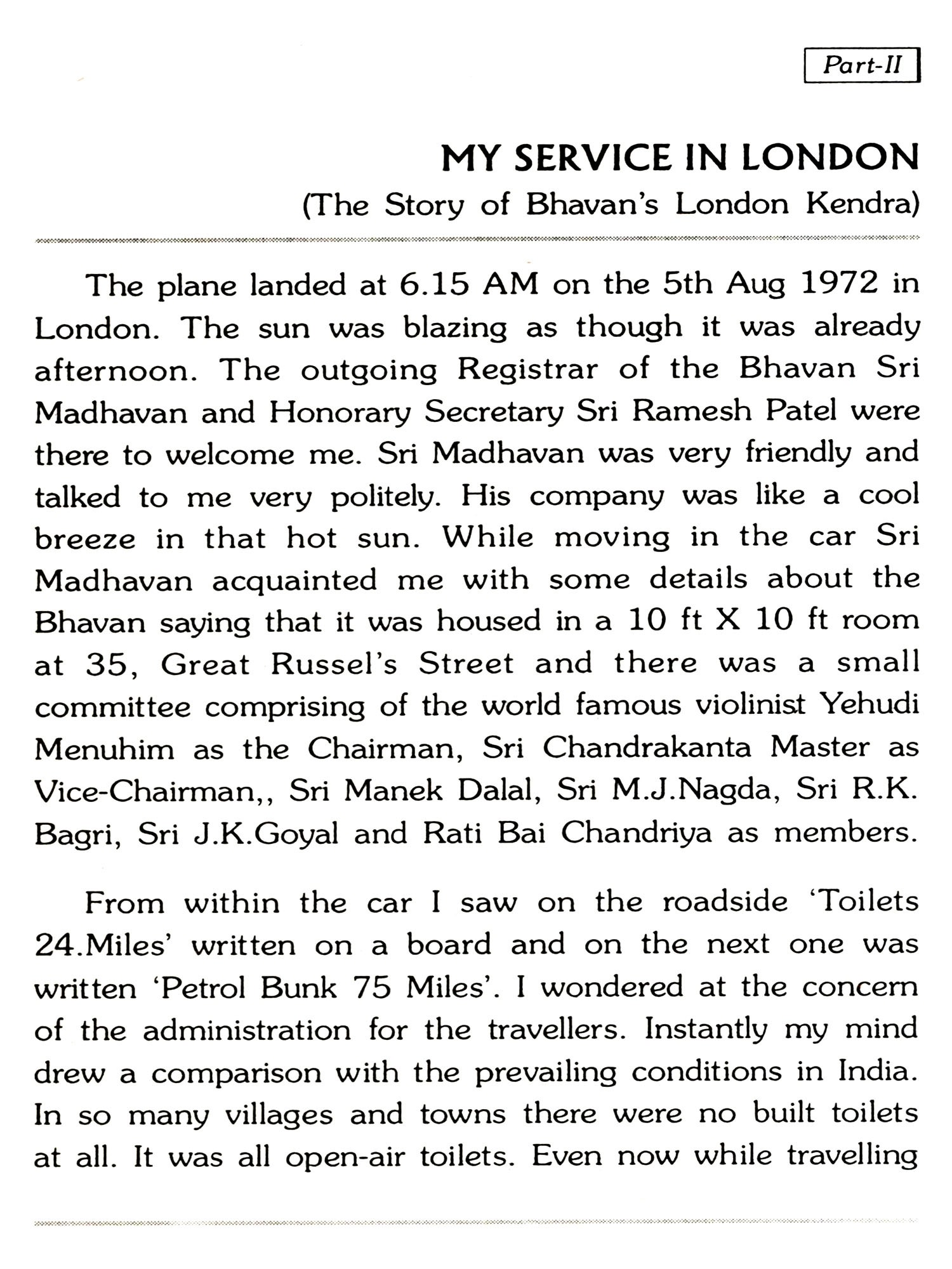 Leaves no stone Takes every inducts them as The Secretary General of the Bharatiya Vidya Bhavan Sri S. Ramakrishnan picks him for establishing a Bhavan's Centre at London. In his early days in London he finds himself in a tight spot without being able to carry out his task to his satisfaction. Recounts how he took courage from the Great Hanuman of Ramayana. unturned for the cause of Bhavan. opportunity to meet Indians in London, members of the Bhavan's London Centre. With the financial help extended by the family of the Birlas purchases an old unused church to house the Bhavan's Centre in London. Starts cultural and educational activities under the guidance of Shri Maneck Dalal, Chairman of the Bhavan's London Centre.