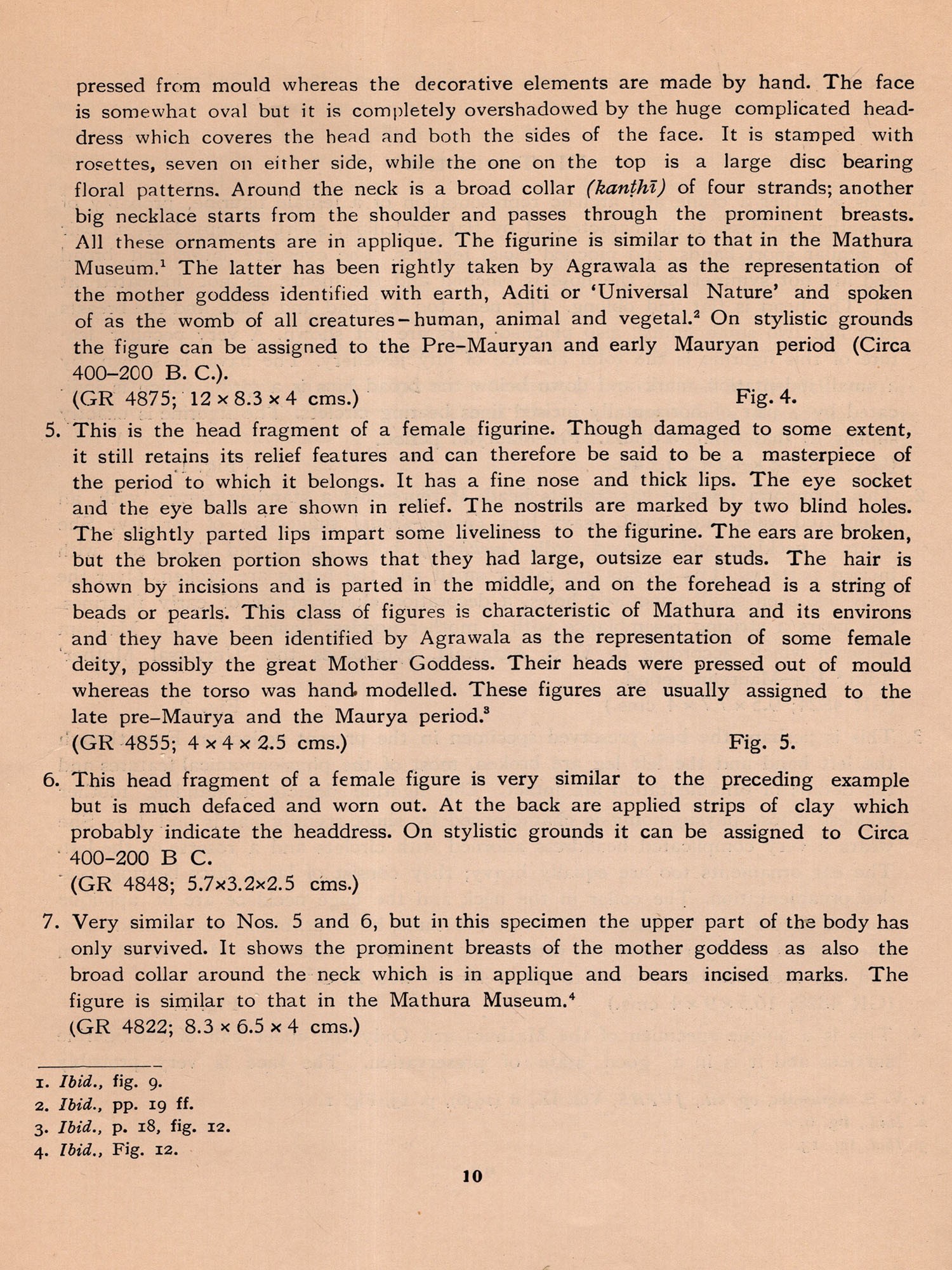 The present collection, though modest, represents to some extent the different stages of development of the Mathura art from pre-Mauryan period to about the early mediaeval times. Among the noteworthy pieces, mention should be made of the goddess Vasudhārā (Fig. 12), the image of Sarasvati (Fig. 50), the representation of Kumbhamuska yaksa (Fig. 31) and the stone statuette of Buddha (Fig. 51). Yet the most important of them all is the terracotta figurine of the sun god (Fig. 25) who is shown with a pair of short wings which emphasize the Vedic concept of the Sun bird. This form of sun is extremely rare and is unique and important from the point of view of iconography.