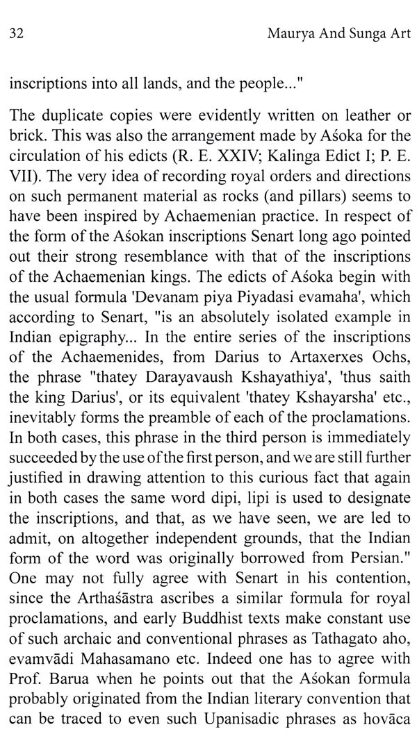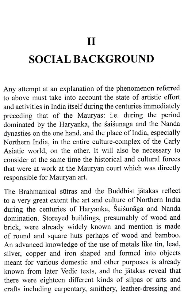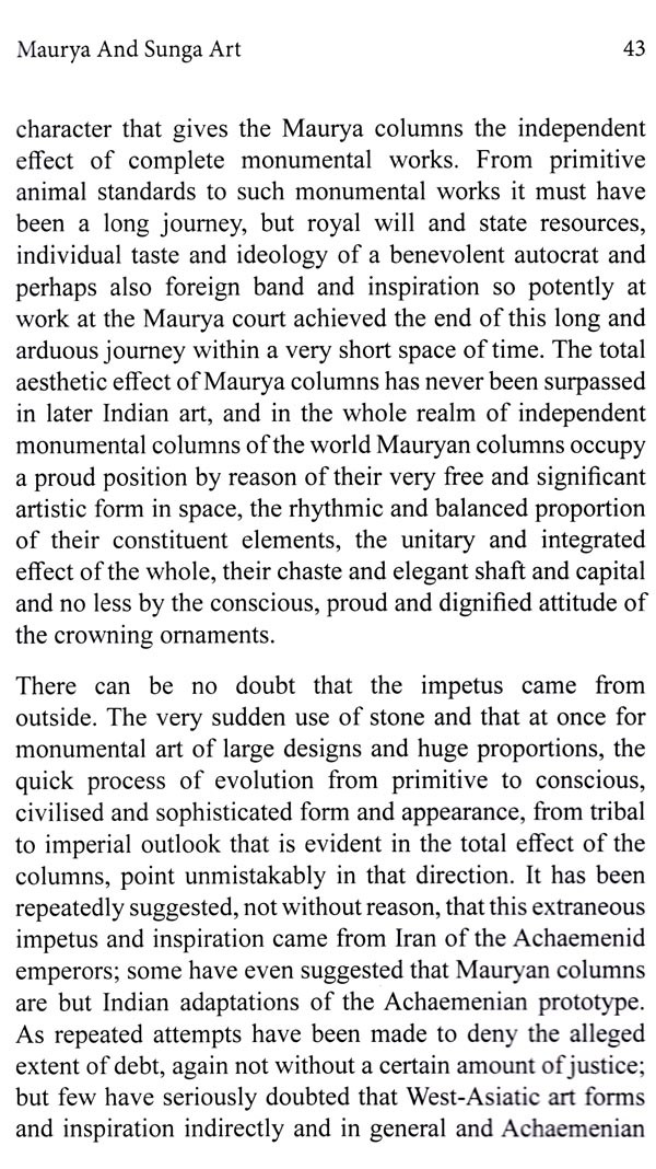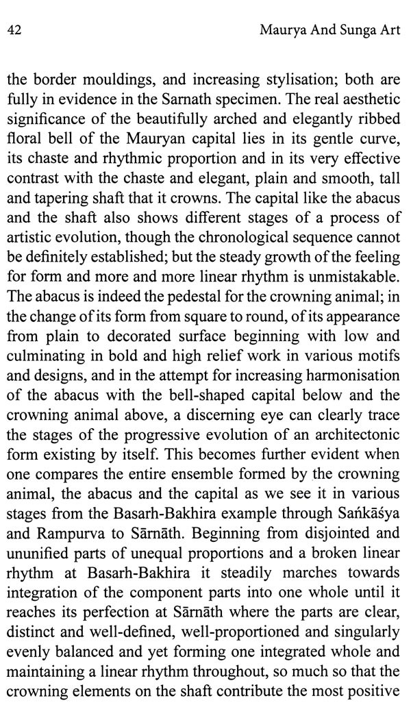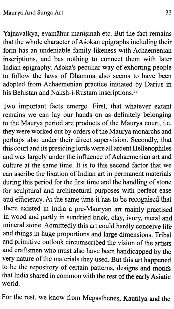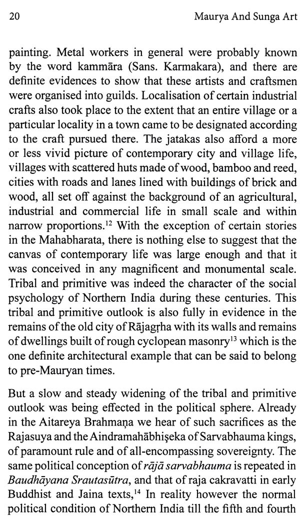 Recent archaeological discoveries and historical researches have pushed the history of India back to at least three thousand years before the birth of Christ. But the first organised art activity in India in bigger scale and durable material that we have any definite knowledge of even to this day and of which datable examples have come down to us in any recognisable number belong to the period of the Mauryas. The chalcolithic age to which belongs the civilisation of the Indus valley has bequeathed to us relics, few in number but varied in subject and treatment, that may safely be said to belong to the domain of high art with a long artistic tradition and experience behind it. Indeed, the art represented by the reliefs on the seals and figure sculptures in the round found at Harappa, Mohenjo-Daro and other sites in the Punjab, Sind, Baluchistan and further north and east is already highly developed, sophisticated and conscious, and expresses most frankly and significantly the culture-ideology of a people urban in upbringing, highly sophisticated in the luxury of living, and probably industrial and feudal in socio-economic organisation. Like the civilisation itself its art also had already reached the creative climax of a tradition. Into the relation of this art with the art of the contemporary civilised world it is not the place to enter; but it must needs be told that this art inspite of its affinities with contemporary Mediterranean art has its own essential qualities and its own character of form that link it with the art of India of the historical period. Yet the fact remains that the art of the Indus valley still largely an unknown factor in so far as it remains chronologically unrelated and unexplained and nothing definite is known of what happened along the arrow of time between the final phase of the Indus valley civilisation and the civilisation that flourished in the Ganges valley more than two thousand years later.