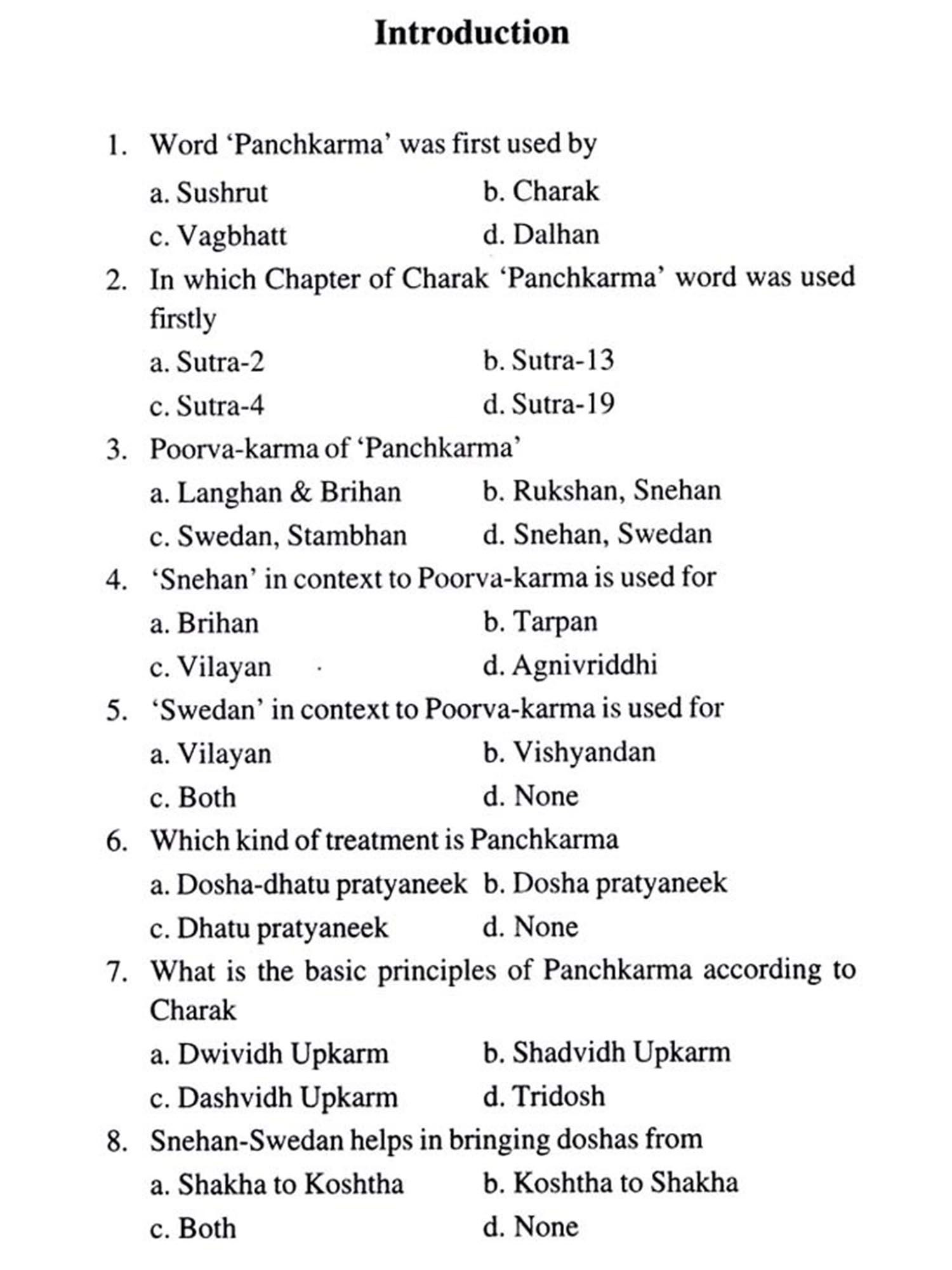 Panchkarma is an integral part of Ayurveda. Although it is not mentioned separately in Ashtang Ayurved but it is used and highly glorified in all the branches of Ayurveda. This book is a humble attempt to put the light on the important questions and topics of Panchkarma which are beneficial not only for Undergraduates, but also for PG, PhD and all Ayurvedic exam aspirants too.