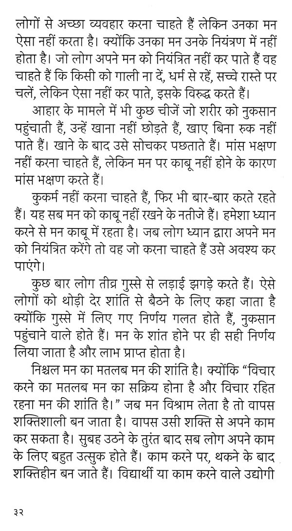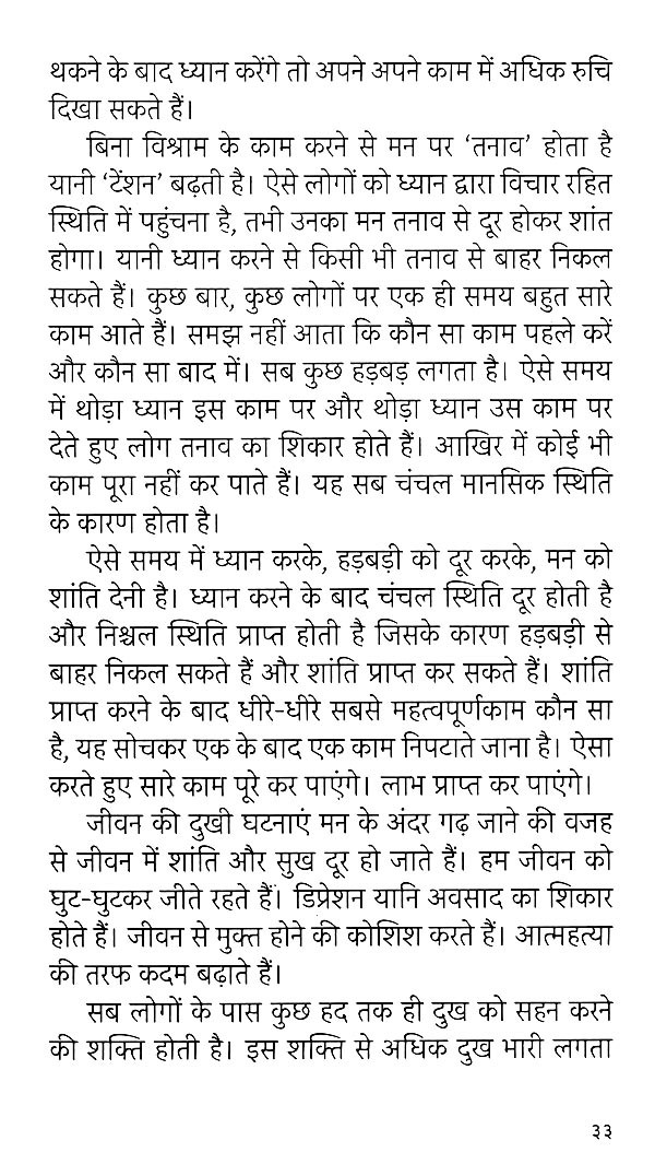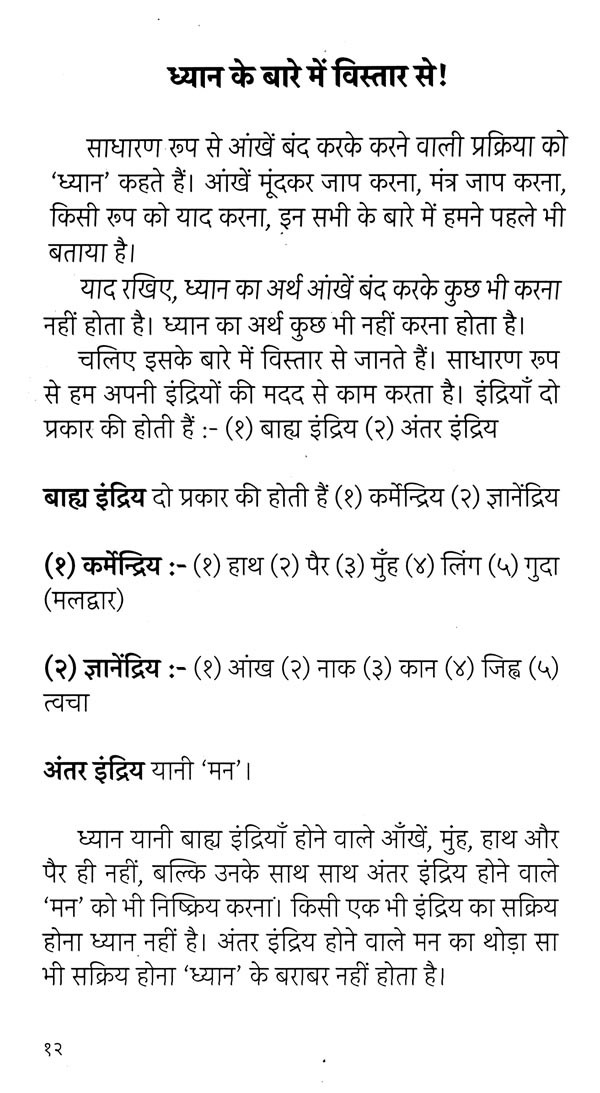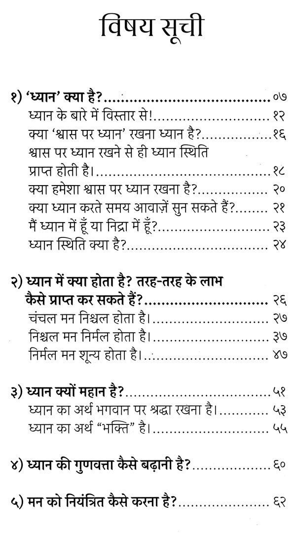 आप जानेंगे कि ध्यान कैसे मन को नियंत्रित करता है, ध्यान में आने वाली बाधाओं को कैसे दूर किया जाए, और ध्यान की गुणवत्ता को कैसे बढ़ाया जाए। पुस्तक में विभिन्न साधना विधियों, उनके महत्व और उनसे मिलने वाले लाभों के बारे में बताया गया है। यह पुस्तक आपको ध्यान के माध्यम से जीवन की गहरी समझ प्राप्त करने और आत्मिक शांति व आनंद की ओर अग्रसर होने का अवसर प्रदान करती है।