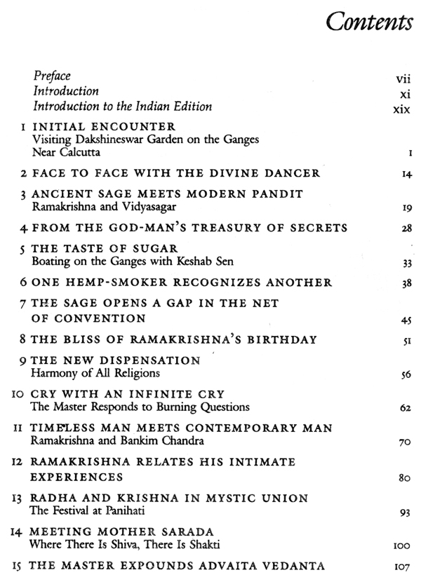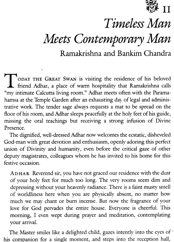 BY MEETING RAMAKRISHNA, which is possible here and now, we enter a unique realm of experience where the Wisdom Goddess reigns—the one Ramakrishna calls my blissfid Mother. The wonderful nature of this realm cannot be analyzed, yet it describes itself. The present volume contains that mysterious description—not only in words, which are merely instruments, but as the living presence of Ramakrishna Paramahamsa, the Great Swan, the God-intoxicated sage of Bengal. We are peacefully gathered together, beyond the reach of philosophy or theology, here in the sage's room at the Dakshineswar Temple Garden beside the sacred river Ganges. Joyfully we contemplate and participate in his adventuresome life and animated conversations. The details are concrete, cultural, earthly. Yet they achieve the impossible—they transmit the experience of supreme Reality.