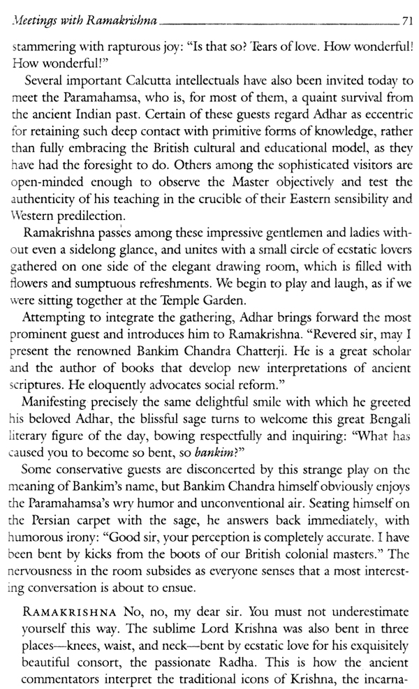 Meetings with Ramakrishna is a dramatic retelling for contemporary Westerners, of a series of encounters with the great Bengali sage Ramakrishna (1836-1886), who proclaimed the oneness of all religions and the worship of the blissful Divine Mother. By turn playful, brilliant, tender and visionary, Ramakrishna offers practical instruction, inspiration and thrilling glimpses into his state of spiritual intoxication as he meets with devotees and visitors in his room beside the holy river Ganges.
