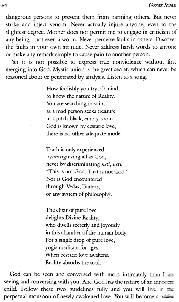Ramakrishna is the parantahamsa, or Great Swan, who can separate out the milk of Truth which has become diluted by the water of personal and cultural habits, opinions, and conventions. As the blissful sage proclaims: "Some persons have heard about milk, others have seen milk, while others have actually tasted milk. Still others can drink milk whenever they wish and can offer it freely to humankind." May we ascend together through these four levels of maturity, described so simply by the God-intoxicated child of Bengal.
