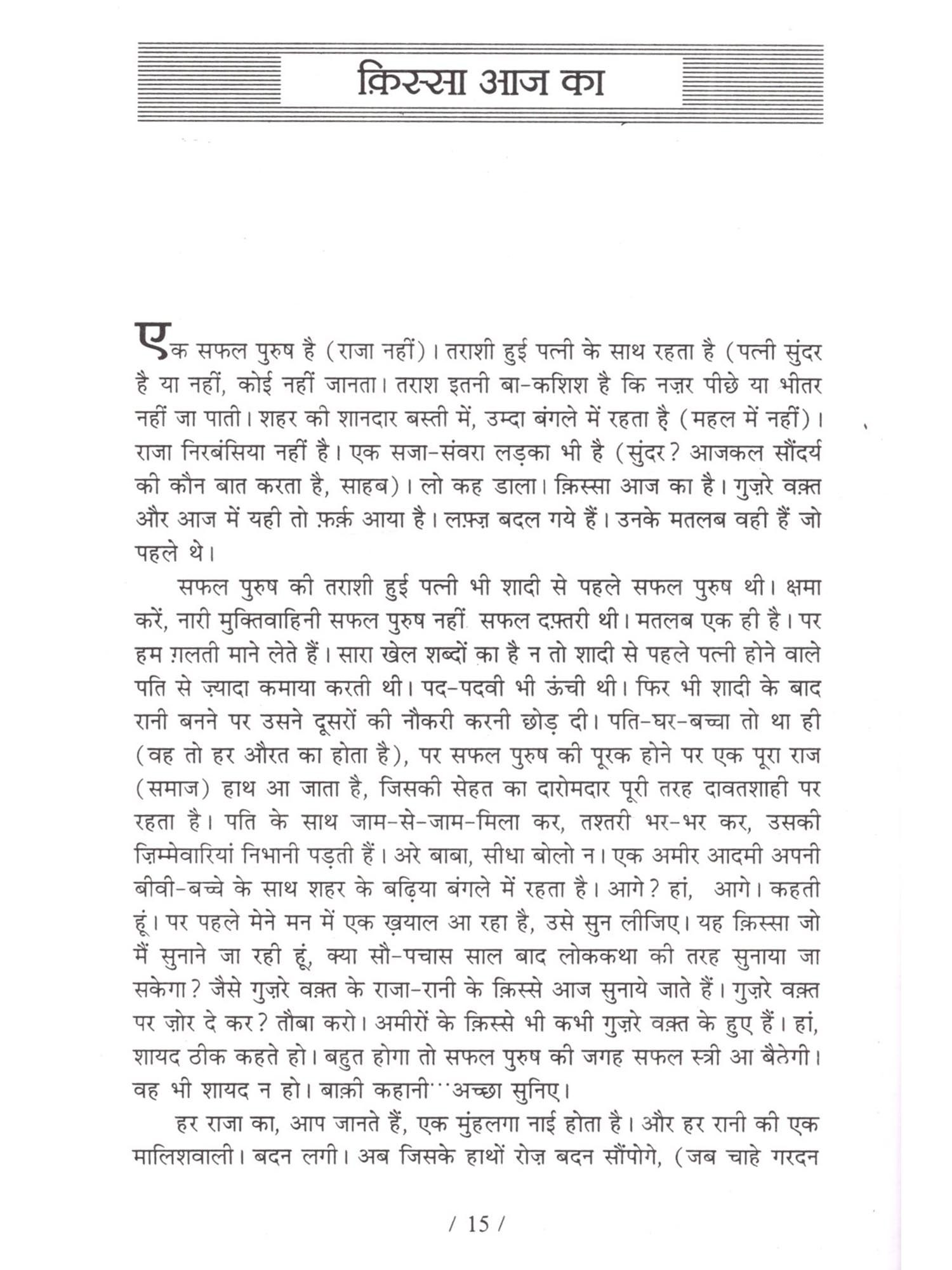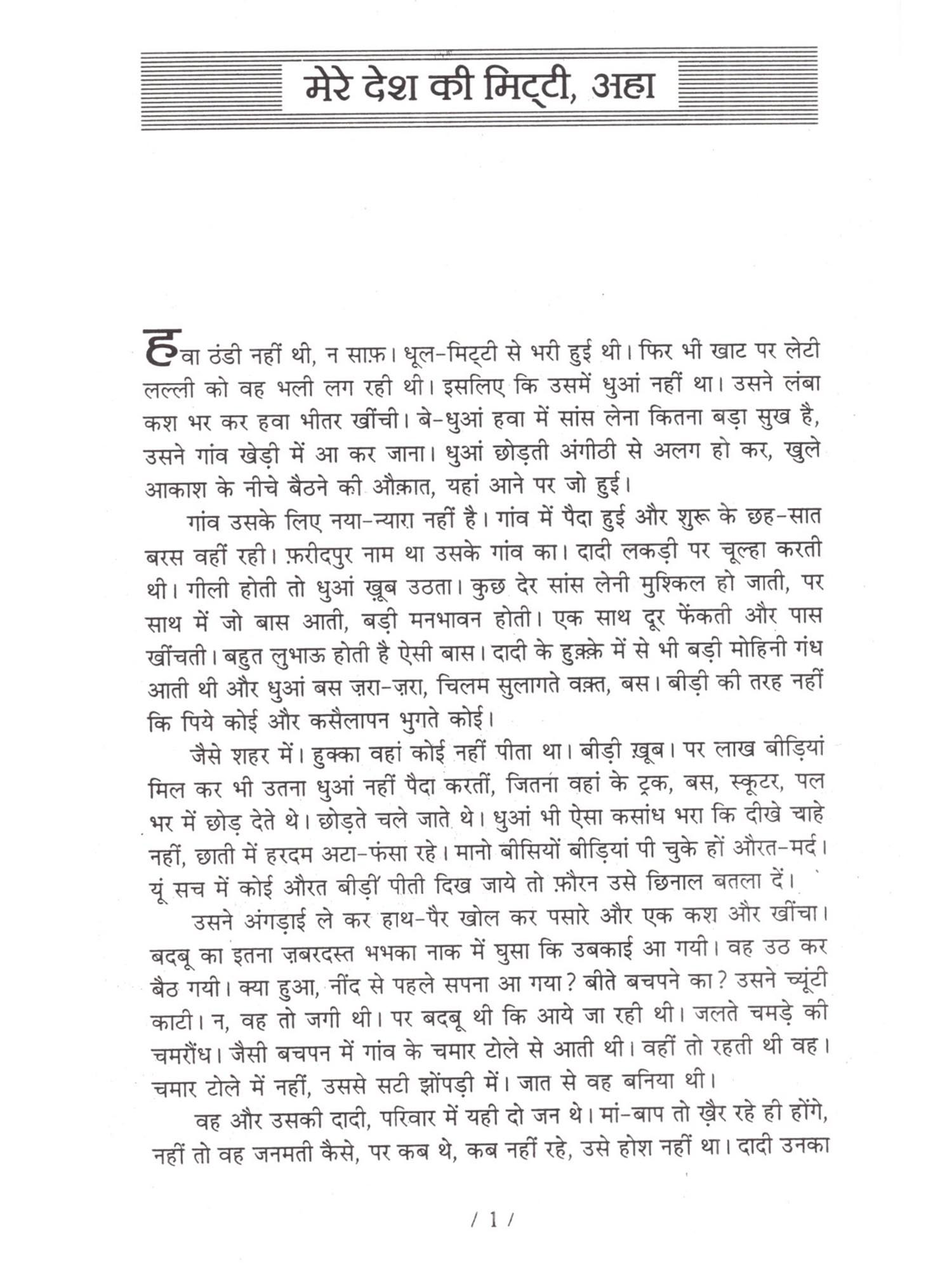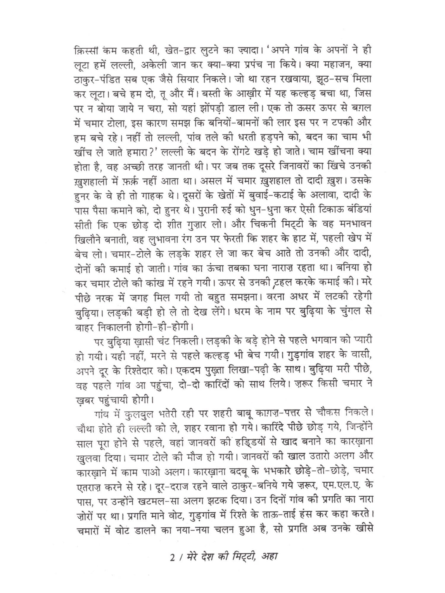 मेरे देश की मिट्टी, अहा 1992 के बाद से मृदुला गर्ग की कहानियों में व्यंग्य और फंतासी के पुट बढ़ गये हैं। या कहें कि पाश्र्व से निकल कर वे मंच पर आ गये हैं और प्रमुख भूमिकाएं निभाने लगे हैं। हास्य, व्यंग्य व फंतासी का उद्गम त्रासदी में होता है। त्रासदी को झेल कर, निर्वेद तक पहुंचने के लिए, जिस निस्संगता की जरूरत होती है, वह इन्हीं के माध्यम से अर्जित की जाती है। मृदुला गर्ग की कहानियां इसी निस्संगता को अर्जित-सर्जित करती हैं और इस प्रक्रिया में जीवन के समरूप नाटक में से हो कर गुजरती हैं। हम सब जानते हैं कि जब जीवन जीना अत्यधिक कष्ट कर हो जाता है, तब जीने का नाटक करना पड़ता है। इस नाटक में त्रासदी को भी कौतुक के साथ झेलना पड़ता है। मेरे देश की मिट्टी, अहा पीड़ा में हँसना और हँसते-हँसते पीड़ा में संगमित हो जाना, यही इन कौतुक प्रधान कहानियों का सत्त्व है।