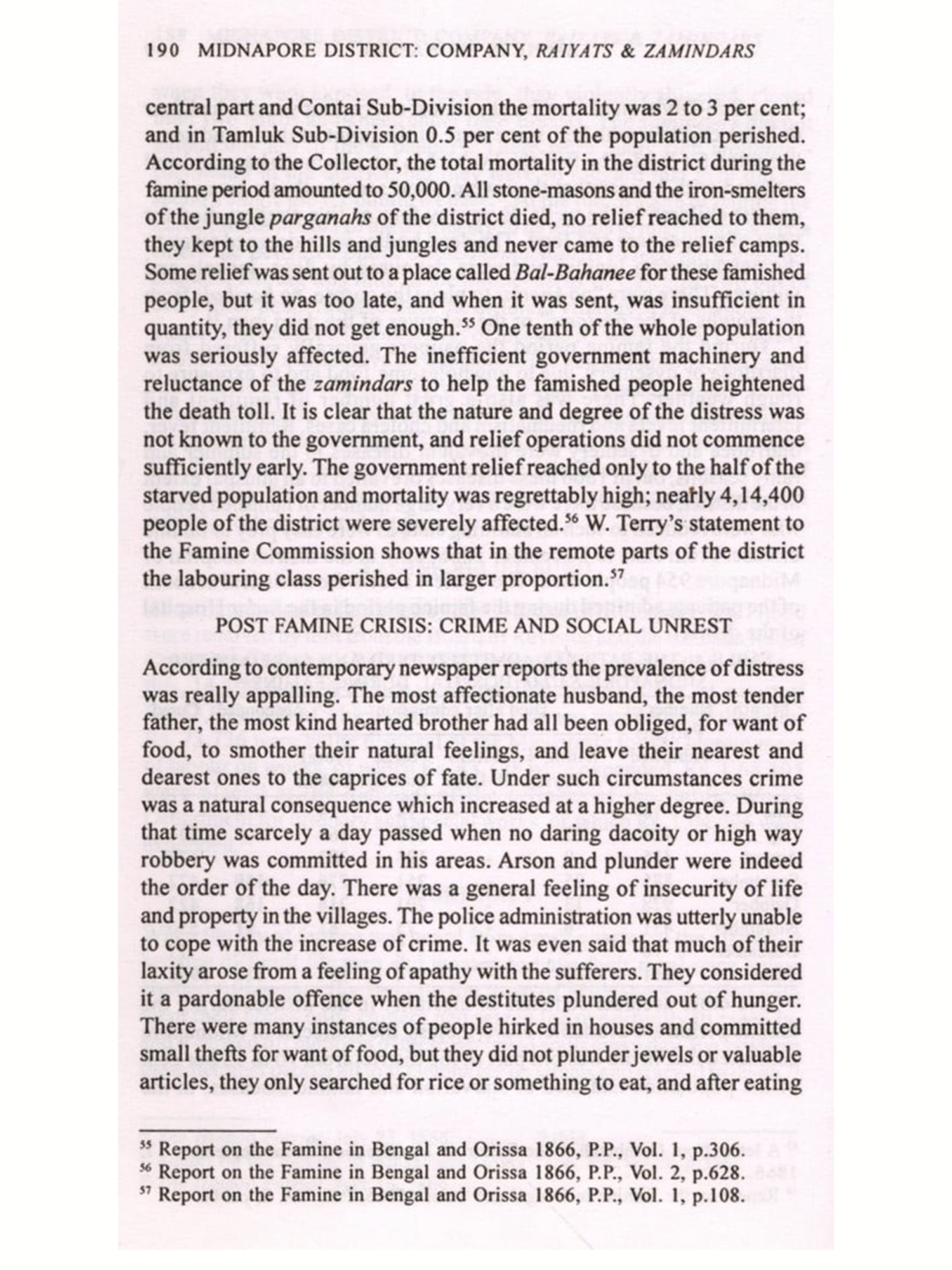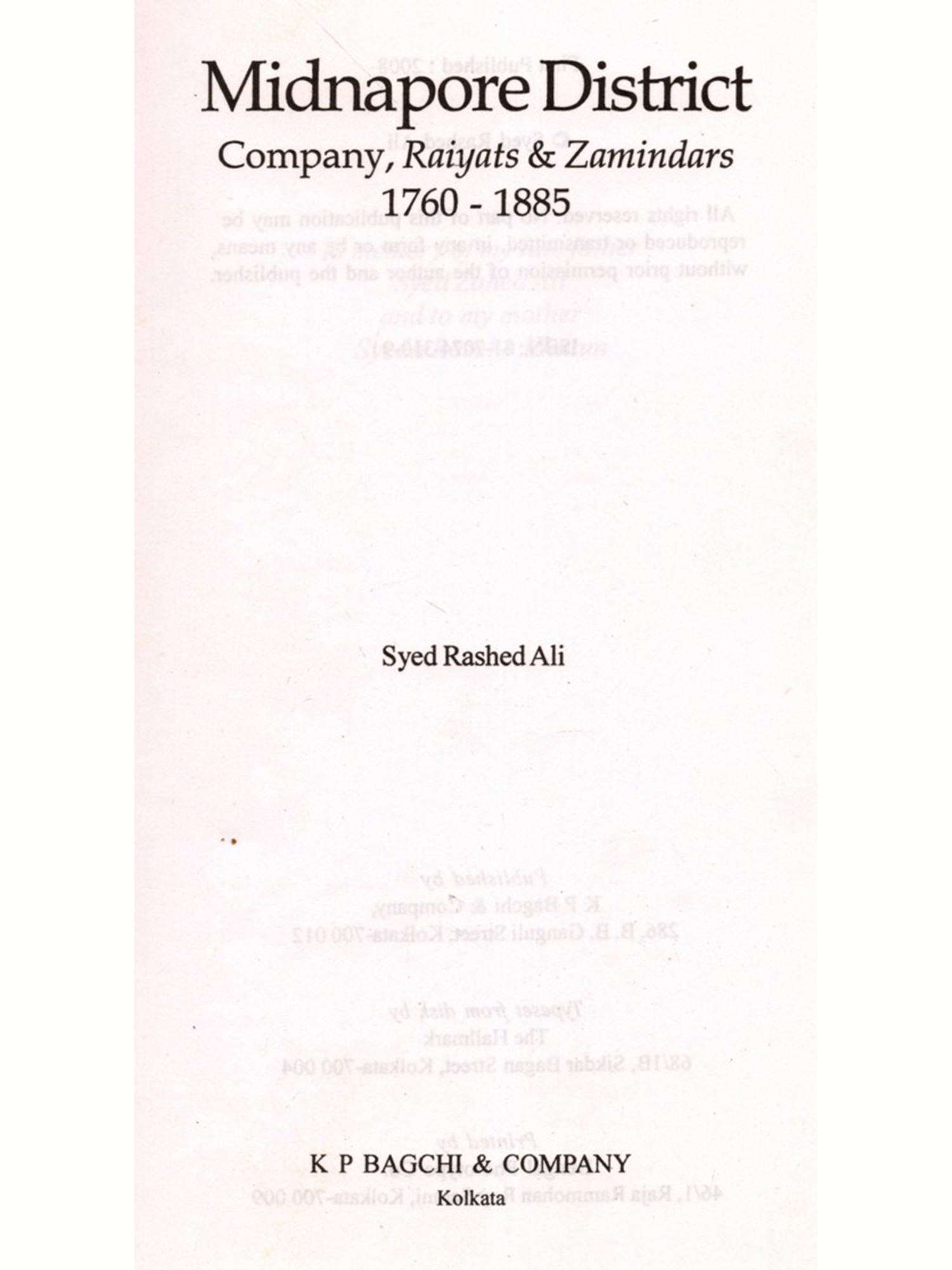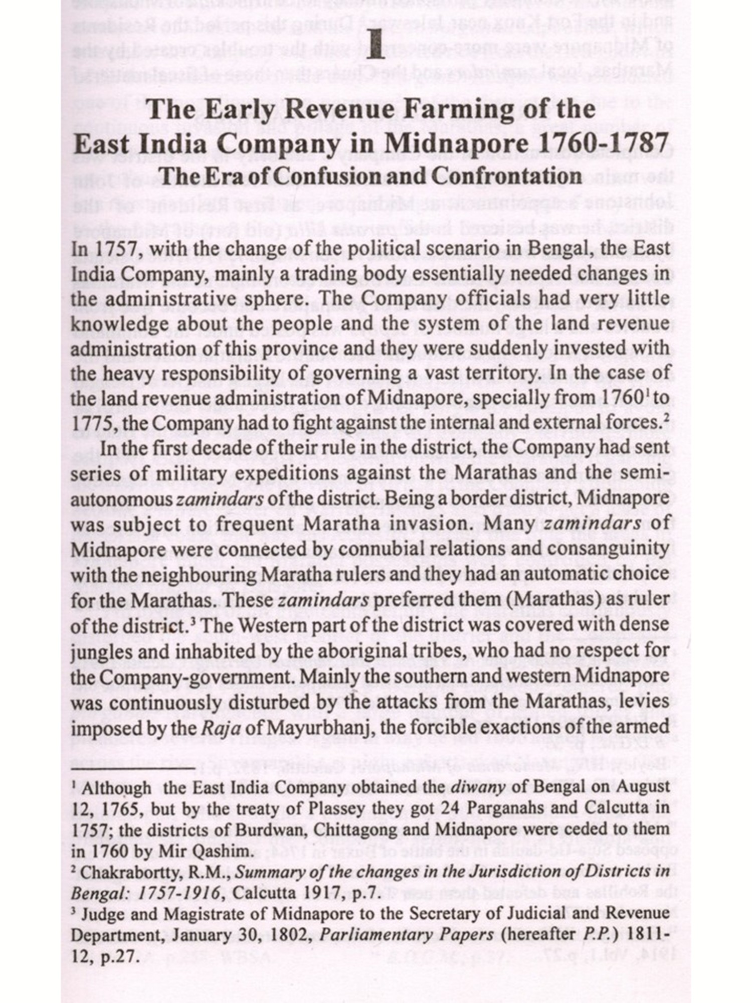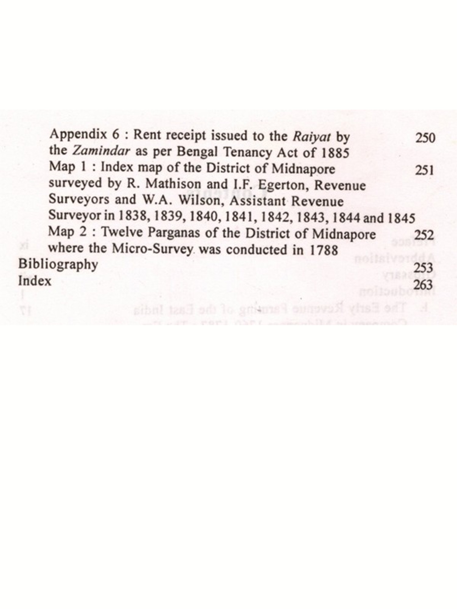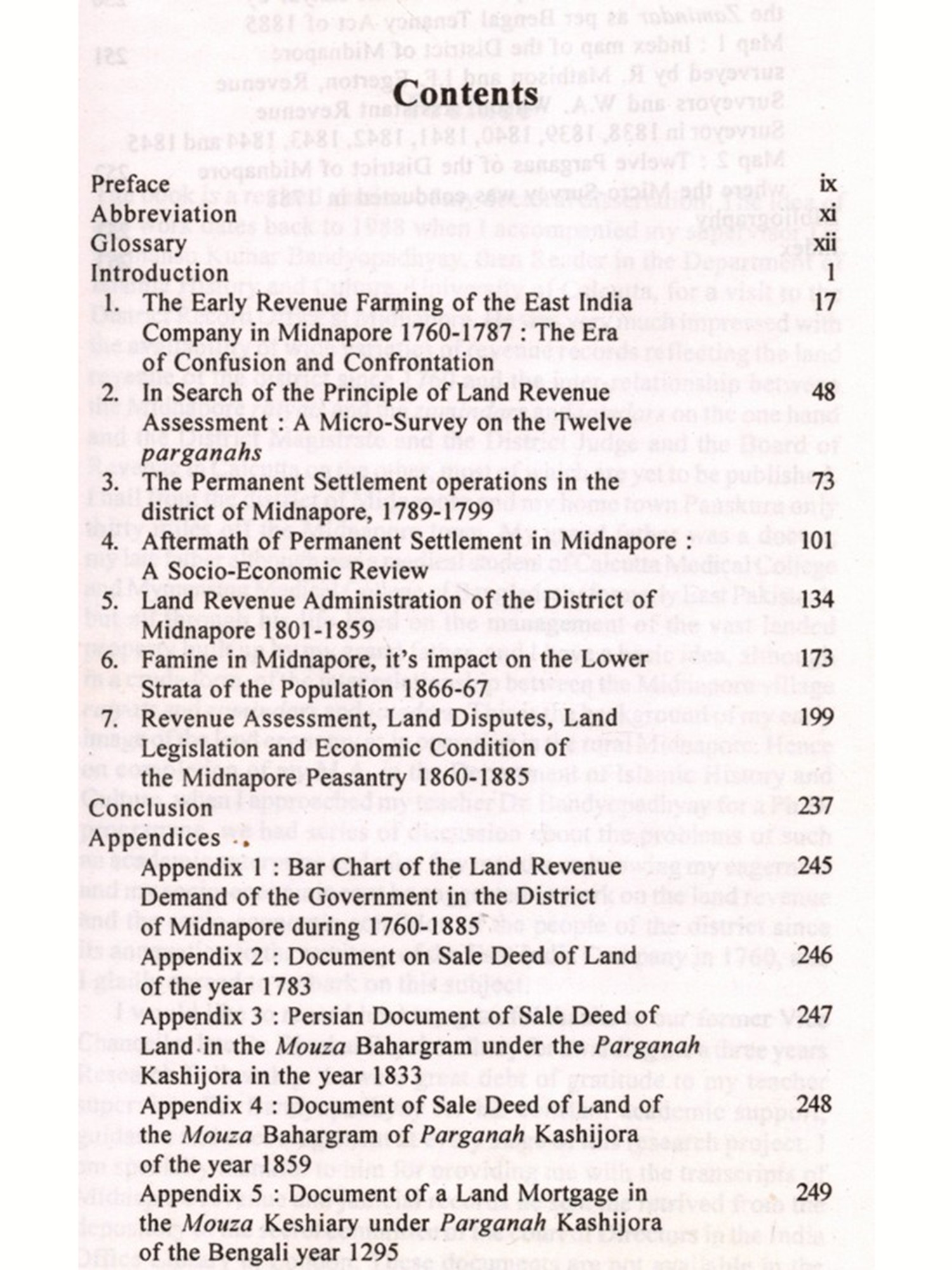 The book is a revised version of my doctoral dissertation. The idea of this work dates back to 1988 when I accompanied my supervisor Dr. Premansu Kumar Bandyopadhyay, then Reader in the Department of Islamic History and Culture, University of Calcutta, for a visit to the District Record Office at Midnapore. He was very much impressed with the availability of wide varieties of revenue records reflecting the land revenue of the district since 1760 and the inter-relationship between the Midnapore raiyats and the zamindars and jotters on the one hand and the District Magistrate and the District Judge and the Board of Revenue in Calcutta on the other, most of which are yet to be published. I hail from the district of Midnapore and my home town Panskura only thirty miles off the Midnapore town. My grand father was a doctor; my late father although was a medical student of Calcutta Medical College and Mymensing Medical College of Bangladesh (formerly East Pakistan), but all through his life lived on the management of the vast landed property built up by my grand father, and I have a basic idea, although in a crude form, of the inter relationship between the Midnapore village raiyats and zamindars and jotedars. This is the background of my early image of the land economy as in operation in the rural Midnapore. Hence on completion of my M.A. in the Department of Islamic History and Culture, when I approached my teacher Dr. Bandyopadhyay for a Ph.D. programme, we had series of discussion about the problems of such an academic enterprise and after few months on knowing my eagerness and my socio-economic root he suggested to work on the land revenue and the socio-economic condition of the people of the district since its annexation to the territory of the East India Company in 1760, and I gladly agreed to embark on this subject.