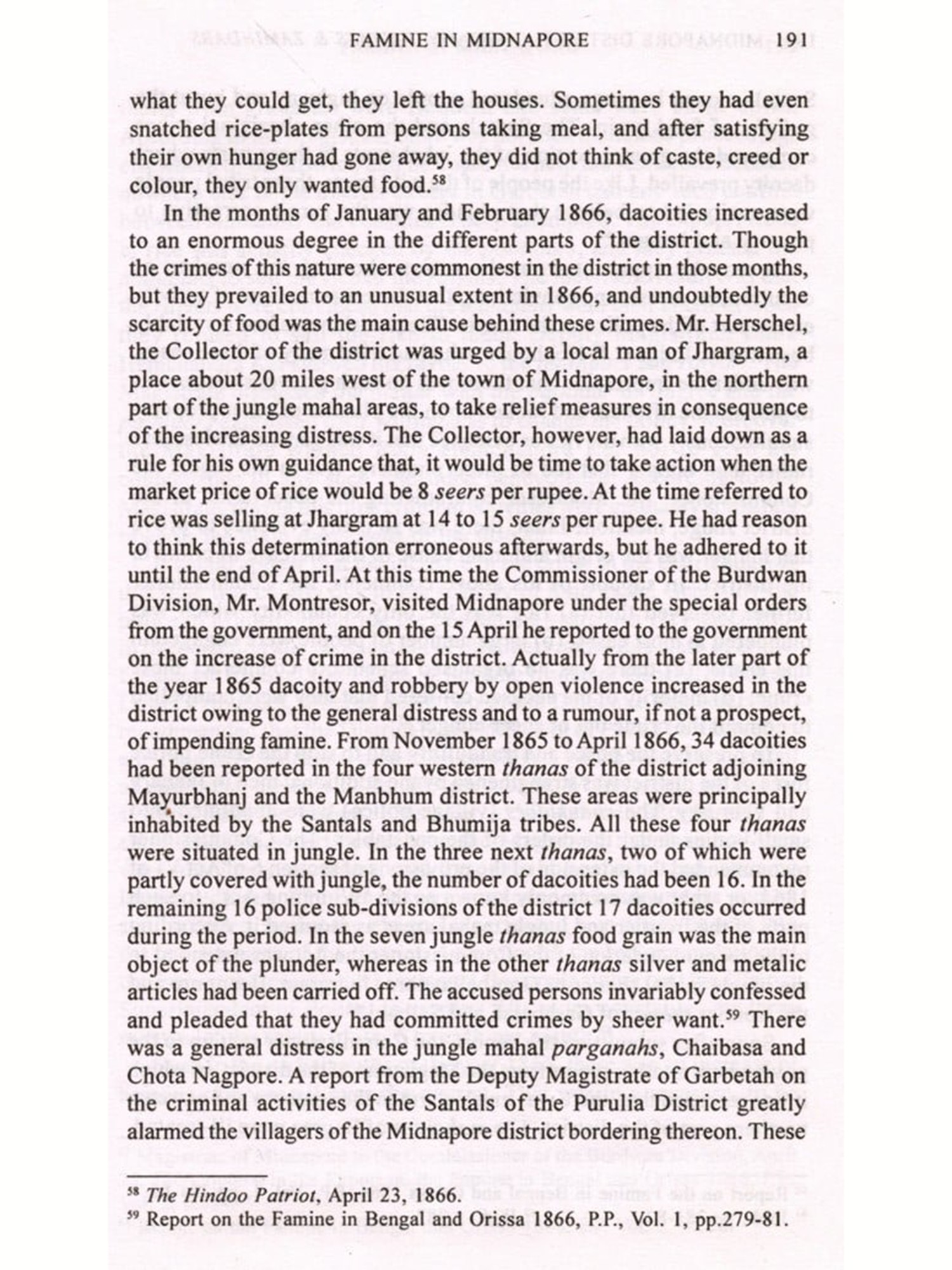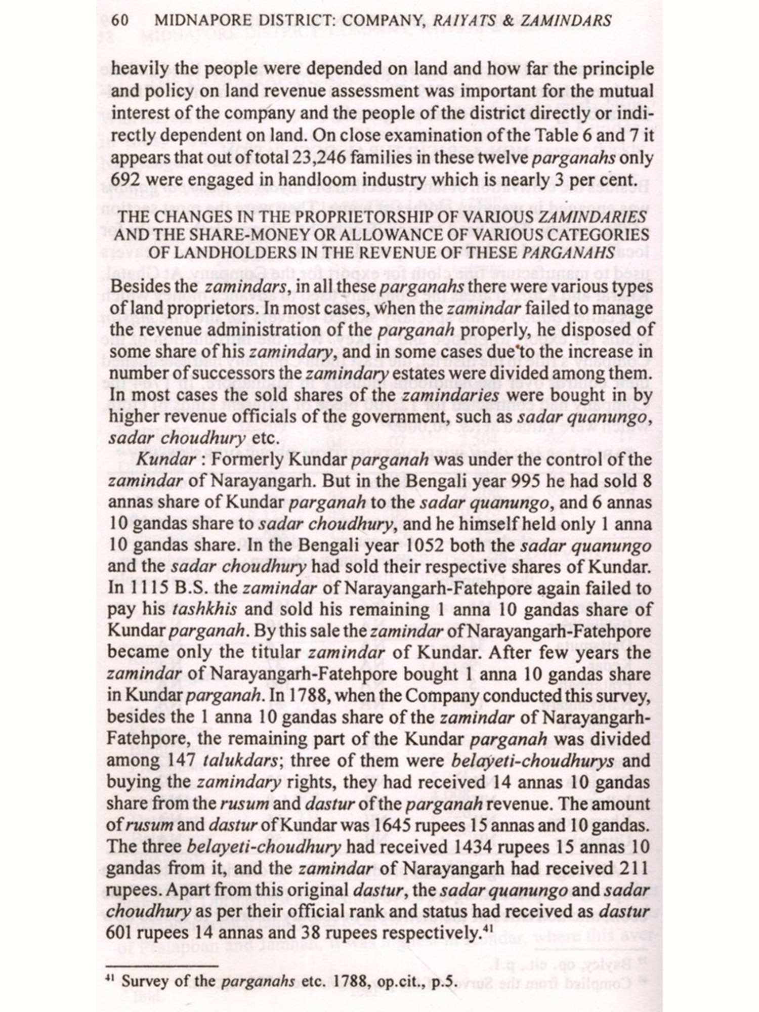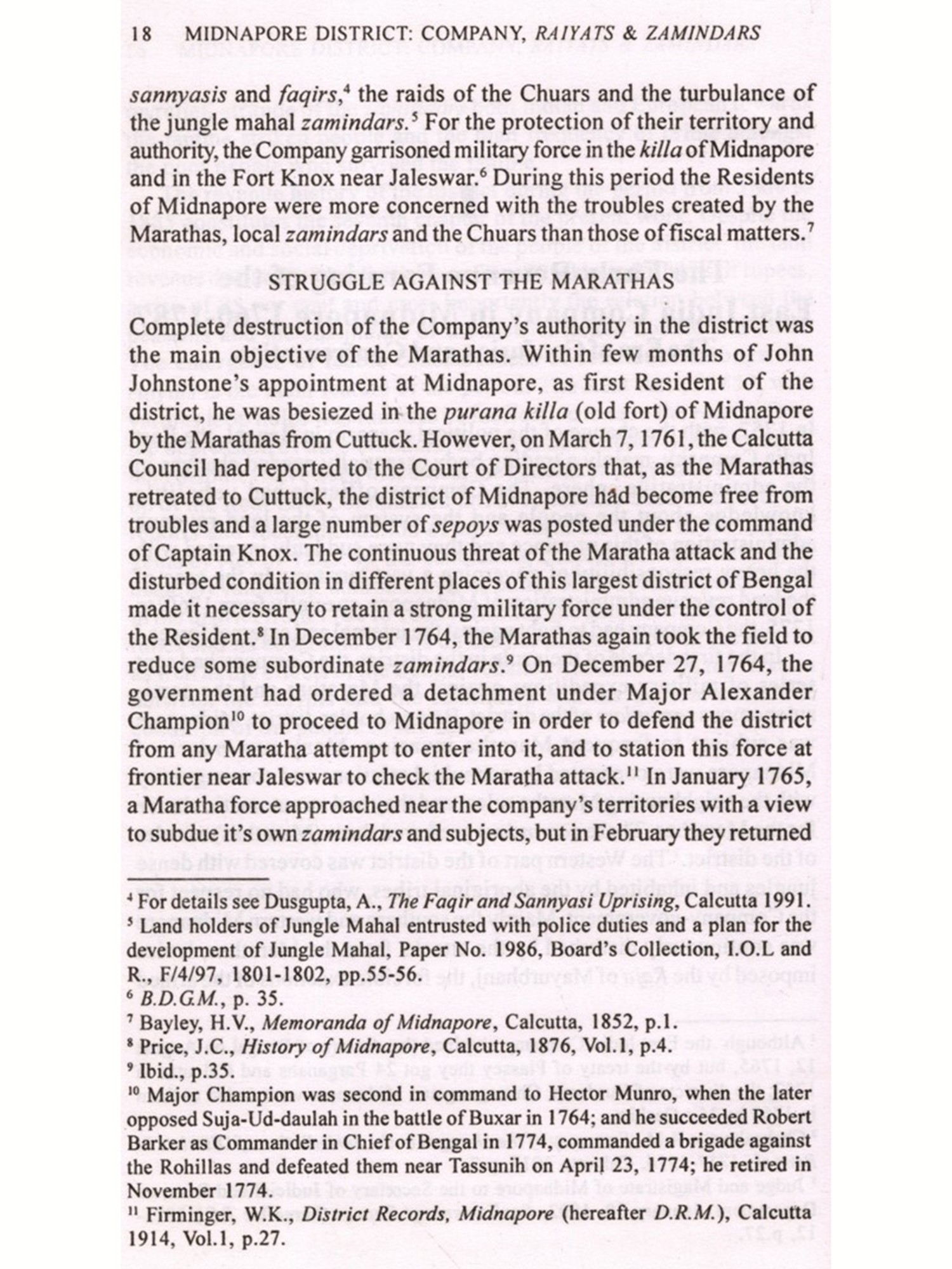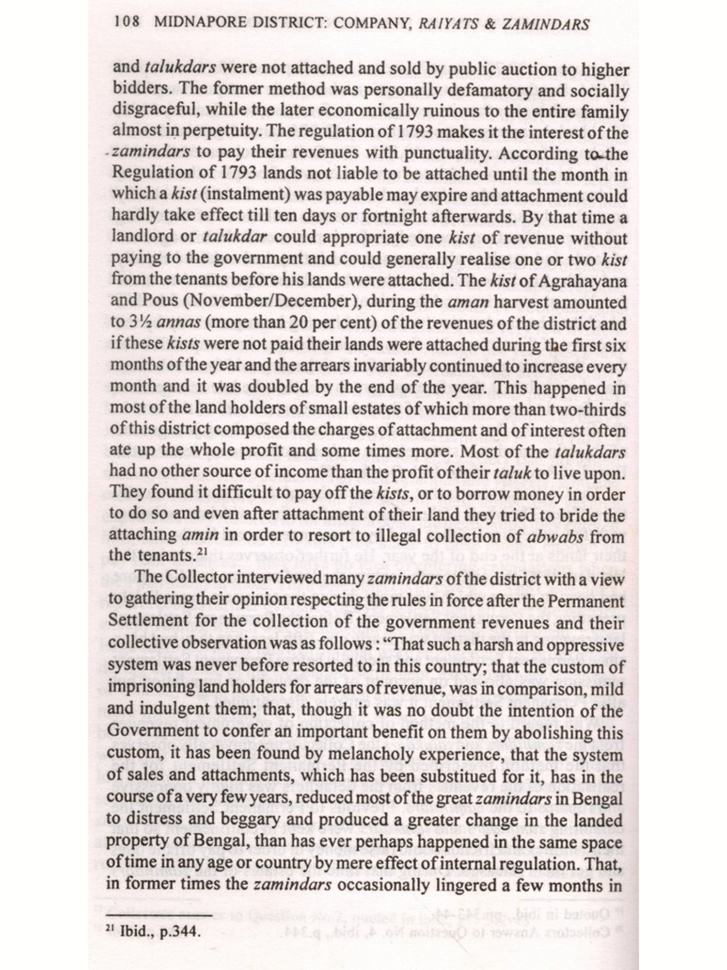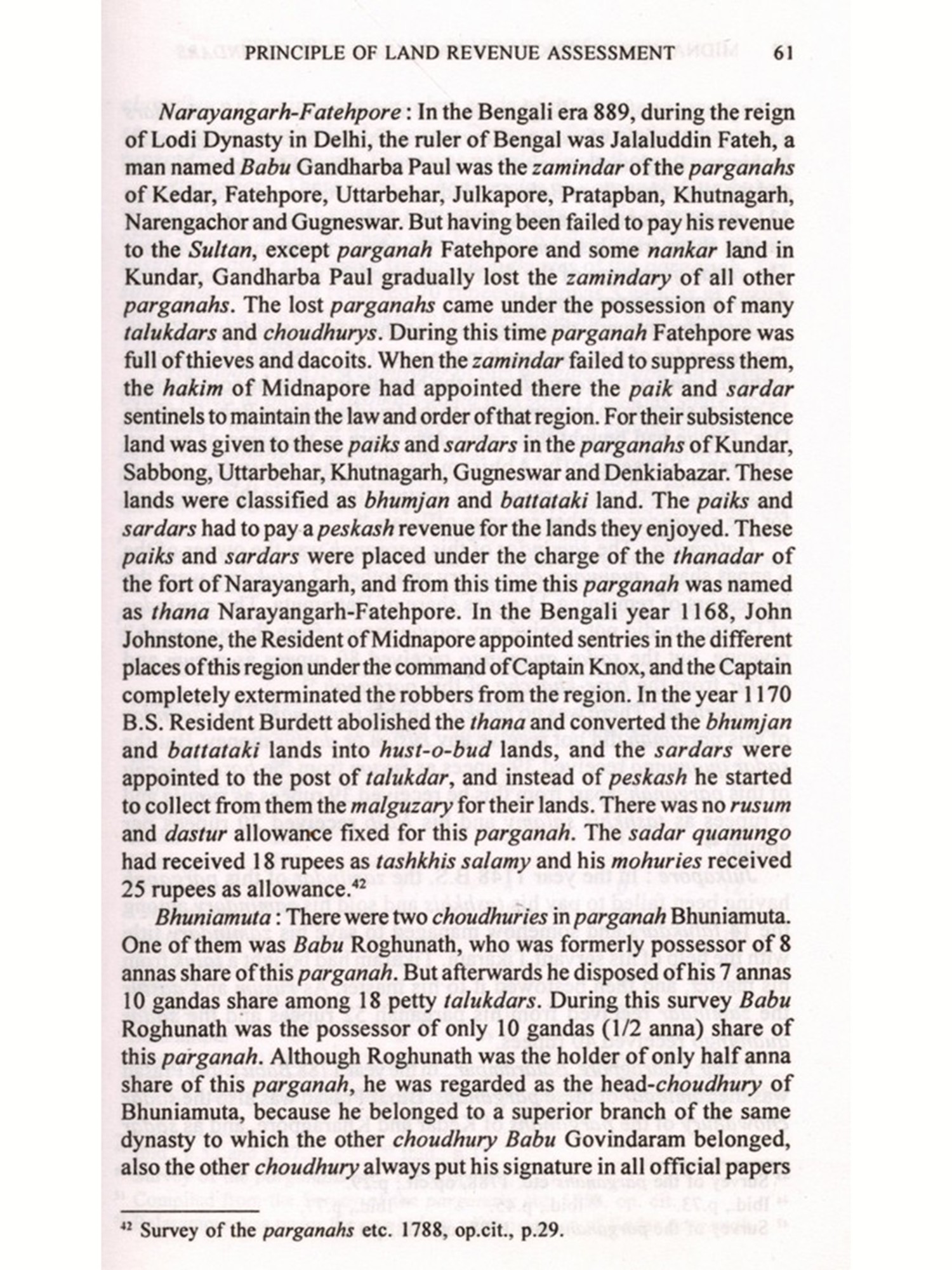 The book is a revised version of my doctoral dissertation. The idea of this work dates back to 1988 when I accompanied my supervisor Dr. Premansu Kumar Bandyopadhyay, then Reader in the Department of Islamic History and Culture, University of Calcutta, for a visit to the District Record Office at Midnapore. He was very much impressed with the availability of wide varieties of revenue records reflecting the land revenue of the district since 1760 and the inter-relationship between the Midnapore raiyats and the zamindars and jotters on the one hand and the District Magistrate and the District Judge and the Board of Revenue in Calcutta on the other, most of which are yet to be published. I hail from the district of Midnapore and my home town Panskura only thirty miles off the Midnapore town. My grand father was a doctor; my late father although was a medical student of Calcutta Medical College and Mymensing Medical College of Bangladesh (formerly East Pakistan), but all through his life lived on the management of the vast landed property built up by my grand father, and I have a basic idea, although in a crude form, of the inter relationship between the Midnapore village raiyats and zamindars and jotedars. This is the background of my early image of the land economy as in operation in the rural Midnapore. Hence on completion of my M.A. in the Department of Islamic History and Culture, when I approached my teacher Dr. Bandyopadhyay for a Ph.D. programme, we had series of discussion about the problems of such an academic enterprise and after few months on knowing my eagerness and my socio-economic root he suggested to work on the land revenue and the socio-economic condition of the people of the district since its annexation to the territory of the East India Company in 1760, and I gladly agreed to embark on this subject.