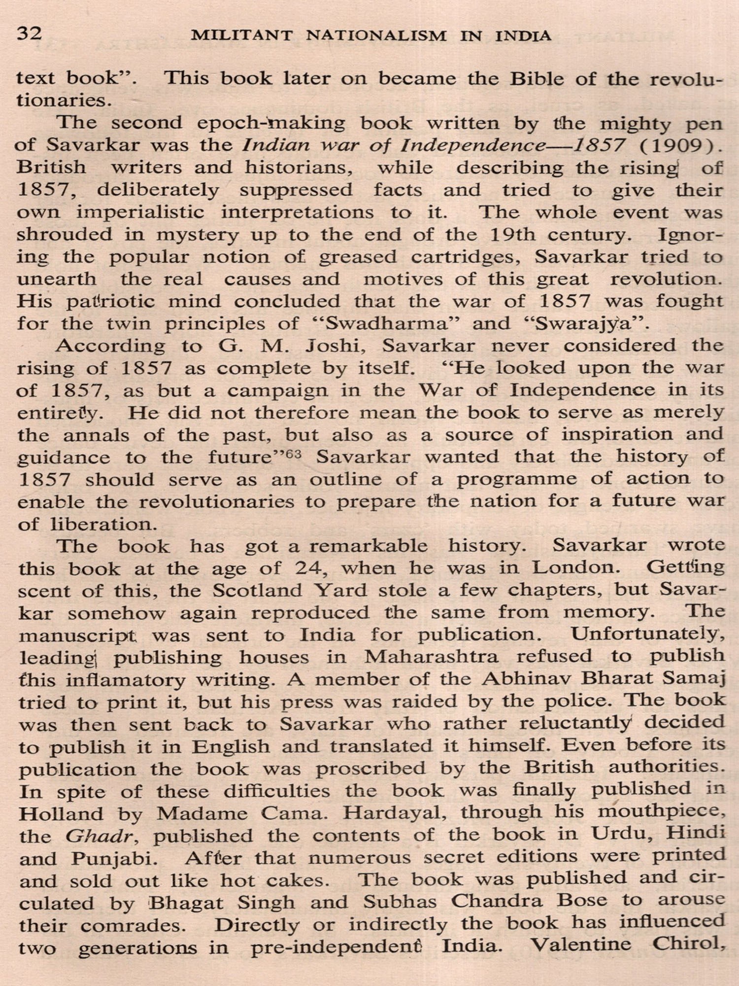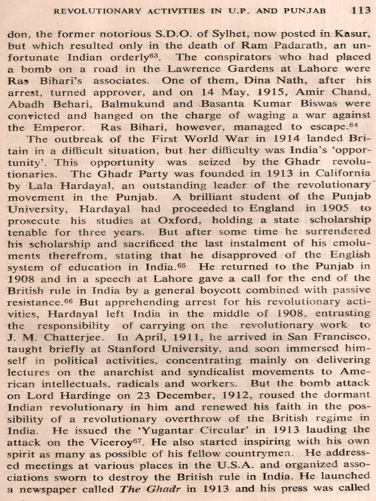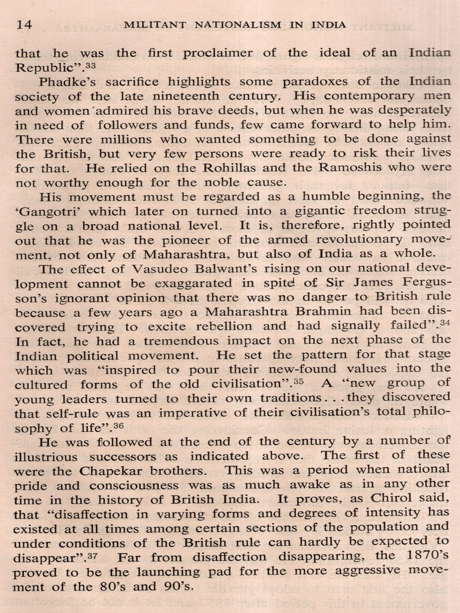 The hundred years following the battle of Plassey (1757) saw the expansion and consolidation of British rule in the Indian sub-continent. But almost from its inception the British domination was challenged by a large number of local risings and civil disturbances in different parts of the country. The general cause of disaffection was the overthrow of the old political order which affected not only the princely families but also feudal nobles, disbanded soldiers and, to some extent, the common people. The displaced rulers and feudal lords naturally tried to recover the lost ground, and in some cases they were supported by their subjects. Then again, the new revenue systems, laws and administrative institutions introduced by the British in the annexed territories caused widespread dis-location, and it was only natural that the affected interests would resist in some way or other. Historians have divided these risings broadly into four categories. In the first place, dispossessed princes and powerful landlords tried from time to time to recover their lost properties and privileges. "The risings of the Rajas of Vizianagram (1794) and the Poligars of Kurnul (1801-05), the Ramosi risings of Maharashtra led by the local chiefs (1826-29), the rebellion of Velu Tampi in Travancore (1808-09), the insurrection of Wazir Ali in Oudh (1799) etc. indicate a continuous trend which reached its culmination in the leadership of Nana Saheb and Lakshmi Bai in the 'Mutiny' of 1857". In the second place, there were tribal risings, caused generally by the harsh administrative rules and regulations introduced by the British rulers and the economic exploitation by the landlords, merchants and money-lenders who entered the tribal areas in the wake of the British. The ignorant and unsophisticated tribals could be exploited more easily than the villagers in the regularly administered areas, but they also were bound to react after an initial period of bewilderment and confusion. Such were the risings of the Chuars of the Jungle Mahals in Bengal (1799), the Hos, Kols and Mundas of Bihar (1831-32), the Santals of Chhotanagpur (1855-56), the Khonds of Orissa (1846), the Khasis of Assam (1829-33) and the Bhils of Gujarat (1818-31).