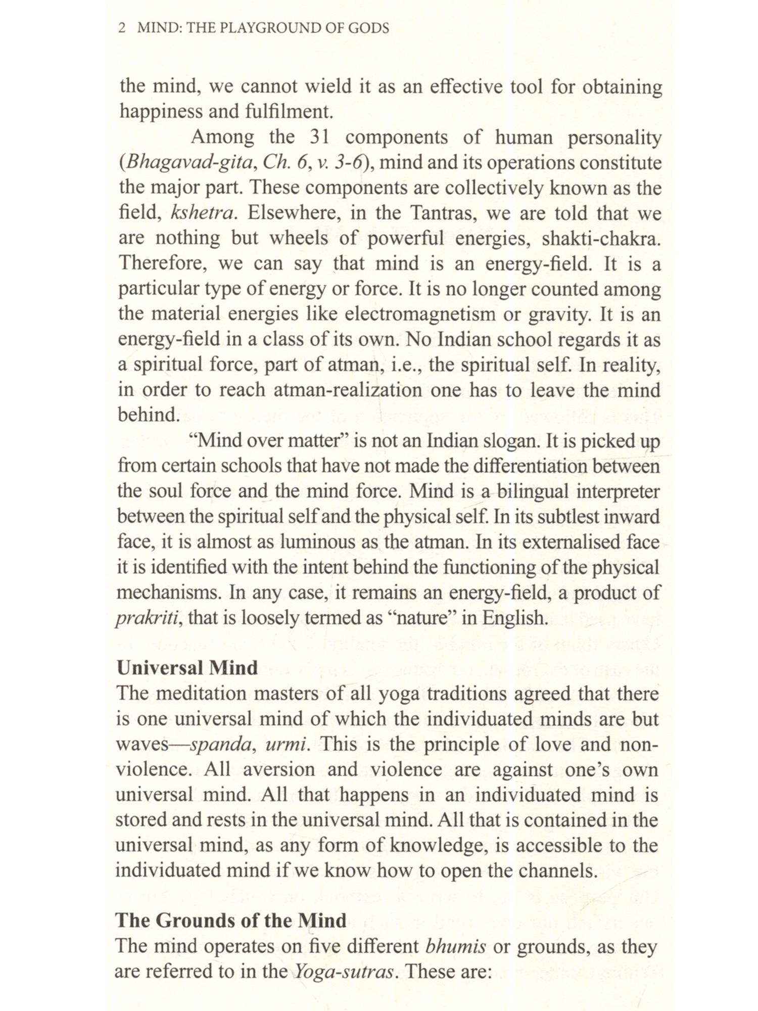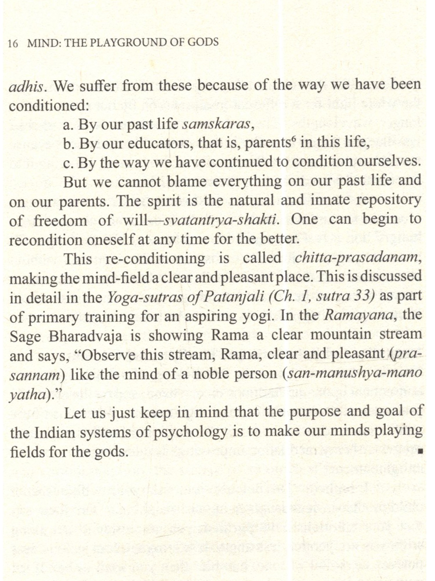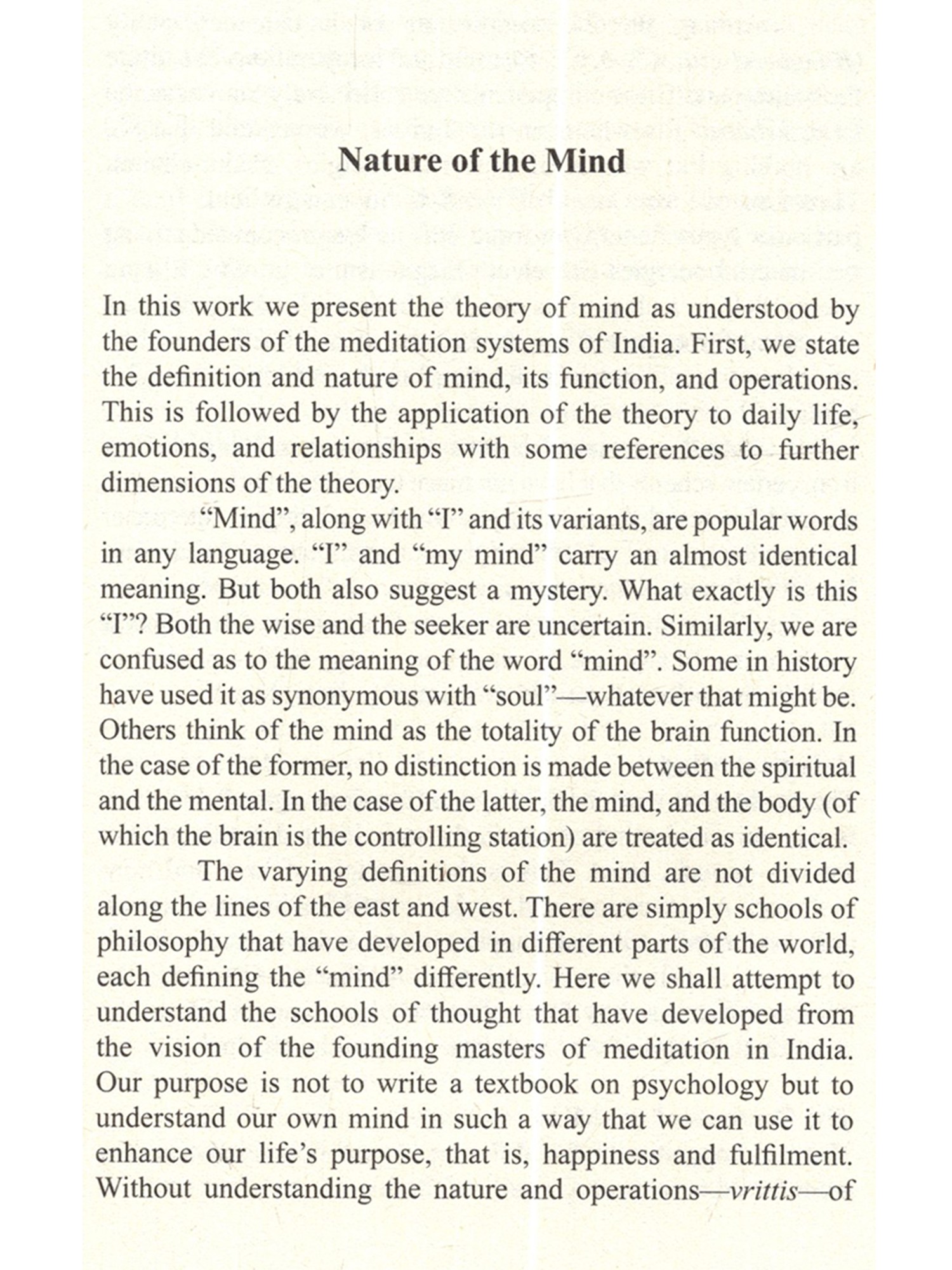 Poor much maligned mind! My mind is helter-skelter. My mind is disturbed, never at peace. I cannot concentrate my mind. My mind misled me... One often hears such complaints about mind. This mind has been made out to be some unruly devil that has occupied our interior and is devoted to spoiling our life in every which way. We have never befriended our mind, never talked to this interior friend soothingly, given it good advice, gently nudging it toward the streams of serenity that flow incessantly within us. The saint-poets of India, however, have understood its secret. They have composed and sung thousands of songs addressed to the mind soothingly and lovingly. We hope that some day a skilled poet will translate these songs in a collection perhaps titled SONGS TO THE MIND. It is the mind that has created the Shakespeares and Einsteins, Yajnavalkyas and Patanjalis of the world, the saints and rishis, and ever self-sacrificing mothers. Our purpose here is to show how this much maligned "devil's workshop" mind can be restored to its primary and pristine nature where gods play, sing and frolic. How can it show its full glory, granting us a glowing and serene personality that becomes the medium for the peace of devas, the shining ones whose bodies are made of light. This is by no means to discuss the mind in an academic style. Reading it will not make you an expert in Sankhya-Buddhist-Yoga theories of mind, nor will it make you a professional therapist. That is not its purpose. However, it points the way whereby you may make your mind a beautiful and pleasant place. Once you begin to achieve that goal, whoever enters the space of the extensions of your mind your verbal and non-verbal communications, relationships, and actions will simply want to sit in that space and gaze at the beauty of your mind, a beauty that will be exuded like fragrance in your very presence. You will be loved as all the saints and prophets of yore have been loved by uncountable millions. It is within the powers of your mind to make you such a beautiful child of divinity. May you discover that your mind was always a playground of the gods; may it ever remain so.