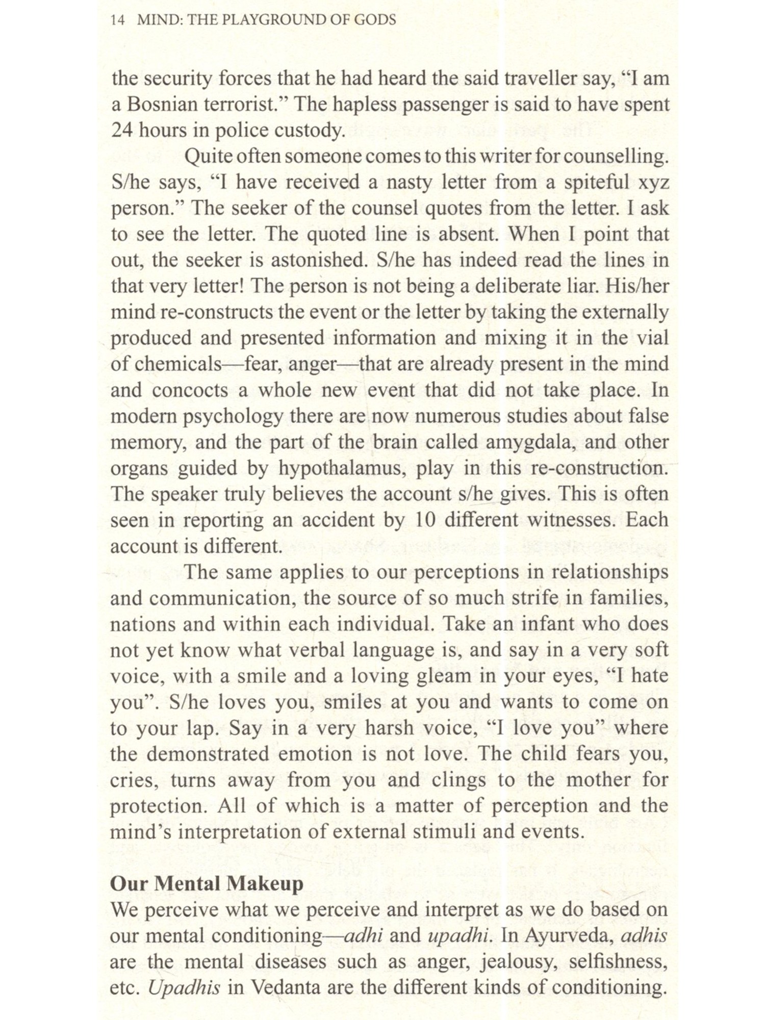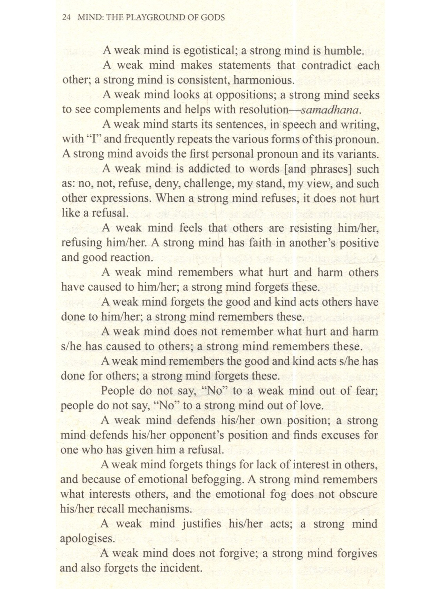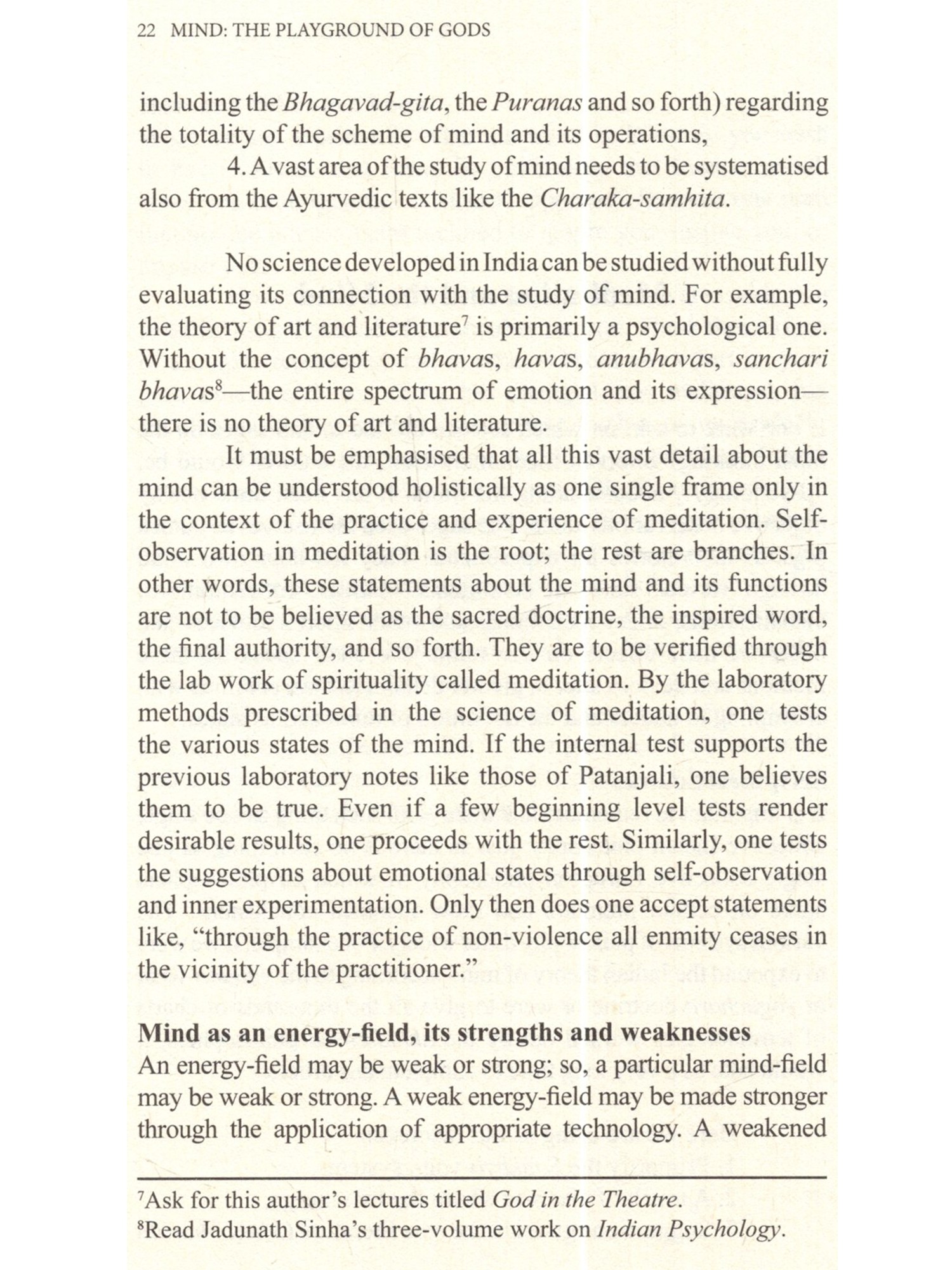 Poor much maligned mind! My mind is helter-skelter. My mind is disturbed, never at peace. I cannot concentrate my mind. My mind misled me... One often hears such complaints about mind. This mind has been made out to be some unruly devil that has occupied our interior and is devoted to spoiling our life in every which way. We have never befriended our mind, never talked to this interior friend soothingly, given it good advice, gently nudging it toward the streams of serenity that flow incessantly within us. The saint-poets of India, however, have understood its secret. They have composed and sung thousands of songs addressed to the mind soothingly and lovingly. We hope that some day a skilled poet will translate these songs in a collection perhaps titled SONGS TO THE MIND. It is the mind that has created the Shakespeares and Einsteins, Yajnavalkyas and Patanjalis of the world, the saints and rishis, and ever self-sacrificing mothers. Our purpose here is to show how this much maligned "devil's workshop" mind can be restored to its primary and pristine nature where gods play, sing and frolic. How can it show its full glory, granting us a glowing and serene personality that becomes the medium for the peace of devas, the shining ones whose bodies are made of light. This is by no means to discuss the mind in an academic style. Reading it will not make you an expert in Sankhya-Buddhist-Yoga theories of mind, nor will it make you a professional therapist. That is not its purpose. However, it points the way whereby you may make your mind a beautiful and pleasant place. Once you begin to achieve that goal, whoever enters the space of the extensions of your mind your verbal and non-verbal communications, relationships, and actions will simply want to sit in that space and gaze at the beauty of your mind, a beauty that will be exuded like fragrance in your very presence. You will be loved as all the saints and prophets of yore have been loved by uncountable millions. It is within the powers of your mind to make you such a beautiful child of divinity. May you discover that your mind was always a playground of the gods; may it ever remain so.