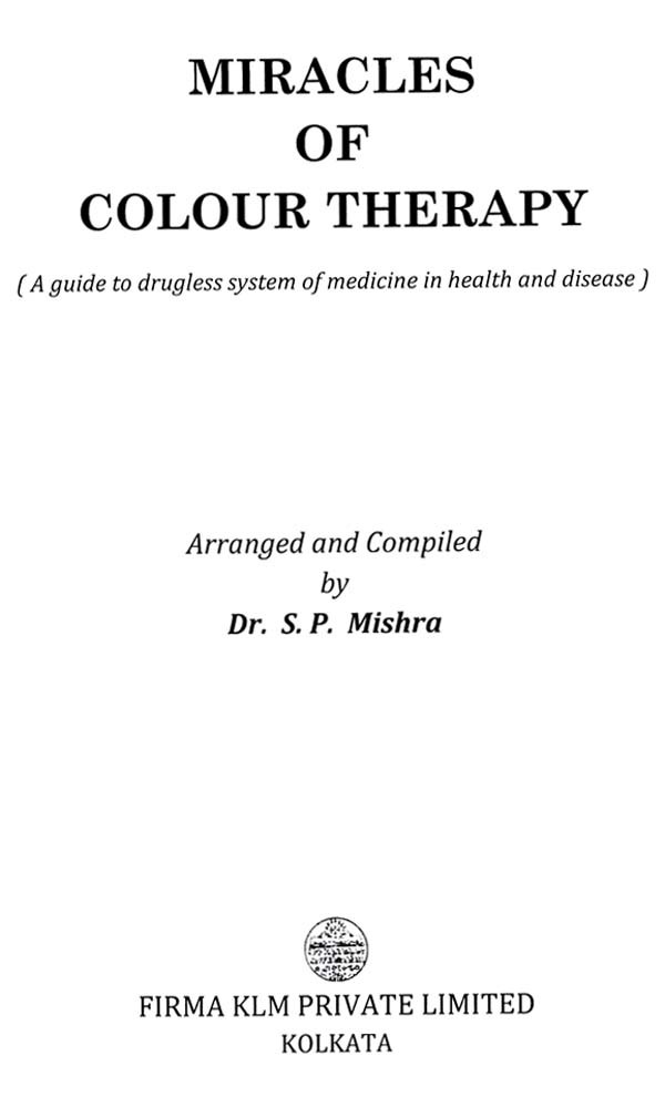 In ancient times Indian mothers used to treat their ailing children themselves at home. But today that old and effective method of treatment has gone out of date. The same can be revived through colour therapy which is by far the cheapest, the mildest and the most effective of all the treatments of diseases now in vogue. The present treatise captioned "Miracles of Colour Therapy" will no doubt help those who believe in the natural way of treating a disease as its lasting benefit have been experienced and enjoyed by thousands since 1885, the year of Dr. J. P. Jha's initiation to this line, (the first chromopath of India).