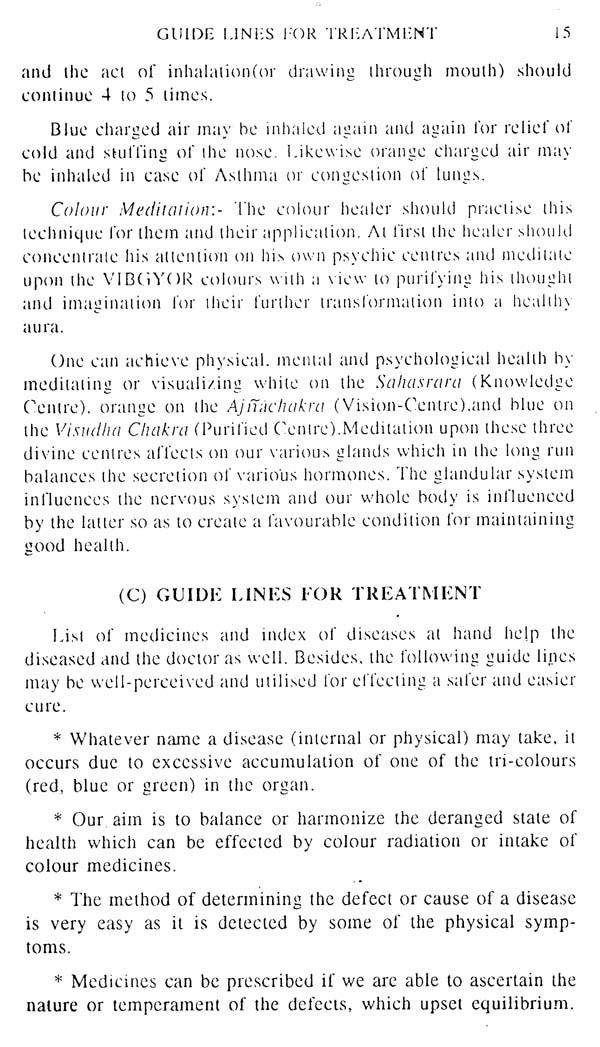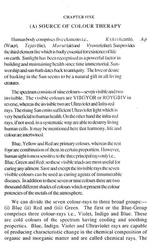 The medicines of modern system of treatment are too costly to be procured by one and all. The complexity of the so called system of effective cure has made our system more complex. As such the cry of the (present) crucial hour is to acquire a cheap but simple method of curing a disease. And colour therapy is a very simple, useful and harmless system of therapeutics, that can serve our need. The coloured rays of the sun are the store house of medicines in micro-form. These can be made available in the lap of nature without paying a lot for them.