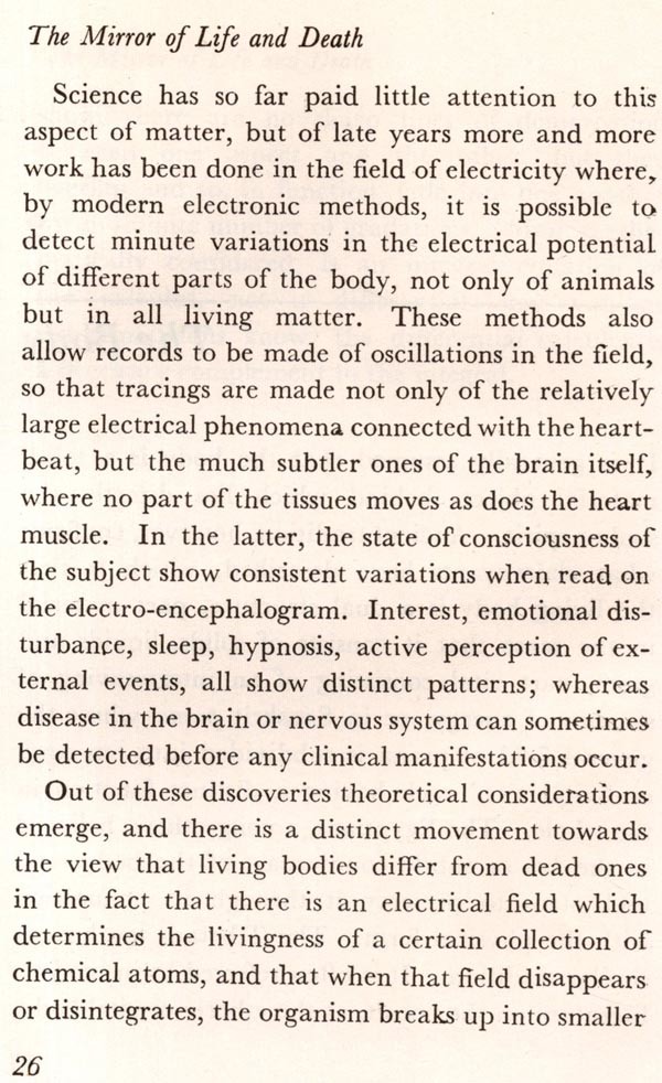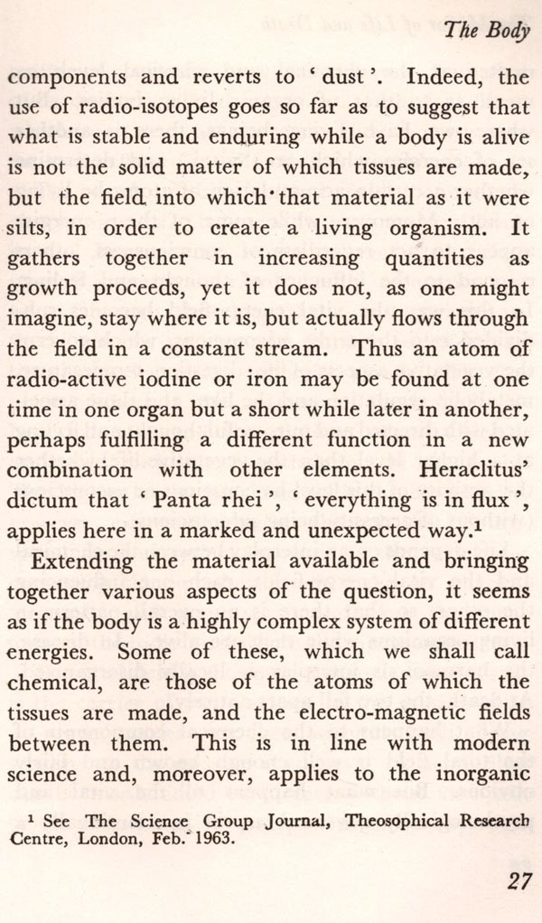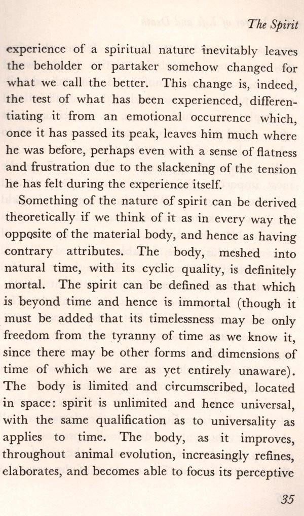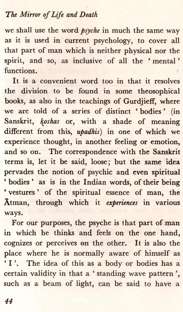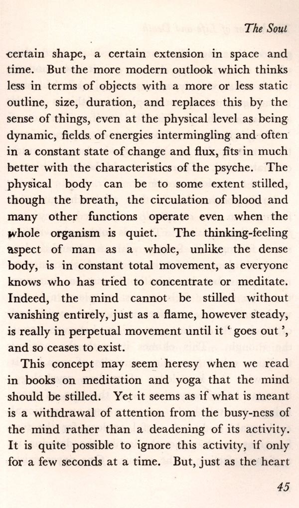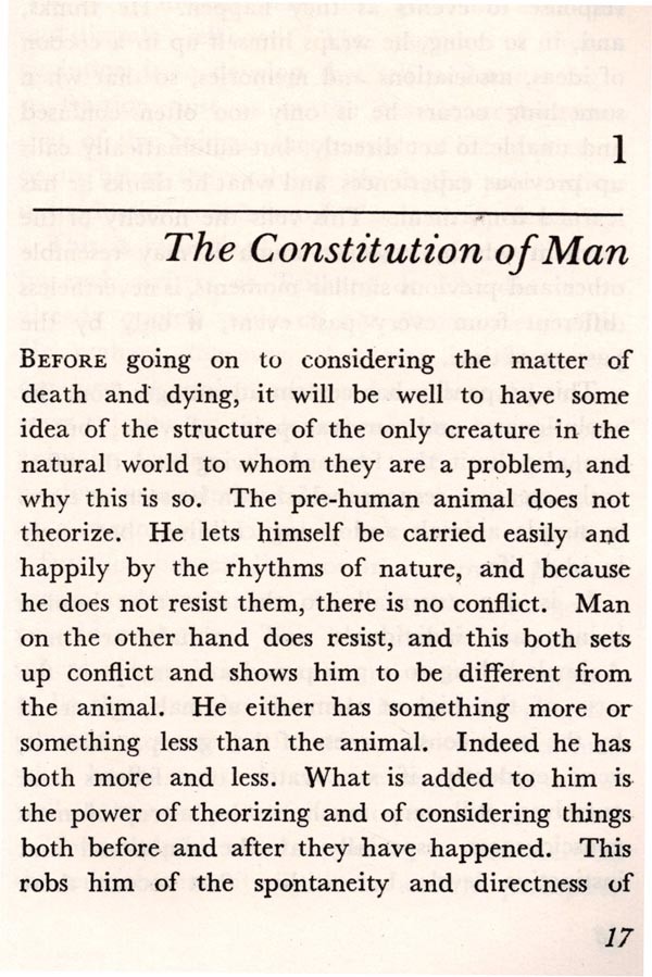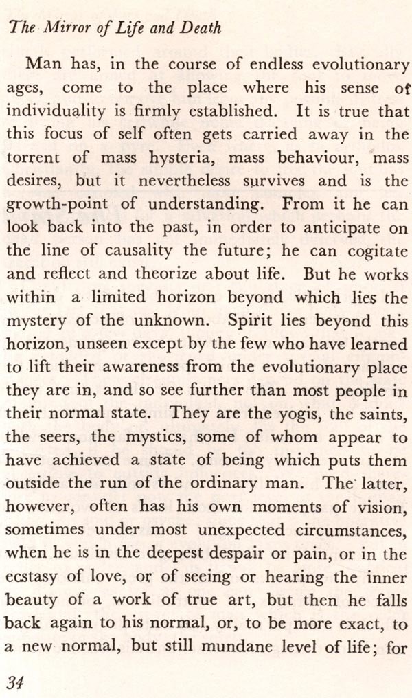 What shall be the nature of our existence after death? The answer is found in the answer to another question: what is the nature of our existence now?... The secrets of the unknown are hidden in the known. The Kingdom is at hand, and death is neither its entrance nor its exit, but only an event we have met before. THE background of the chapters which follow is contained in the quotation above, and still more in the article from which it is taken. It suggests that the basis of life is in timeless and universal Being, which becomes projected for evolutionary purposes into the space-time world of existence. Existence can only be significant when seen against its root in pure Being. Birth, growth, decay and death and, if the tradition be true, rebirth, are all part of a single process. They are, moreover, not separate parts, but each one co-exists all the time with the others, even when one aspect predominates. state The total process of existence is called evolution. In the words of Teilhard de Chardin it consists in the passage of Life from a primitive, 'Alpha' of minimal consciousness-better called preconsciousness to an Omega state where consciousness, as understood by man today, reaches its zenith, after which it passes over into a new phase which, in the perennial philosophy of man-kind, is often described as the extinction or void of Nirvana. Alpha, the first letter of the Greek alphabet is the beginning, Omega, the last letter, the end. Somewhere between them man appears, bringing with him the seed of individuality and of self-consciousness without which consciousness would not be able to differentiate itself from the massive yet vague and nebulous cloud of instinctive life, to become clear and focused as it must be in order to reach its conclusion.