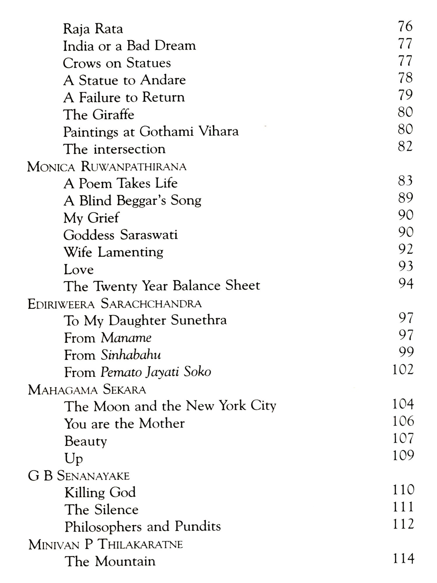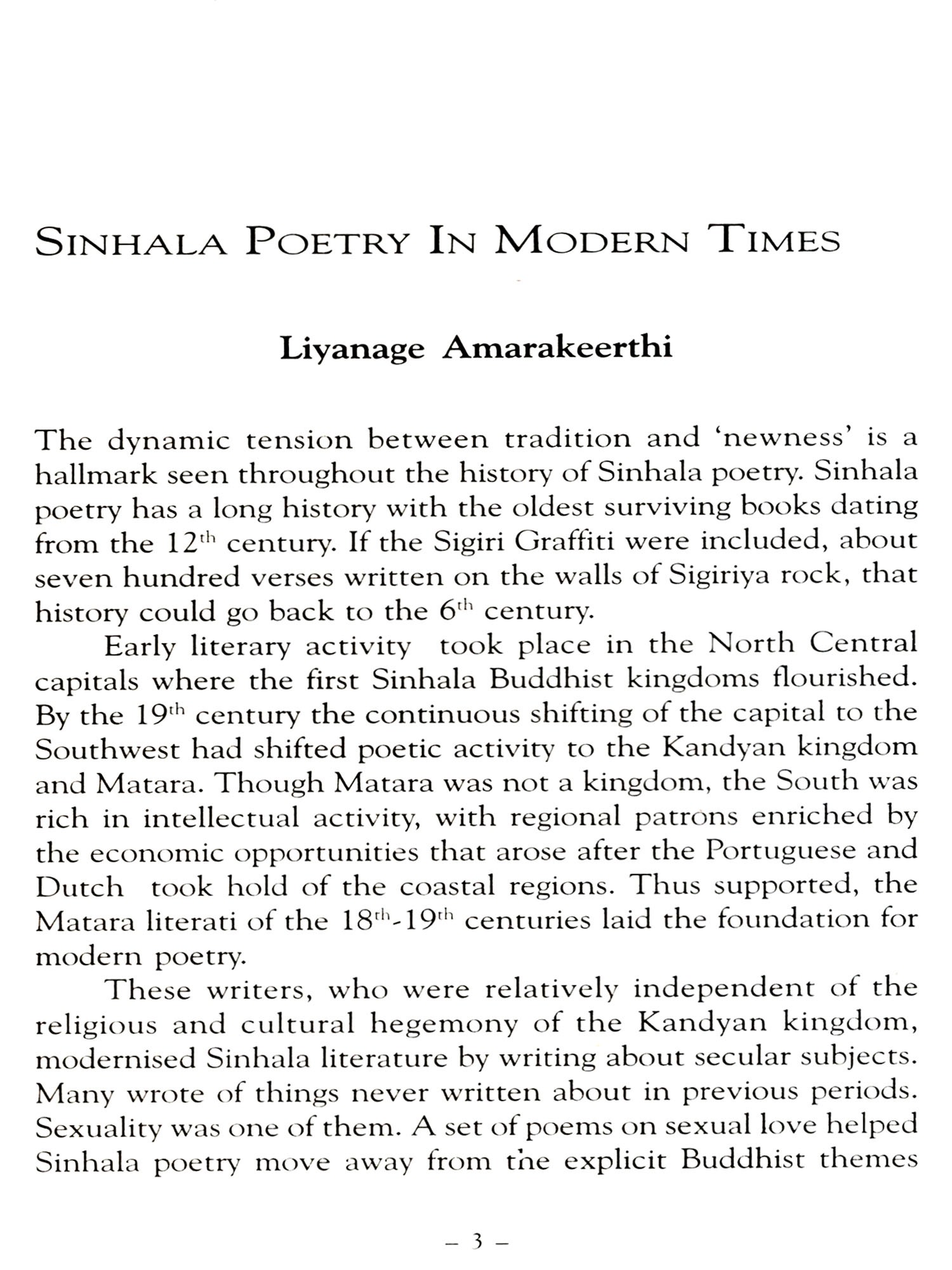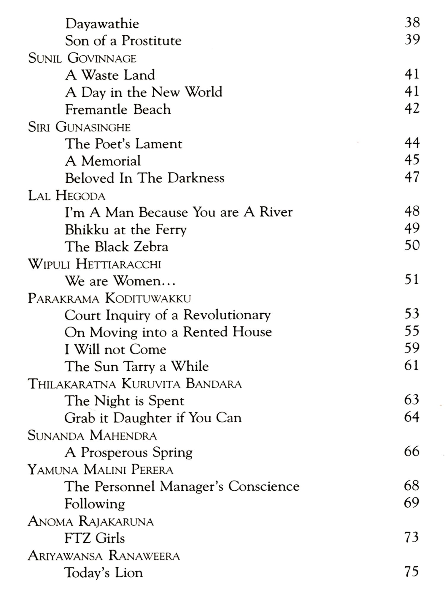 I am indebted too to all the others who provided translations, some specially commissioned for this book, in particular my colleagues at Sabaragamuwa University, Manoj Ariyaratne and Mahinda Pathirana. I should also mention the doyenne of translators, Ranjini Obeysekere, who responded promptly to my requests in the midst of other preoccupations whilst abroad. Needless to say, I am grateful too to all the poets, and the other translators, who so graciously gave me permission to use their work. Mr Godage of Godage Publishers and my old friend A T Dharmapriya require special mention, not least because the collection the latter produced for the former will provide a more comprehensive introduction to the field than this necessarily limited collection.